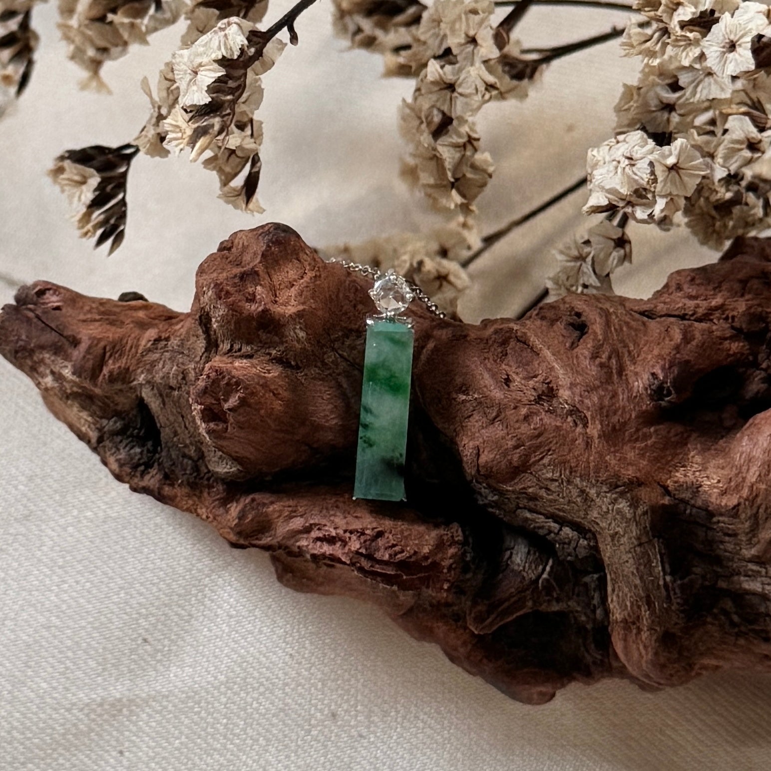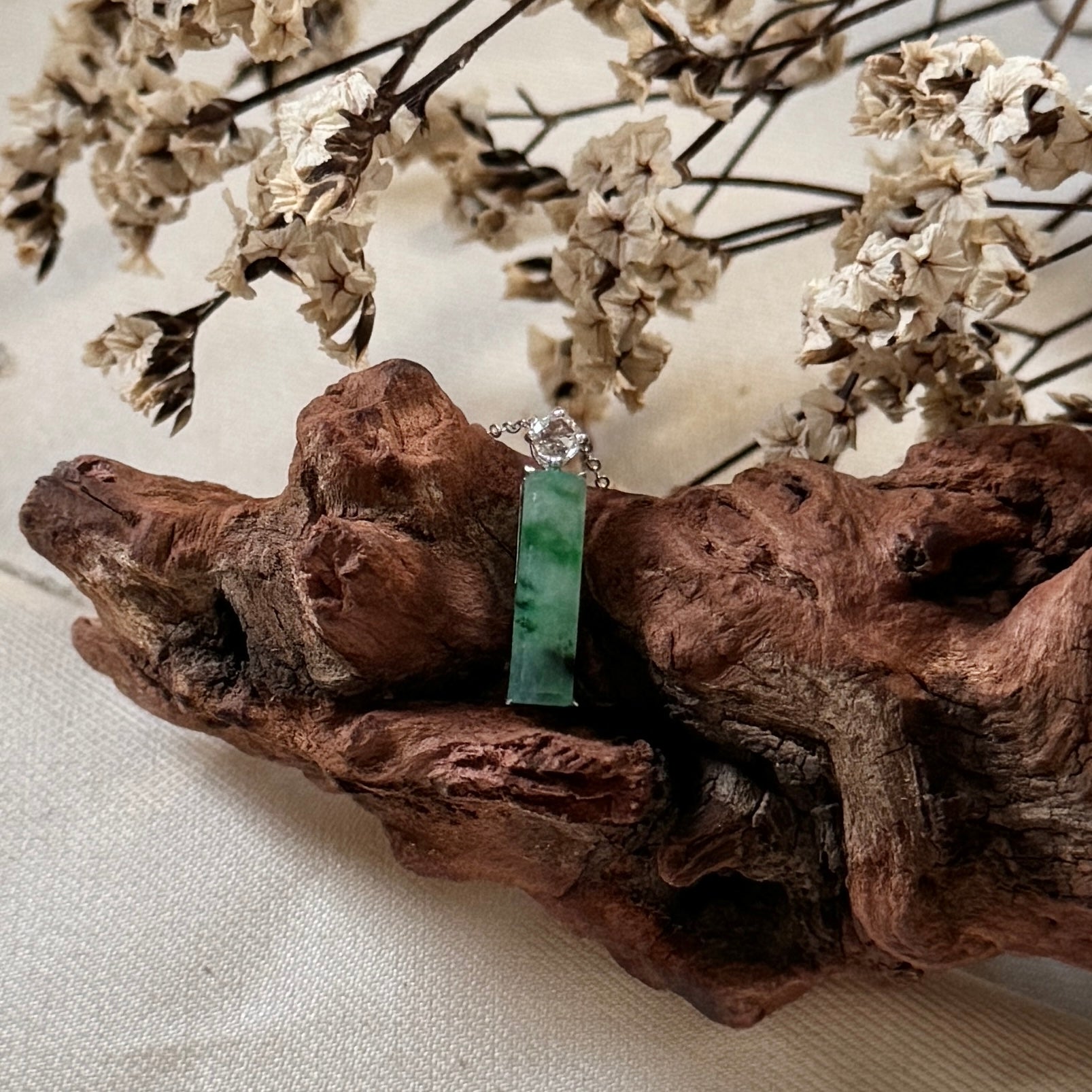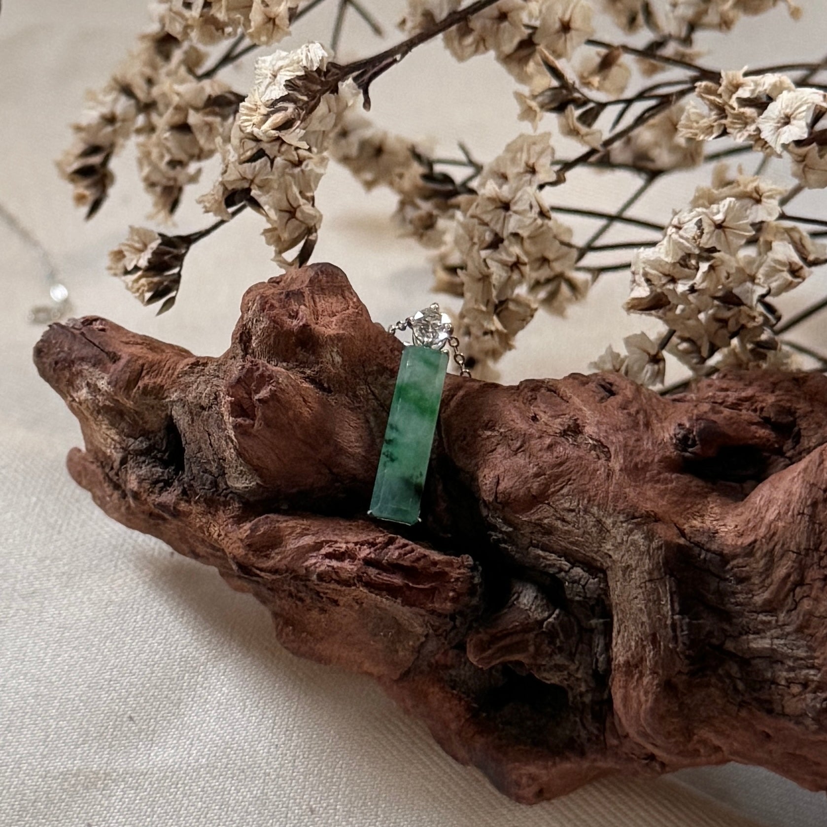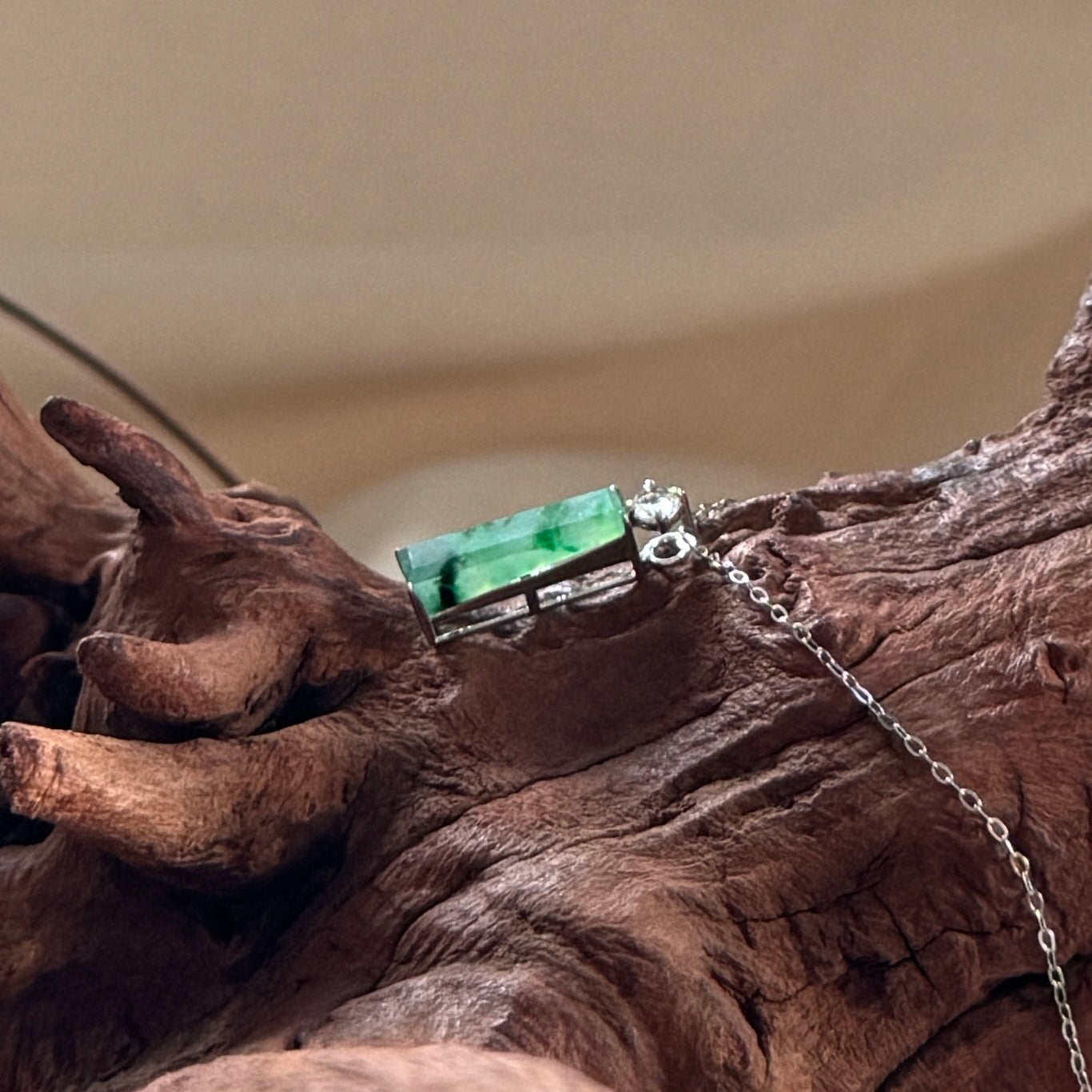Sleek and modern, the Alpine Pendant showcases a vivid green jadeite bar framed in 18k white gold. Accented with a sparkling white sapphire, this pendant exudes sophistication and timeless elegance. Perfect for those seeking a statement piece that balances boldness with refinement.