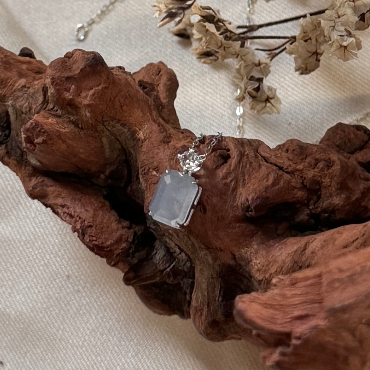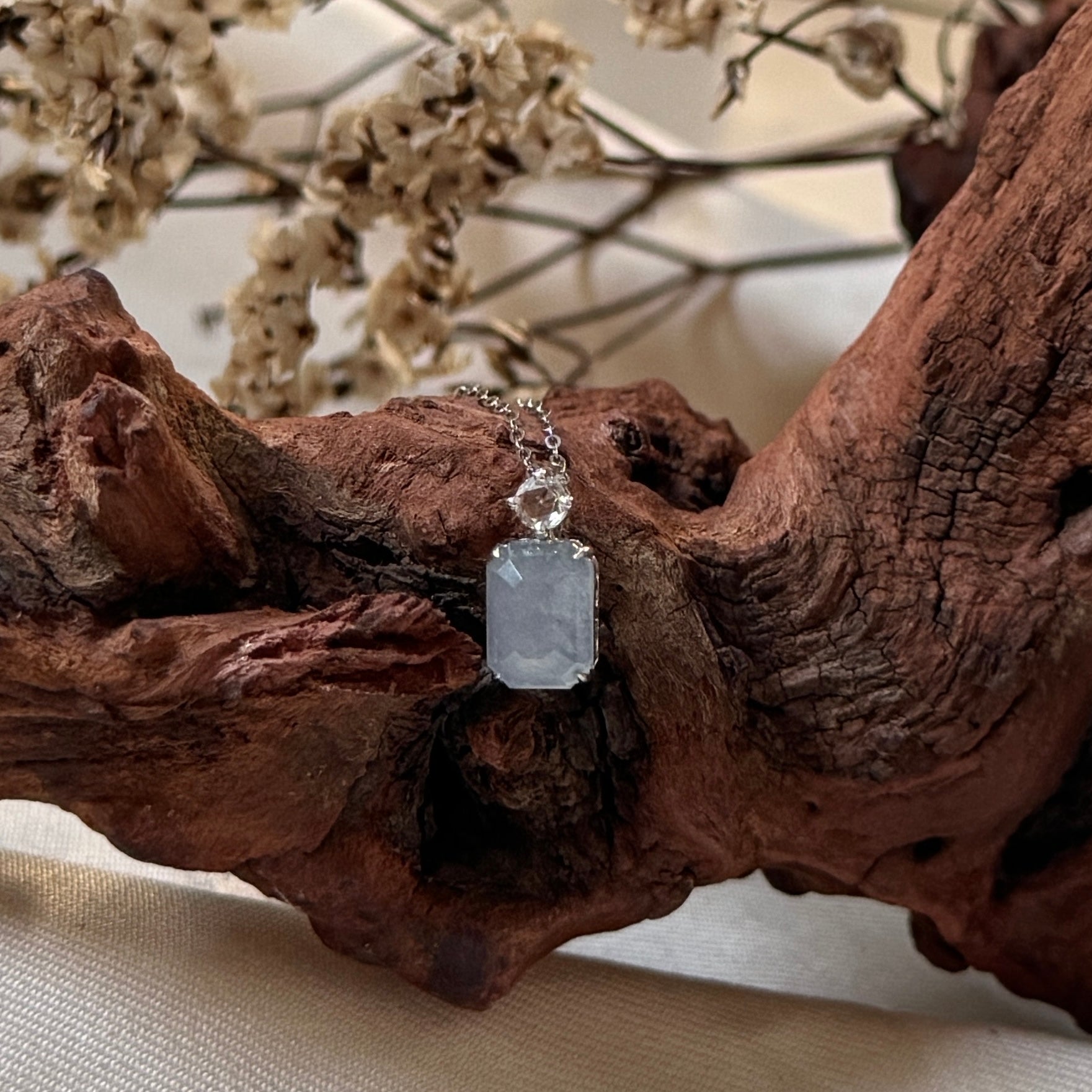 Delicately elegant, the Atria Pendant features a light lavender jadeite stone framed in 18k white gold. Accented with a brilliant white sapphire, this pendant captures a perfect balance of softness and sophistication. Designed to complement any look, it’s a refined piece that exudes timeless beauty and charm.
