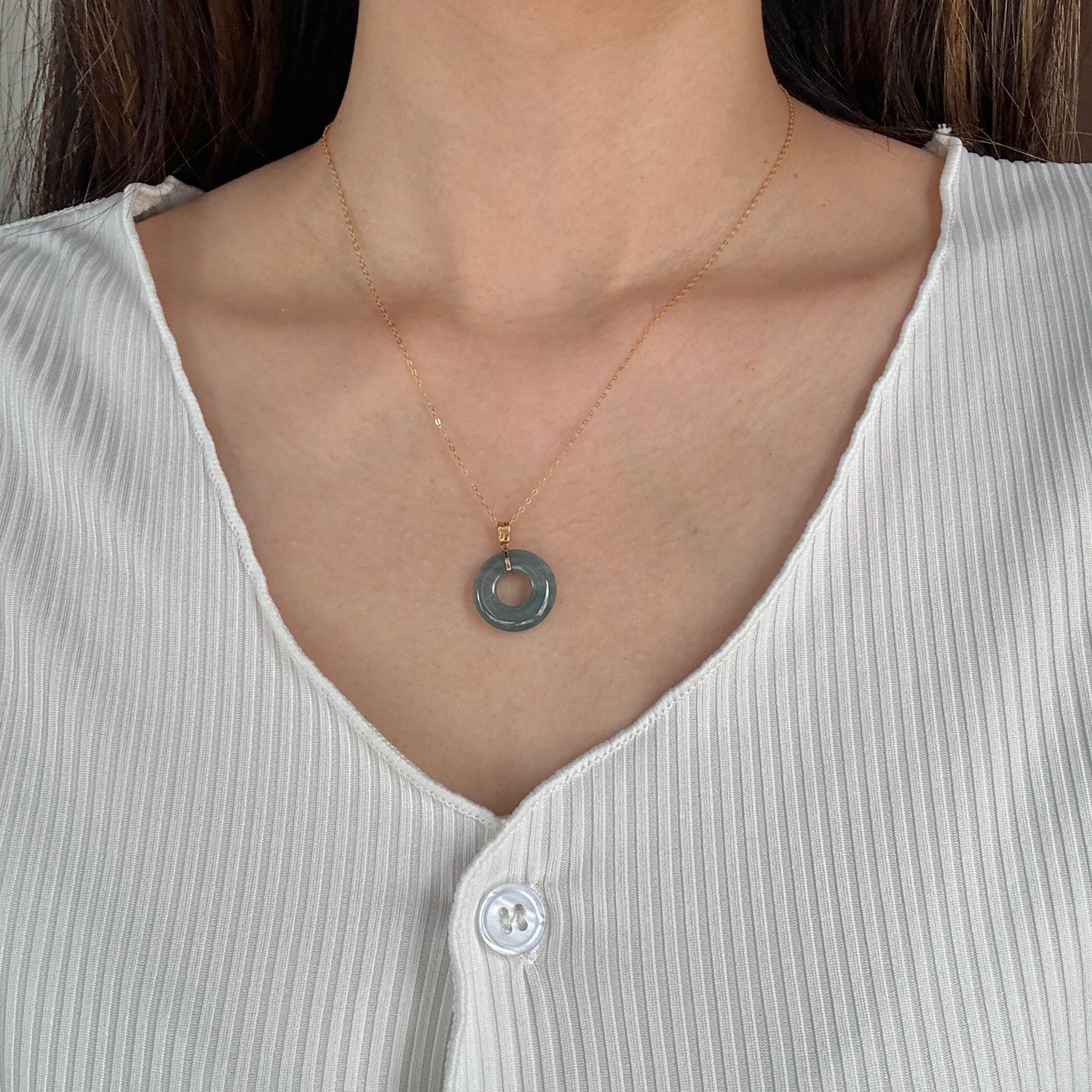 This luxurious piece features a stunning, finely polished jadeite bagel, in a vibrant sweet blue hue, symbolising growth, renewal, and prosperity. The jadeite is meticulously set with an 18K gold bail that enhances its natural beauty, offering a timeless blend of sophistication and modernity. Perfect for any occasion, this pendant not only complements any outfit but also brings a touch of serenity and grace to your style.