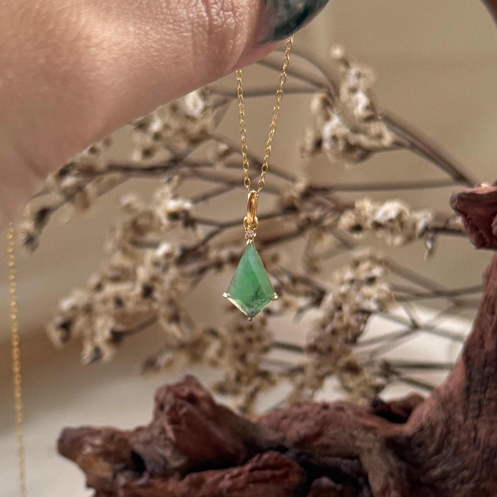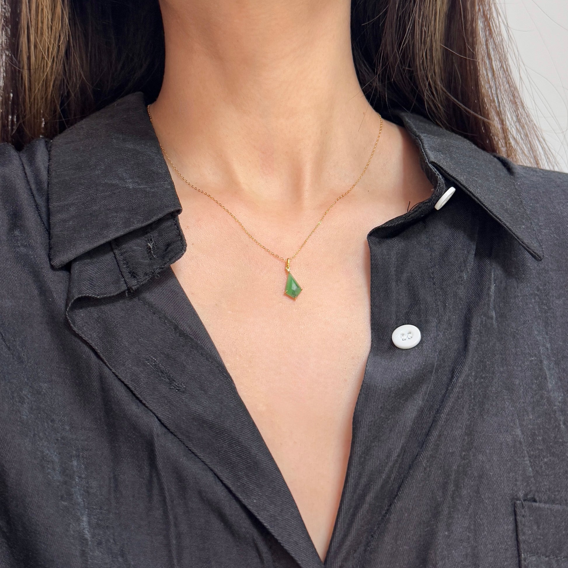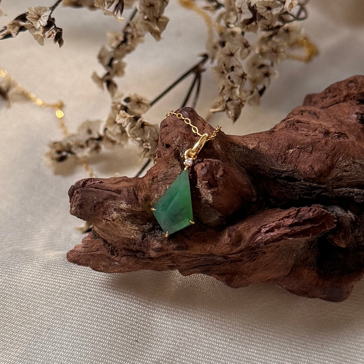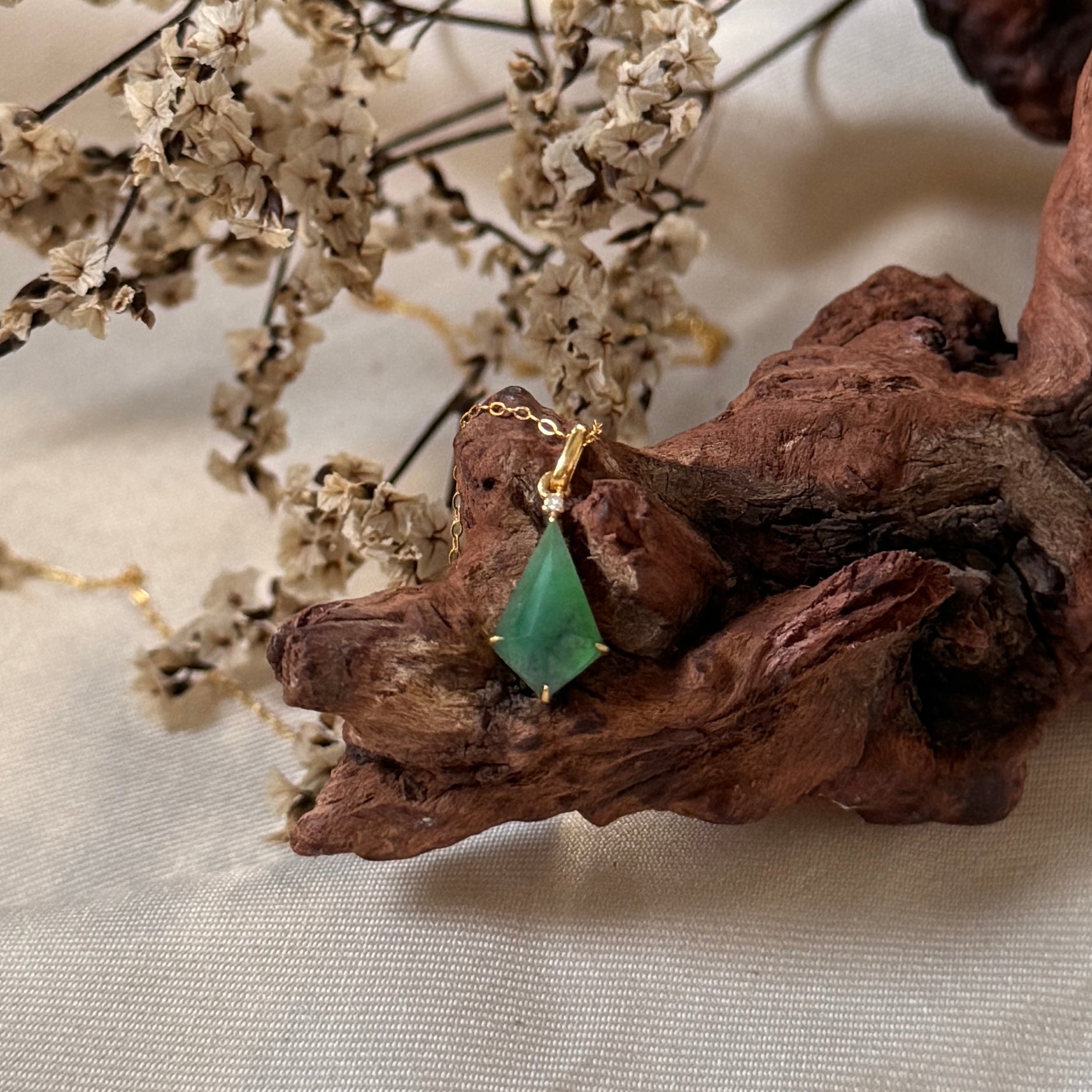 Inspired by the meeting of earth and sky, the Horizon Pendant features a striking kite-cut jadeite stone in a rich green hue with a wisp of grey. Set in 18k gold and accented with a delicate diamond, this pendant embodies a sense of balance and elegance. A versatile piece that transitions effortlessly from day to night, it’s a timeless addition to your collection.