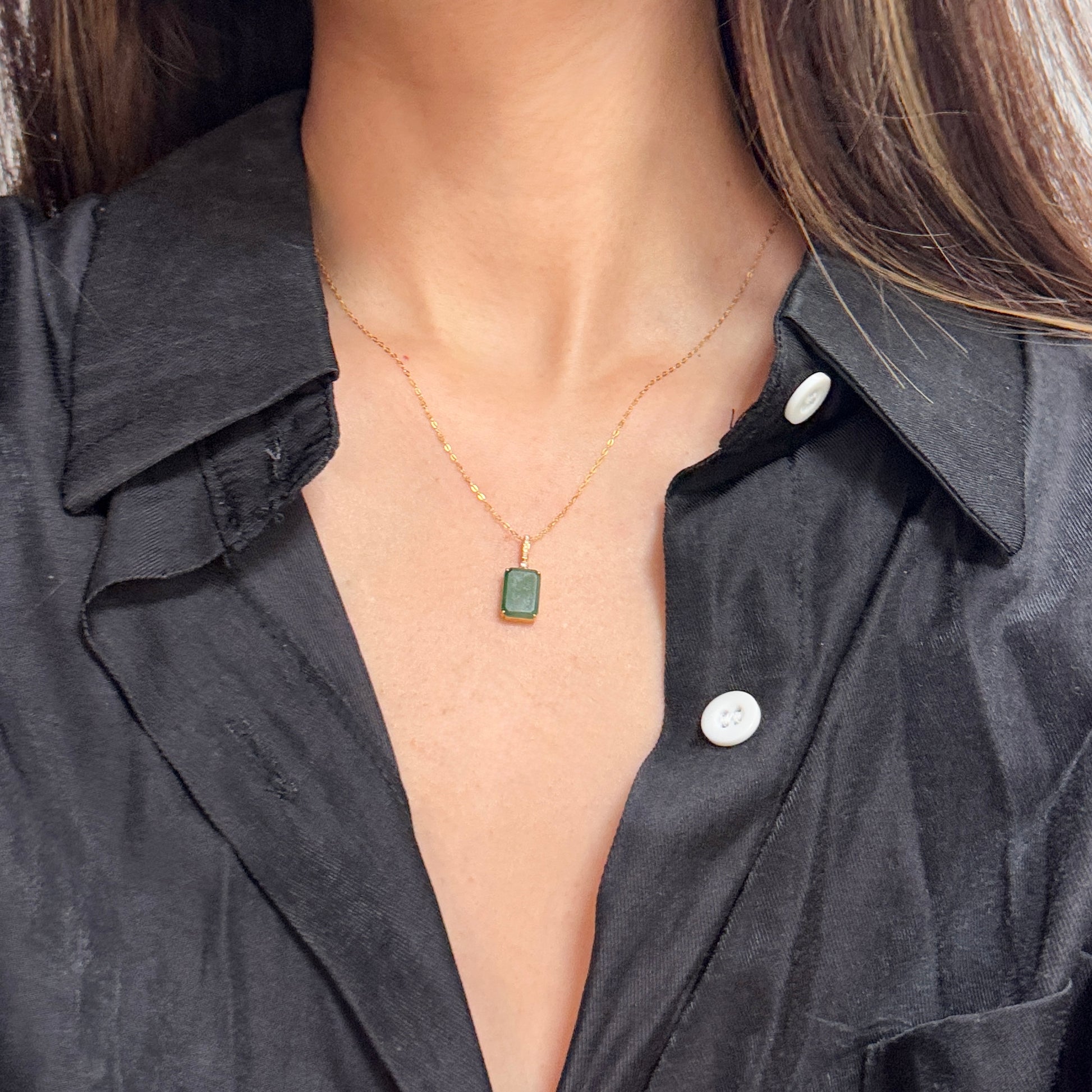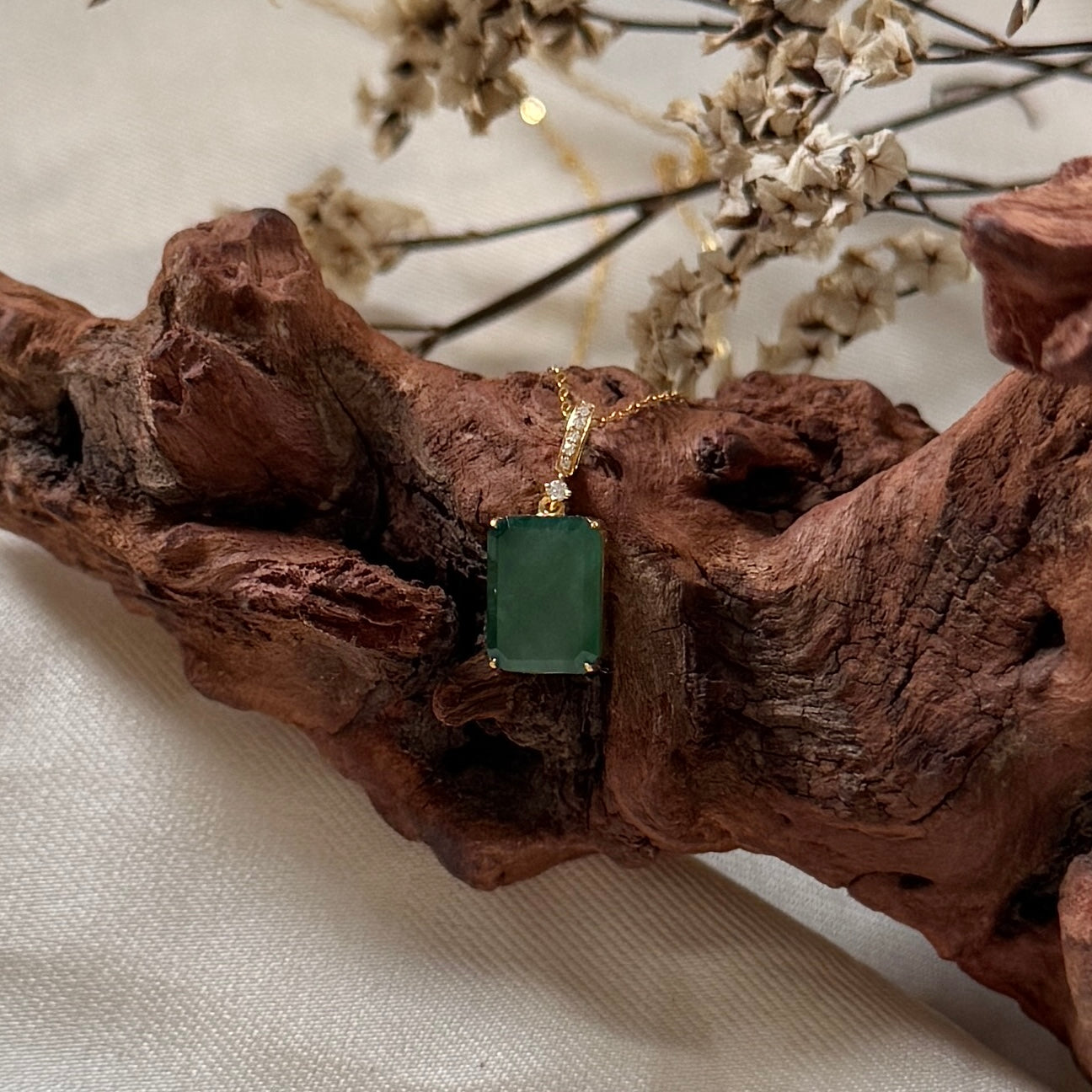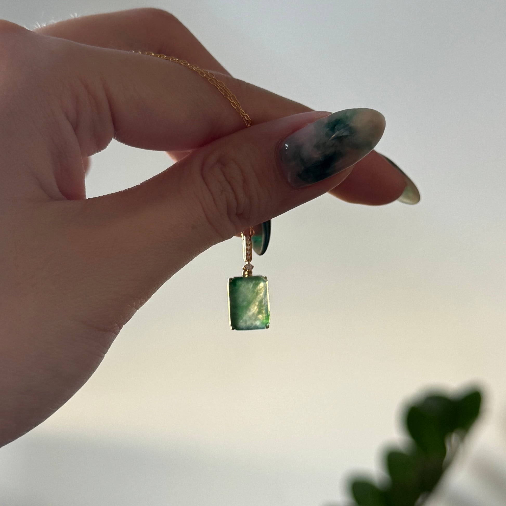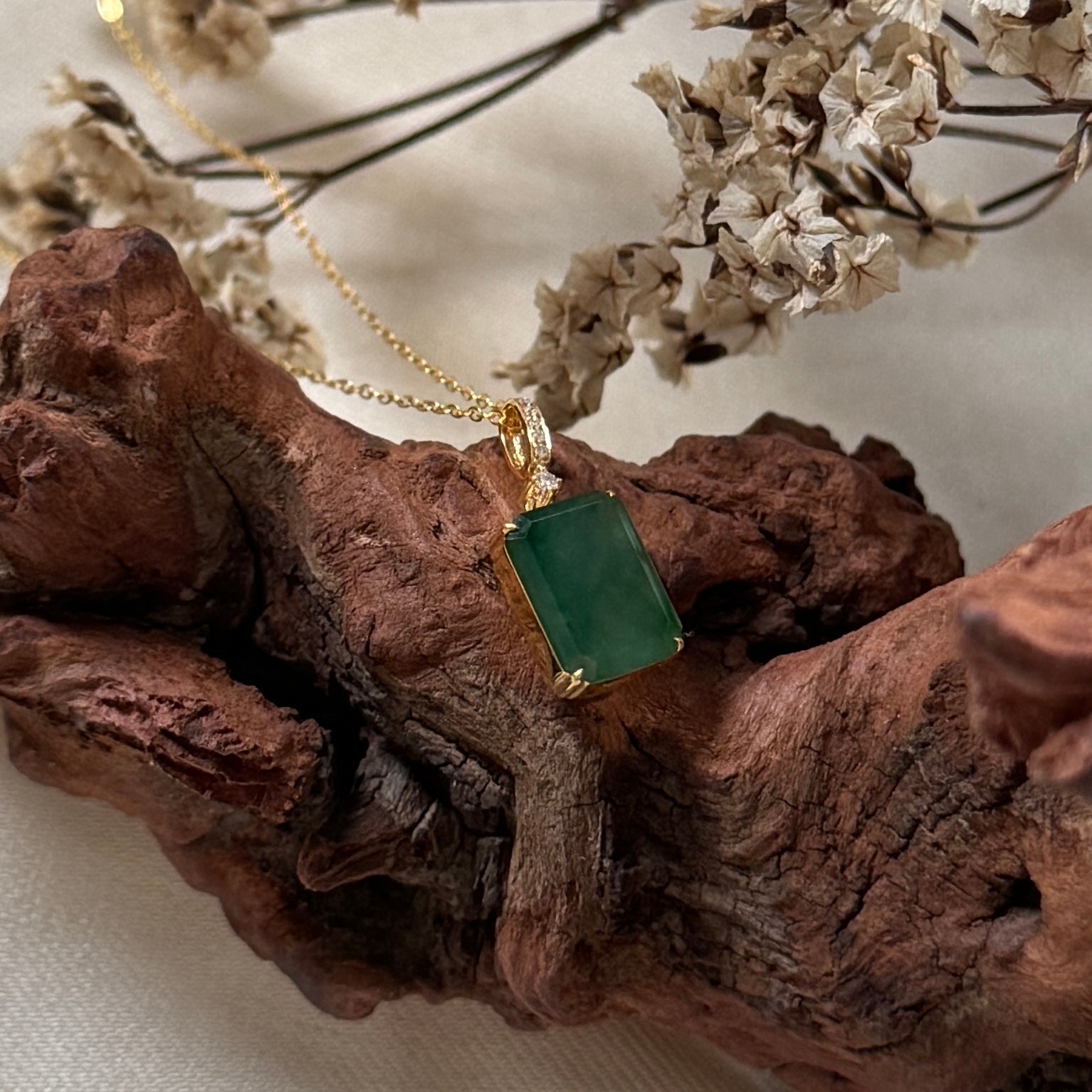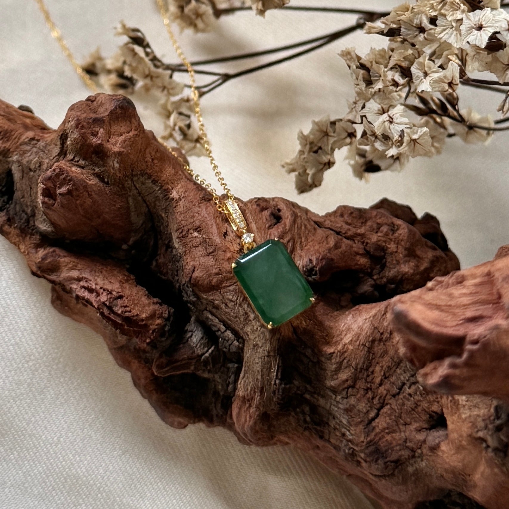 The Serene Pendant captures the essence of tranquillity and elegance. Featuring a rich green jadeite gem in a classic emerald cut, this piece is elevated by a delicate diamond-accented 18k gold bail. Perfect for adding a timeless touch to your jewellery collection, it’s a symbol of calm and enduring beauty.