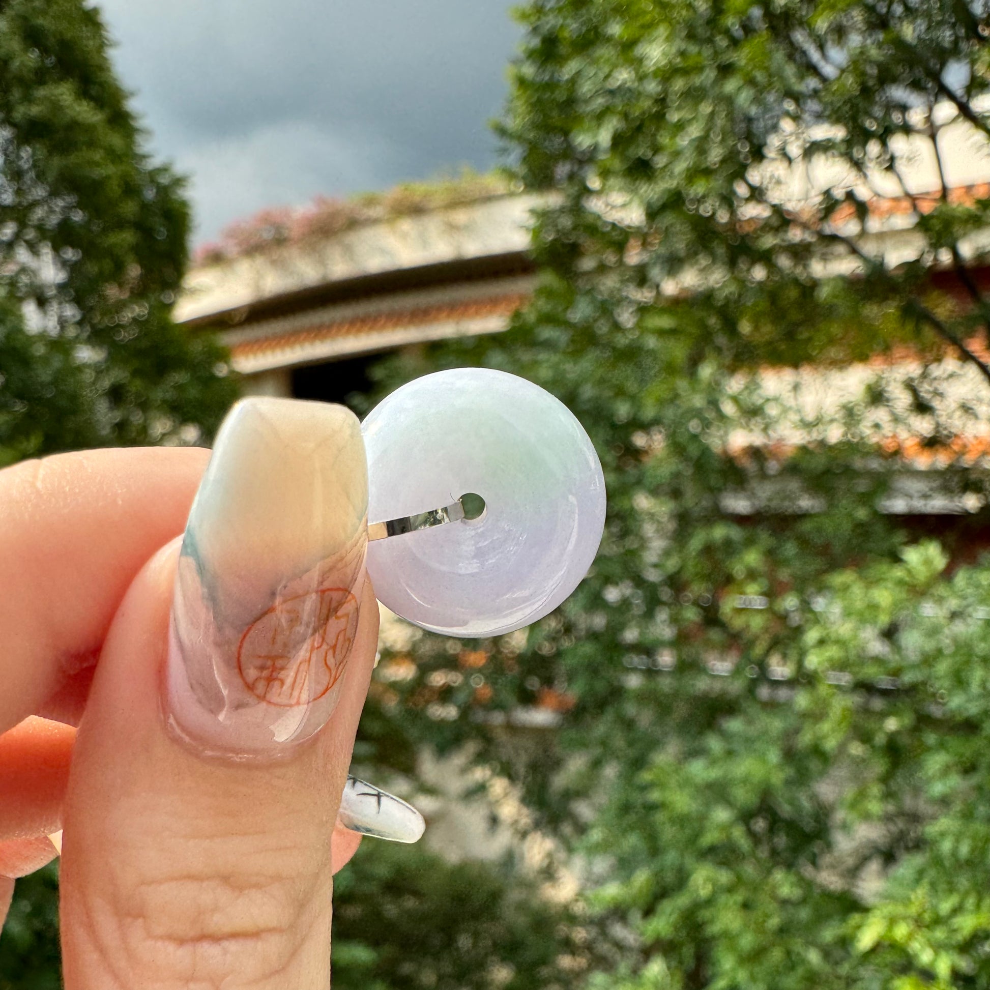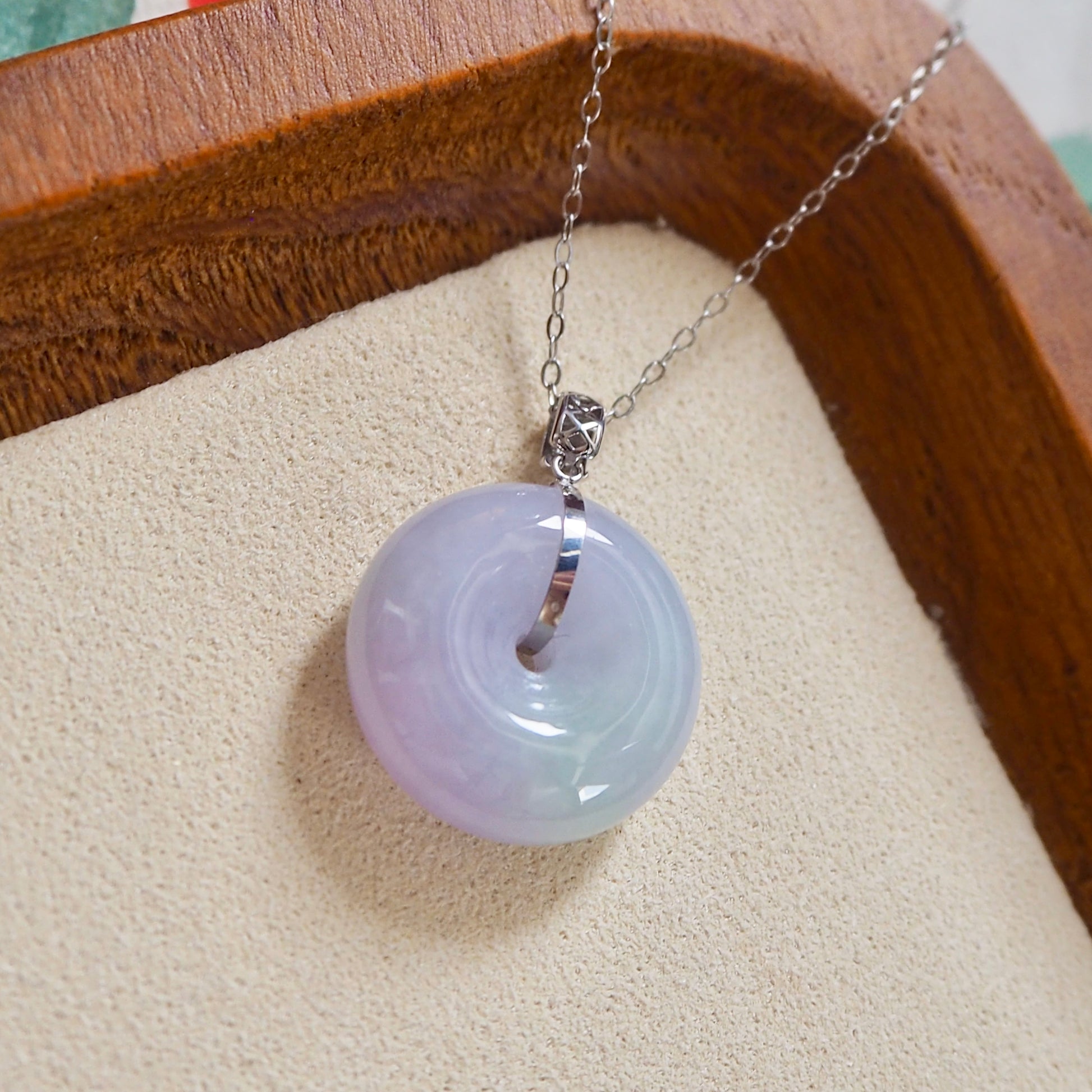 This stunning piece features fine grained lavender and apple green jadeite carved into the traditional 平安扣 shape. It symbolises peace and protection, making it a meaningful addition to any jewellery collection. The jade is set in luxurious 18K Gold, enhancing its natural beauty and sophistication. Perfect for daily wear, this pendant adds a touch of timeless grace to any ensemble. Experience the blend of cultural significance and timeless elegance with this pendant.