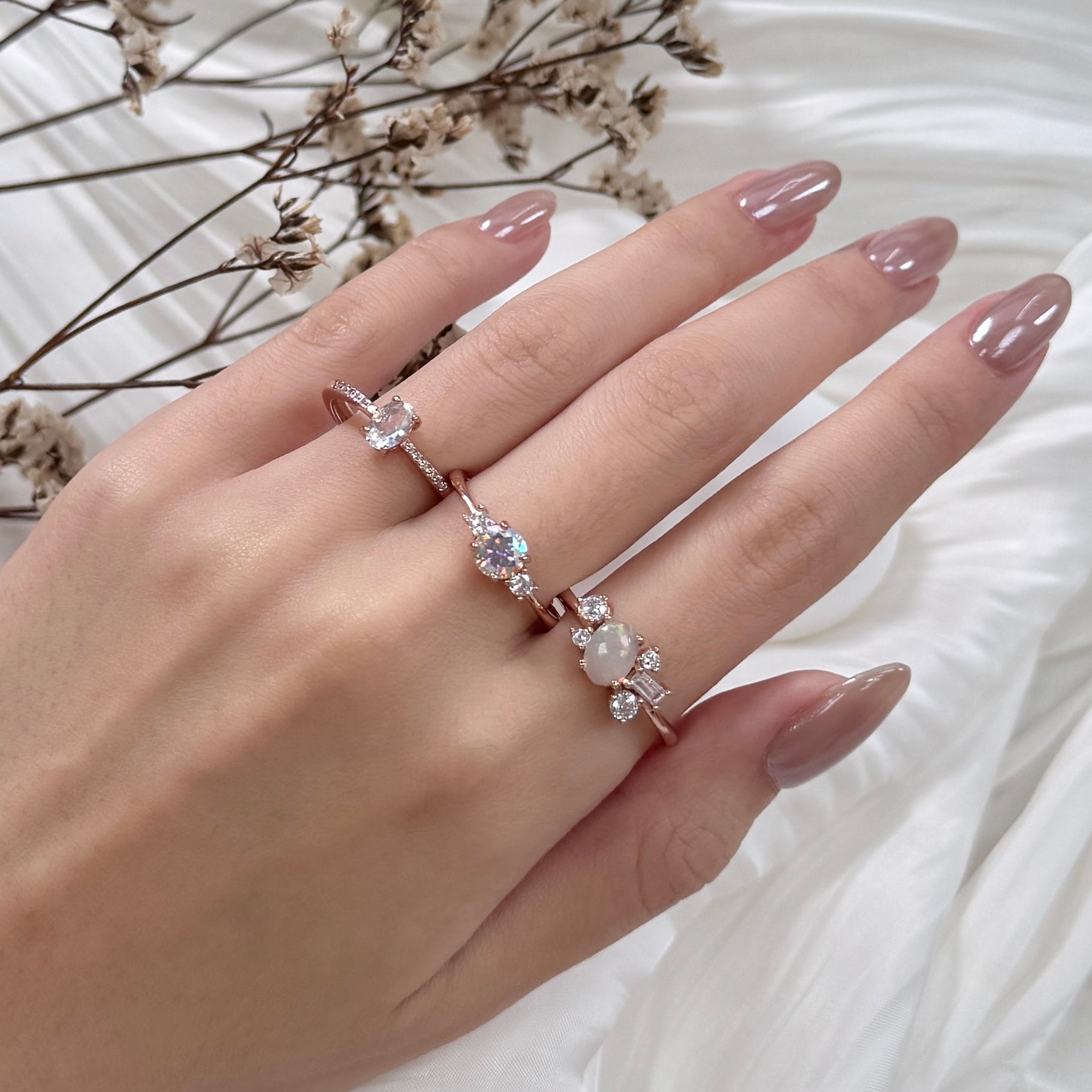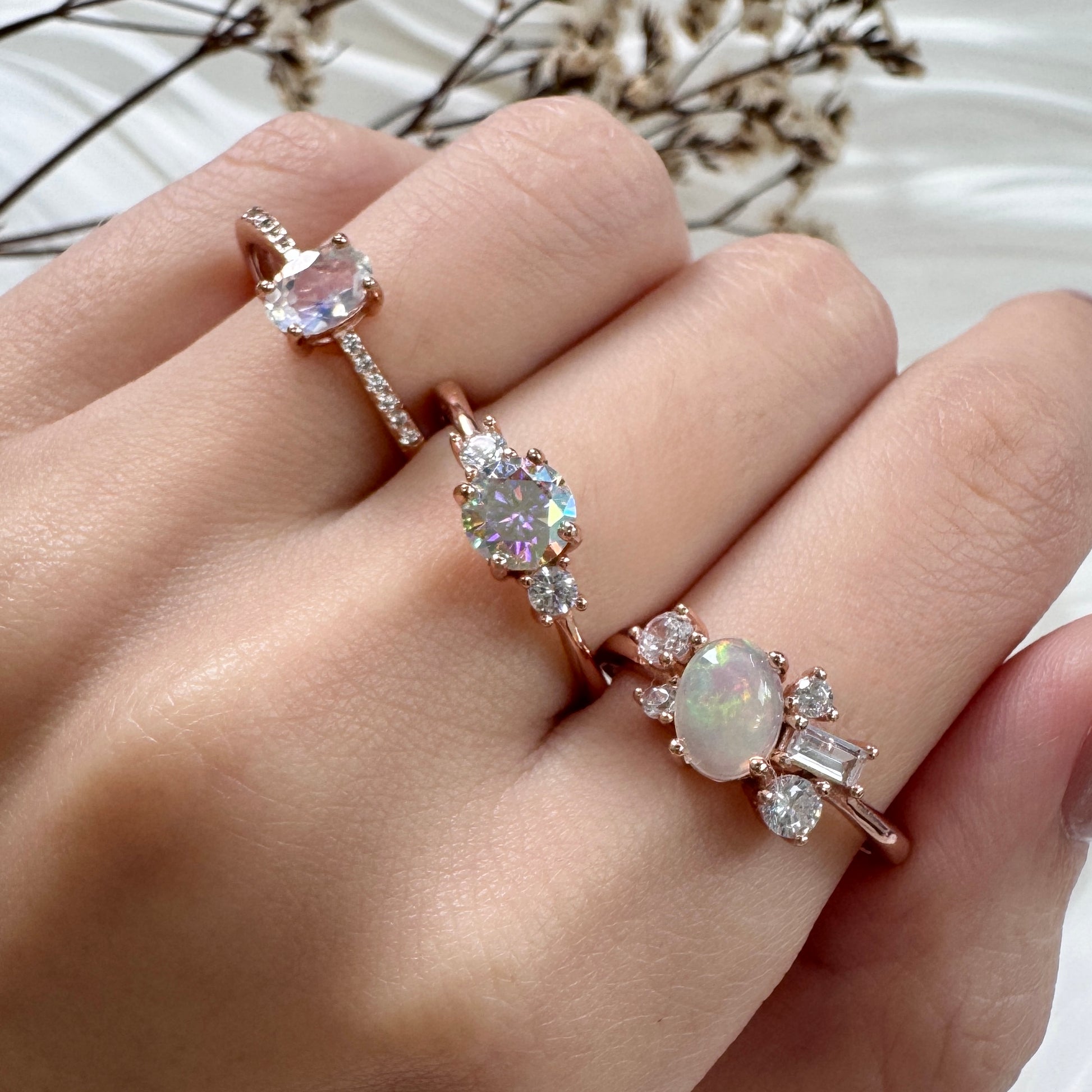 A celestial harmony of opal, moissanite, and moonstone, glowing with gentle radiance.