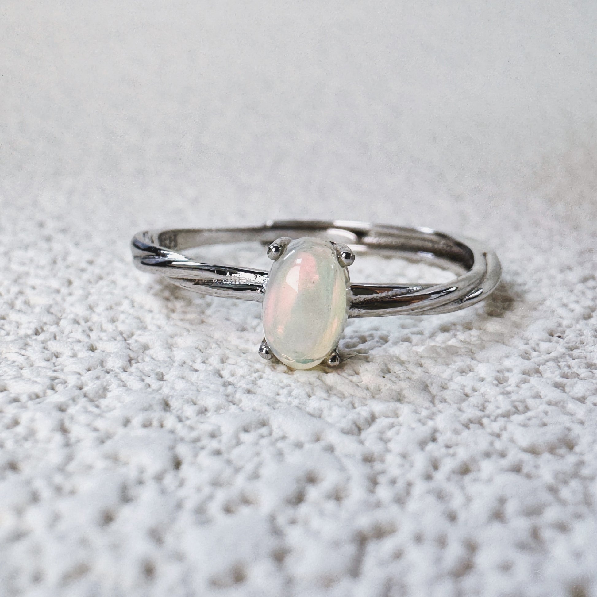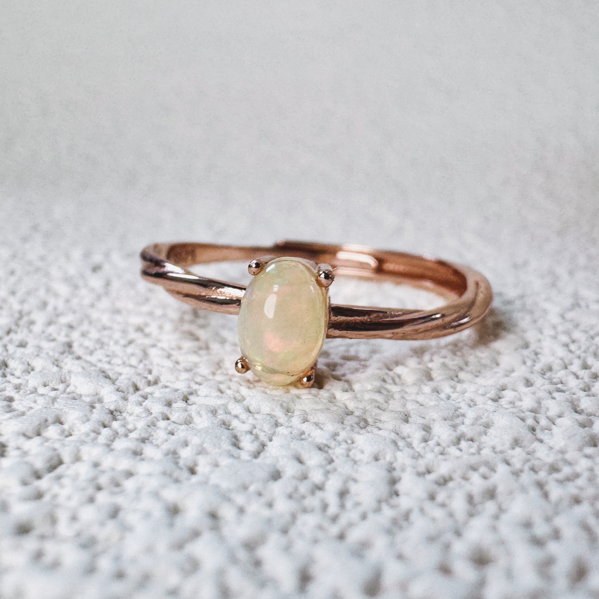 The Ophelia Opal Ring captures the ethereal beauty of opals, showcasing an enchanting oval-cut opal that shimmers with a soft play of colors, from warm pinks to glowing greens. Each opal is set in a choice of either warm rose gold or cool sterling silver, with a gently twisted band design that adds a touch of organic elegance to the piece.