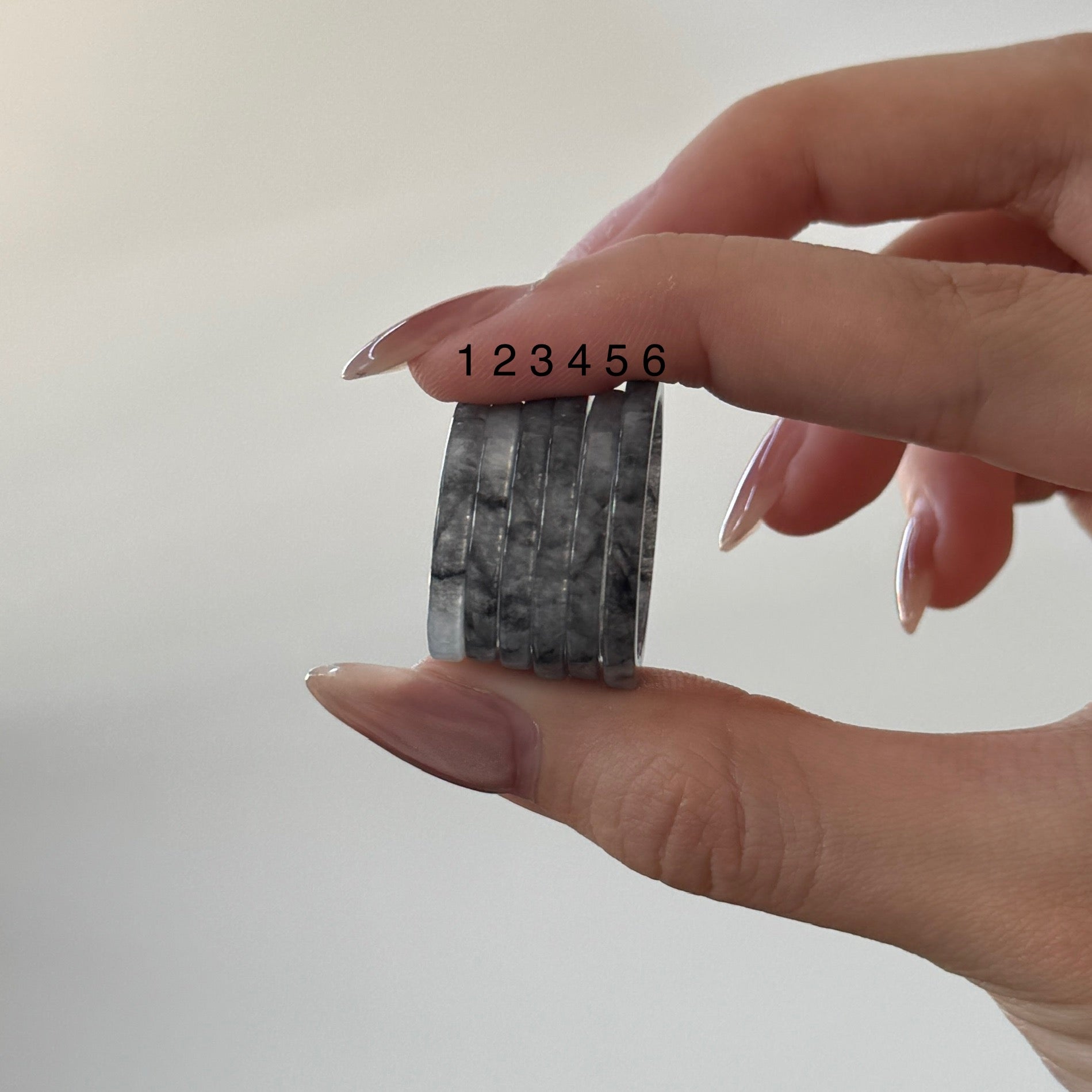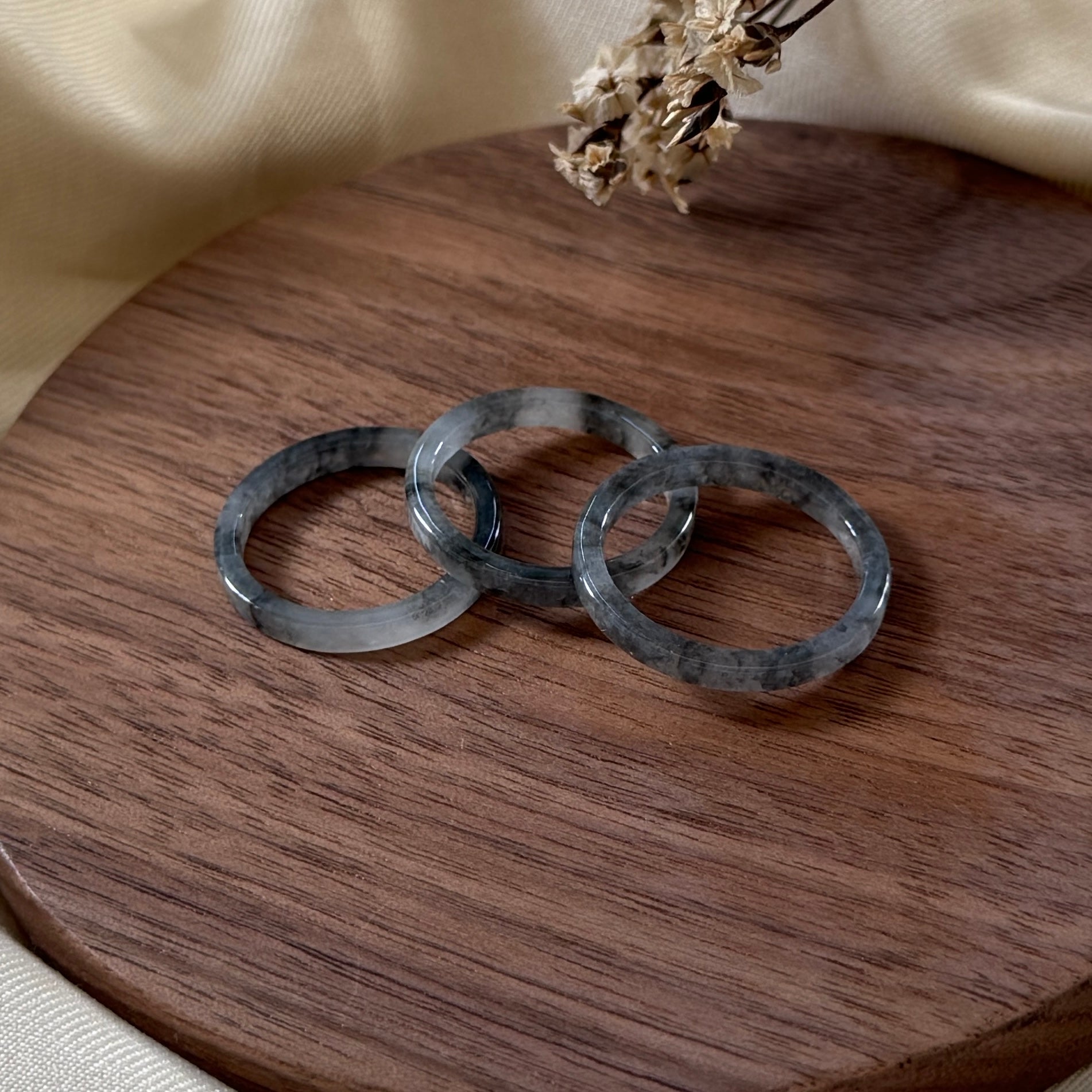 Polished jadeite in a slim, squared form - the Ashline Ring blends grey translucence with dark, cloudy inclusions for a subtle, smoky effect.