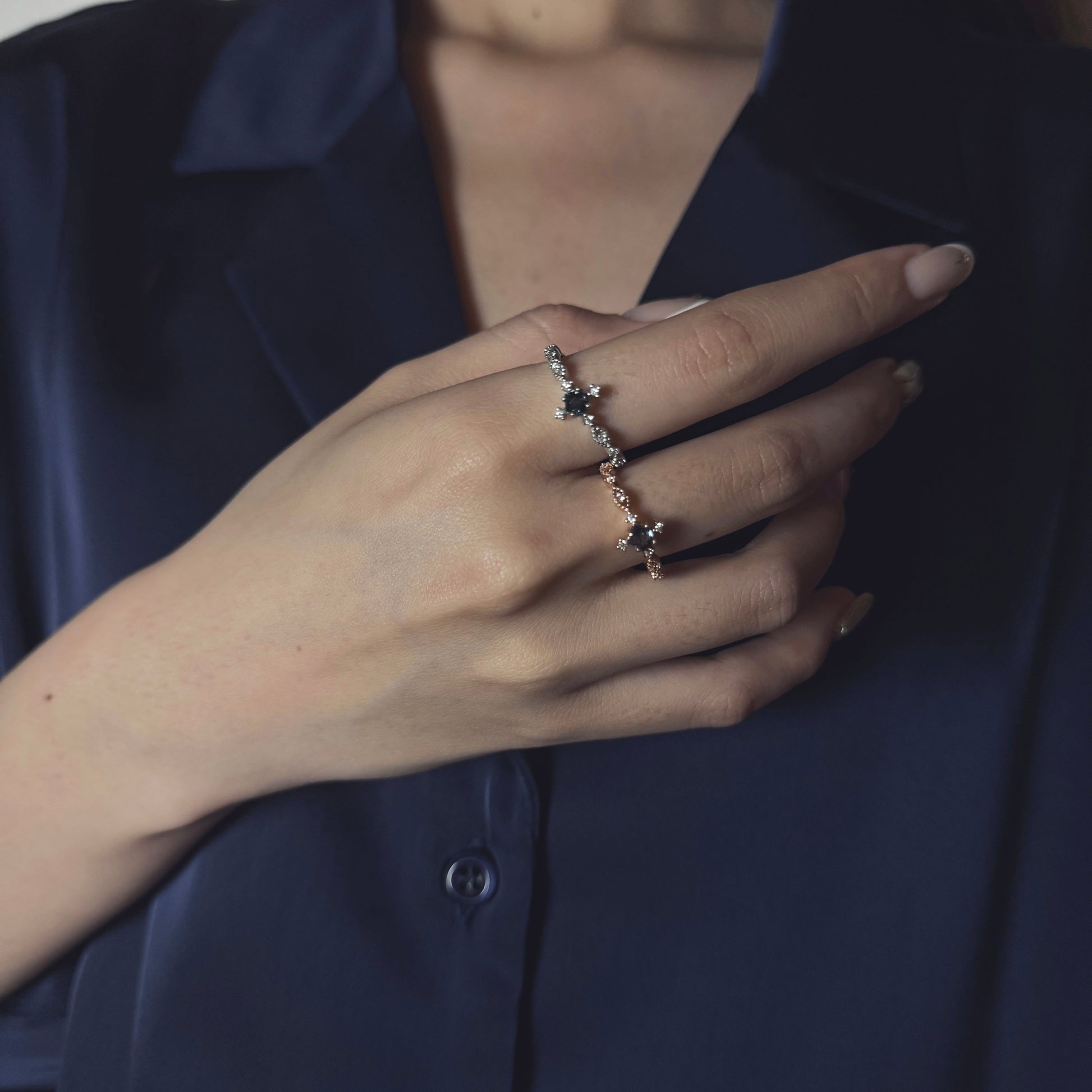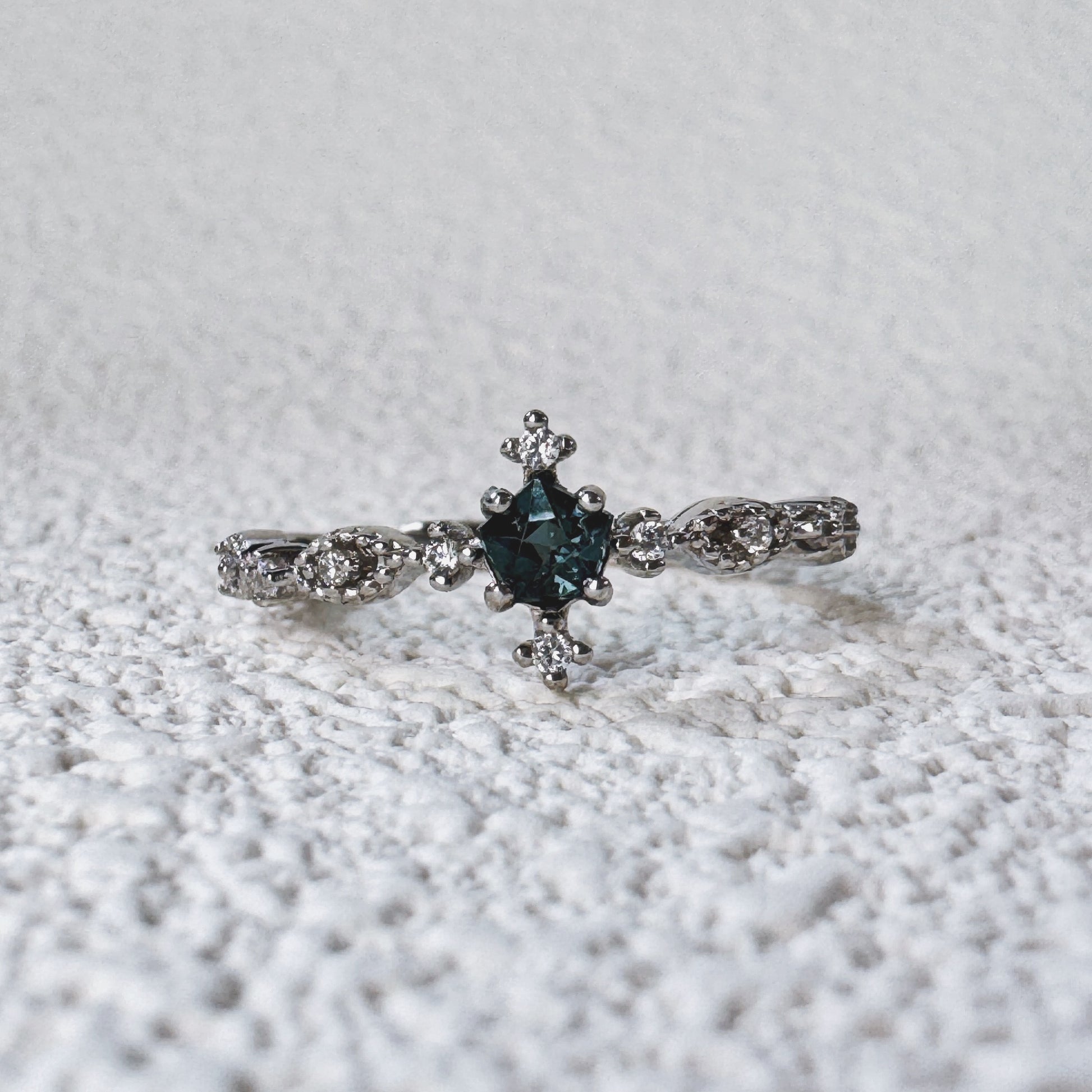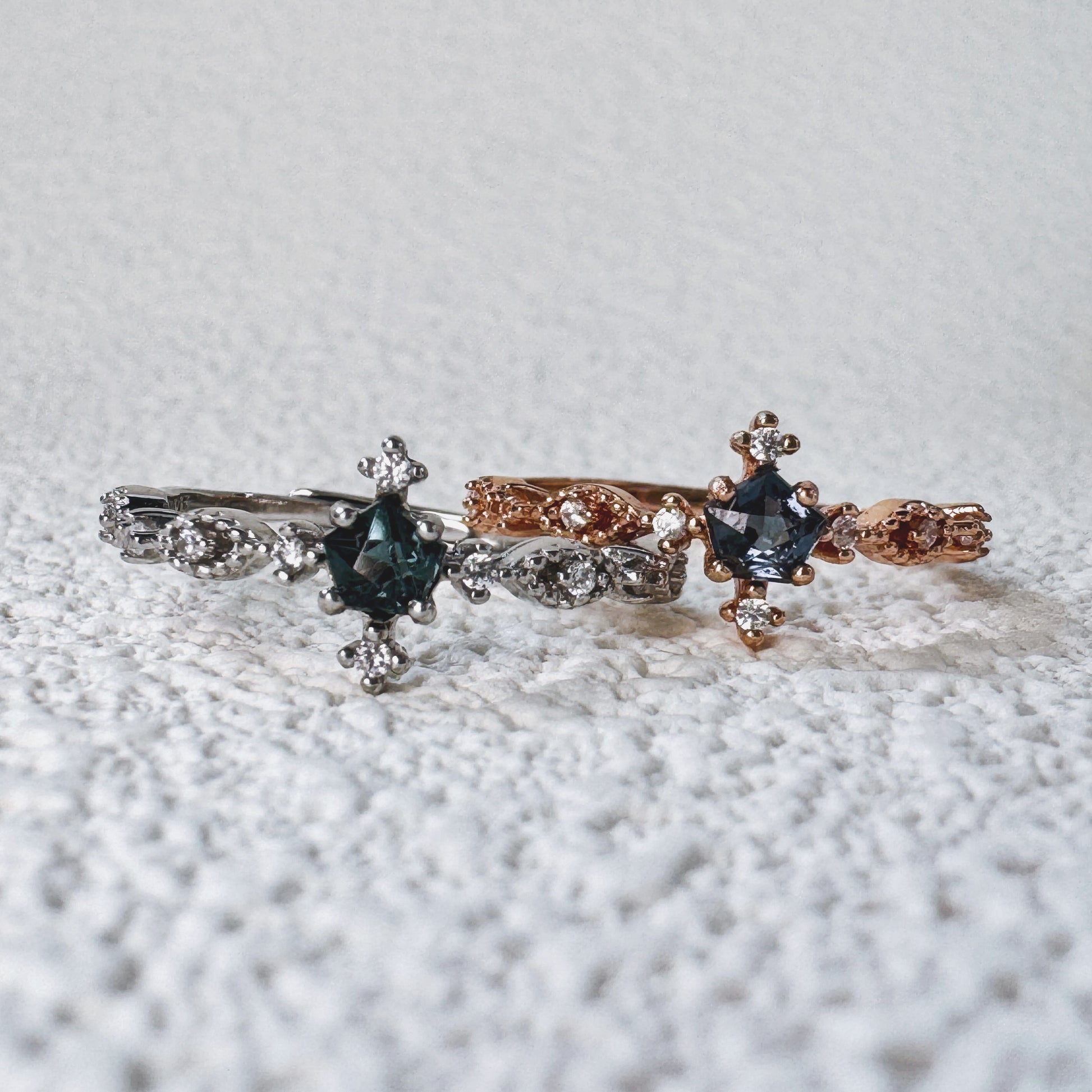 The Astrid Star Spinel Ring is a celestial-inspired masterpiece, featuring a stunning kite-cut spinel gemstone at its center. Available in deep midnight grey blue or dark teal hues, each spinel is surrounded by shimmering accent stones that evoke the sparkle of distant stars. The intricate band, offered in either sterling silver or warm rose gold, is designed with elegant detailing, adding a touch of timeless charm to the ring.