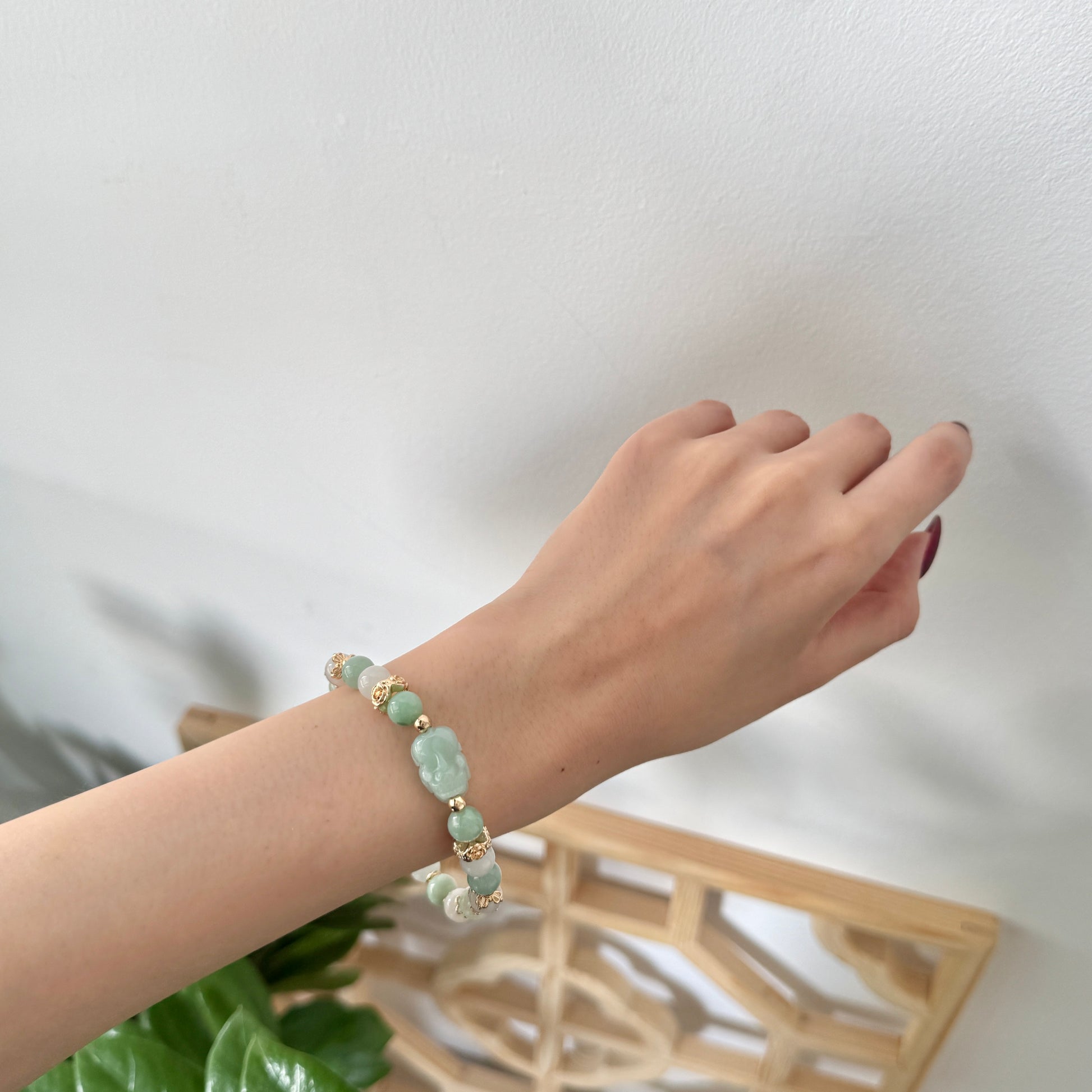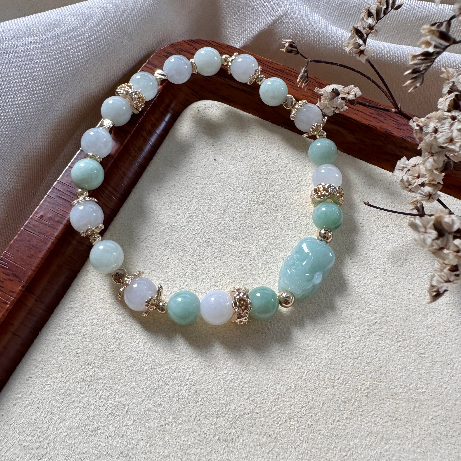 Gentle in tone yet rich in symbolism, the Aveline Bracelet features a hand-carved mint green jadeite Pixiu — a traditional emblem of abundance and protection. Paired with pastel jadeite beads and intricate gold-toned floral accents, this piece carries a graceful femininity while offering grounding energy. Aveline is a quiet charm for those embracing prosperity with elegance.