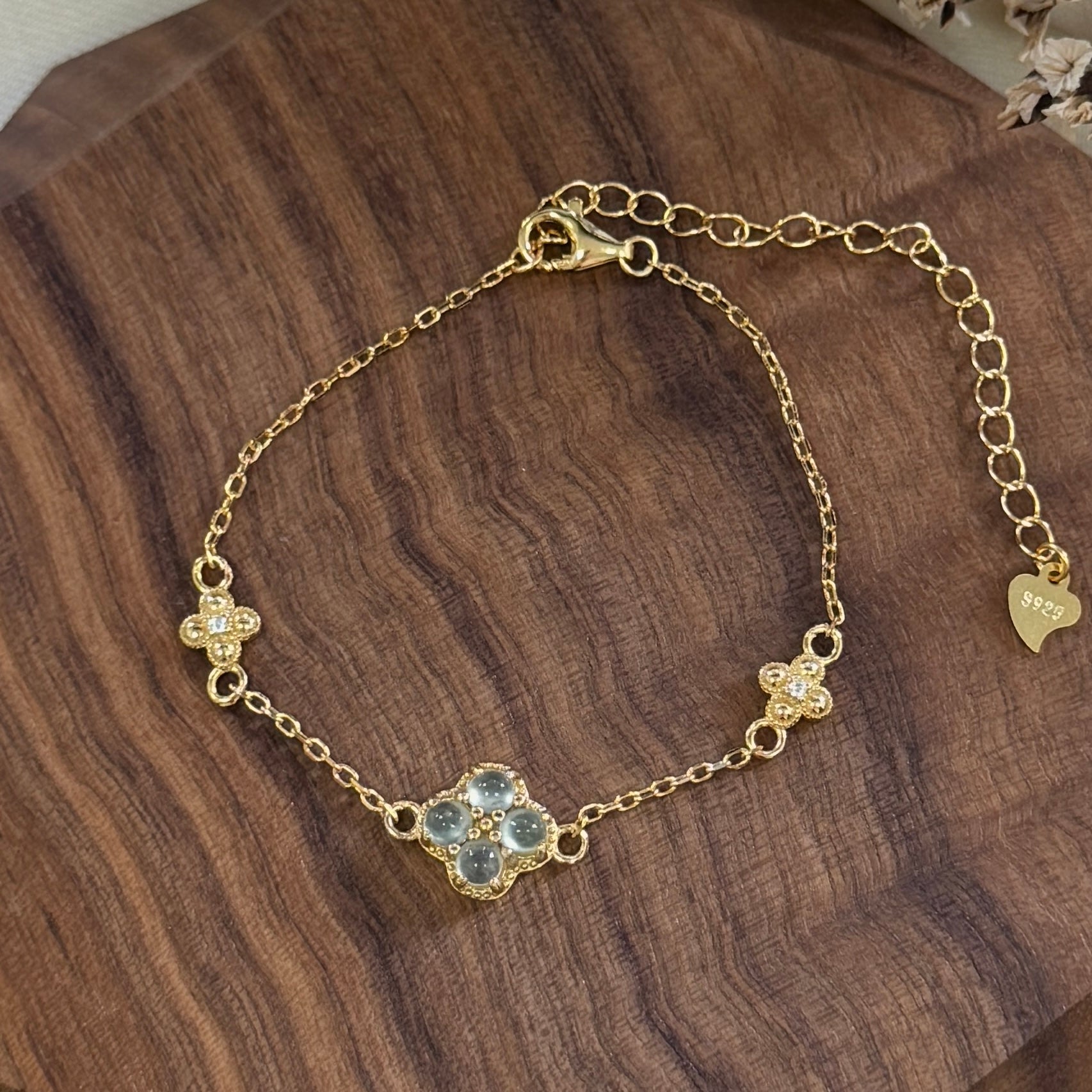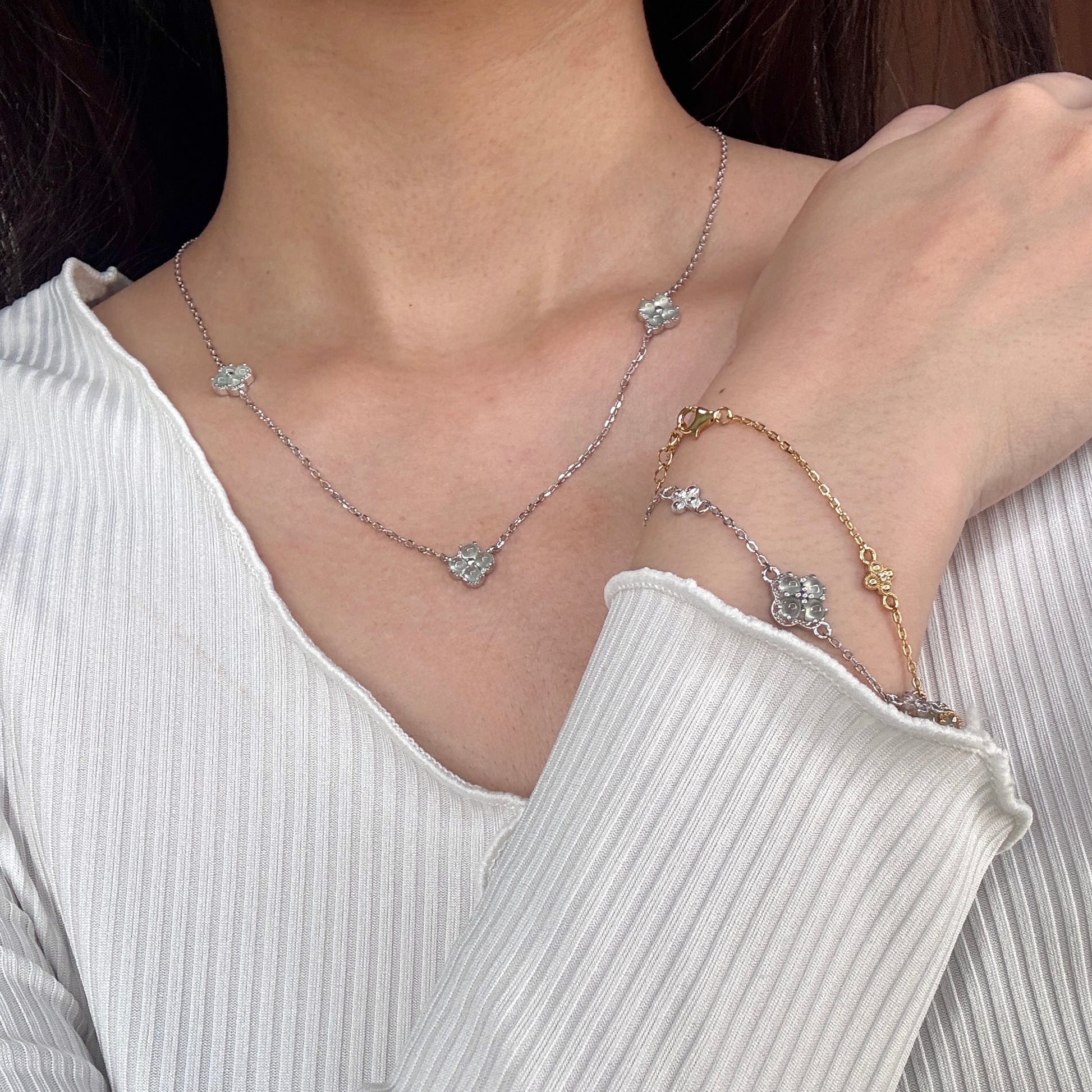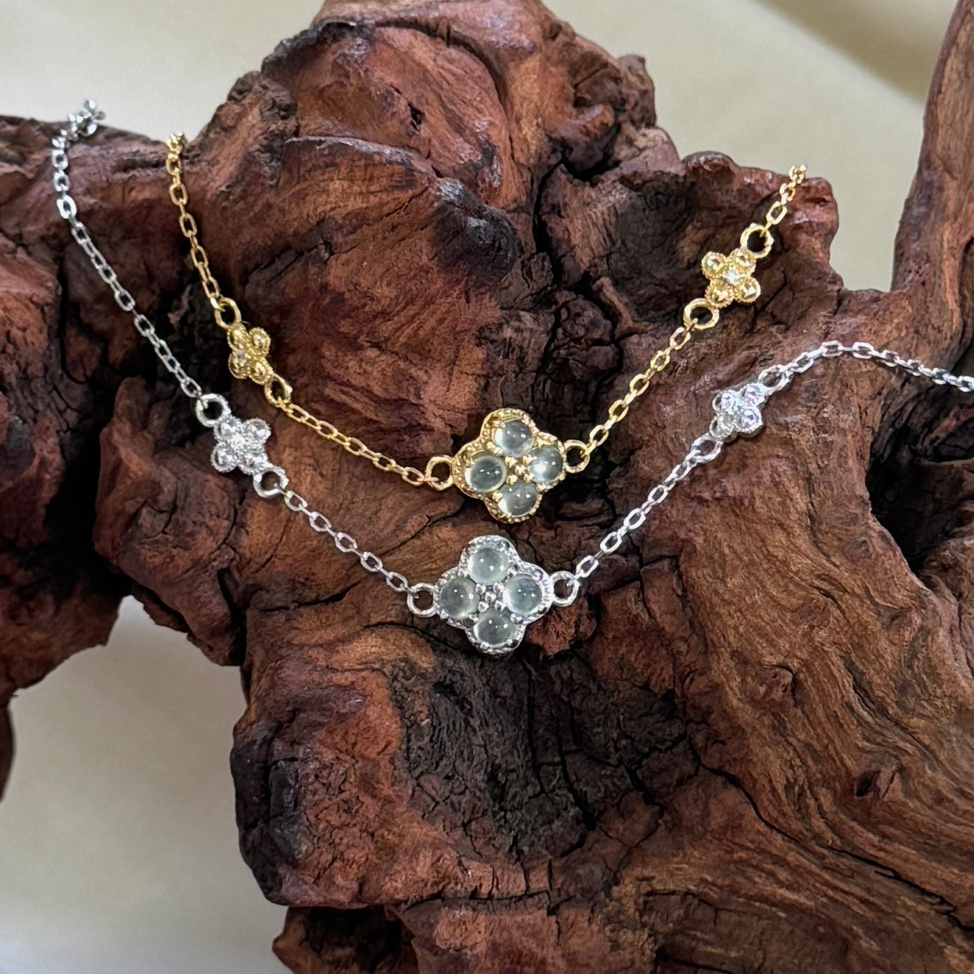 A fine chain bracelet featuring twin clover motifs in gold or silver tones. Its subtle shimmer and balanced symmetry make it a modern charm for everyday luck and grace.