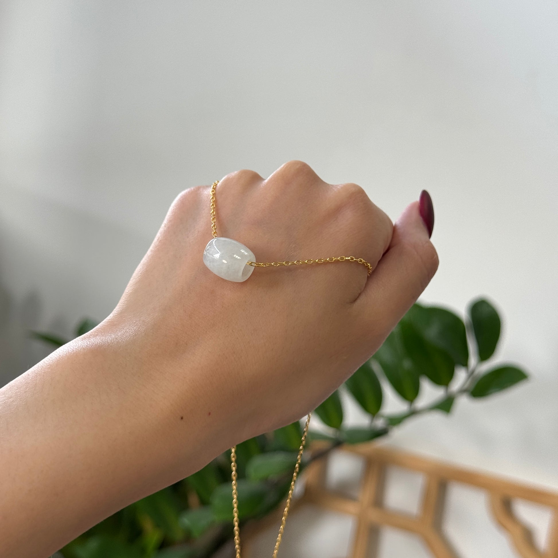 A smooth white jadeite barrel bead threaded directly onto a gold-plated link chain. Minimal, tactile, effortless.