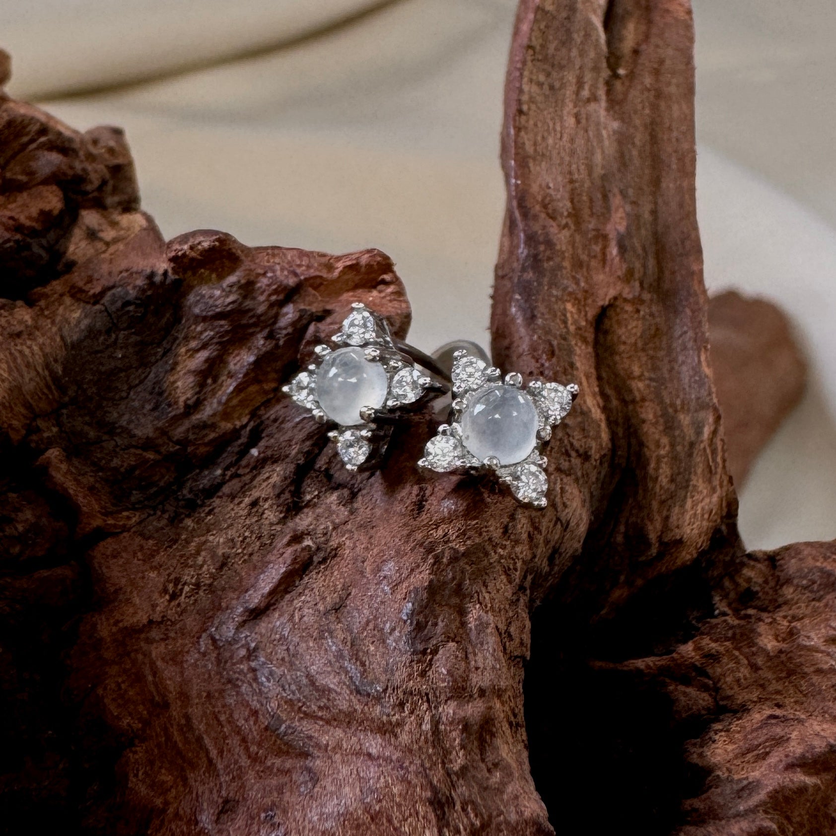 White jadeite cabochons centred within a starburst of CZ stones, set in sterling silver. Quietly striking - the kind of stud that does the talking.