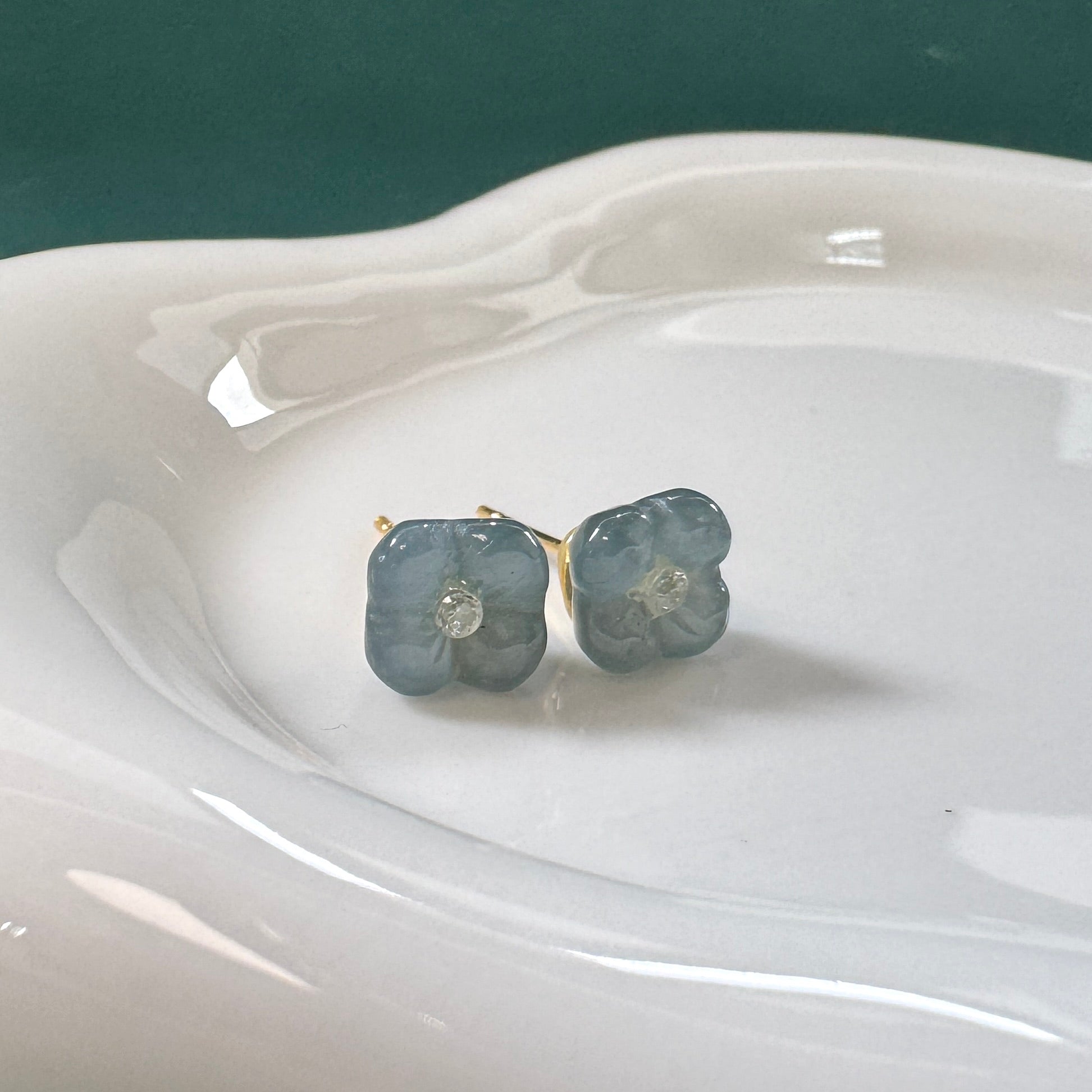 Blue jadeite carved into a soft floral form, finished with a subtle centre zircon. Light, understated, and designed for effortless everyday wear.