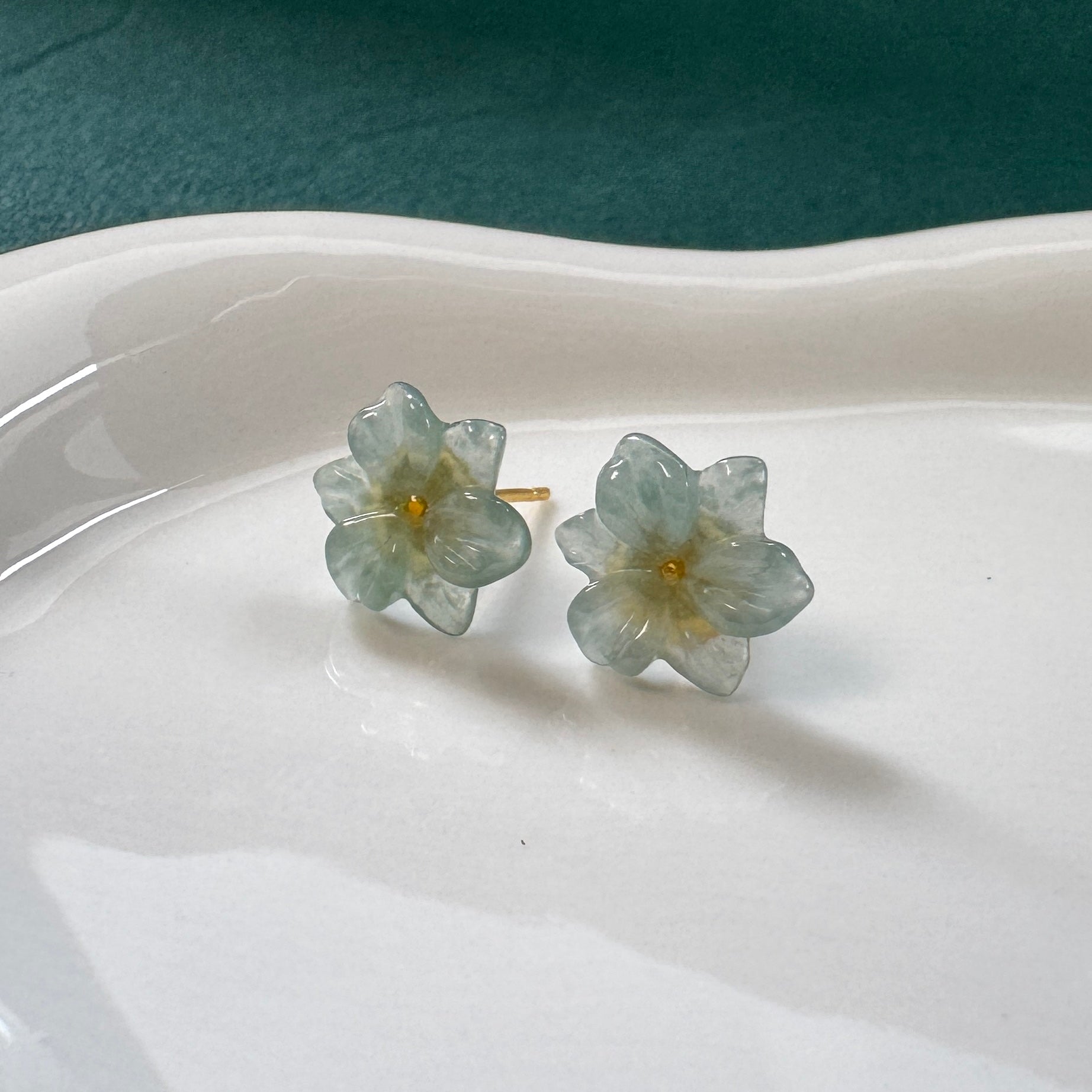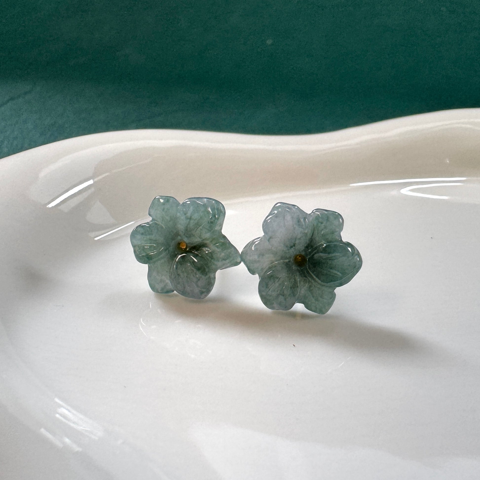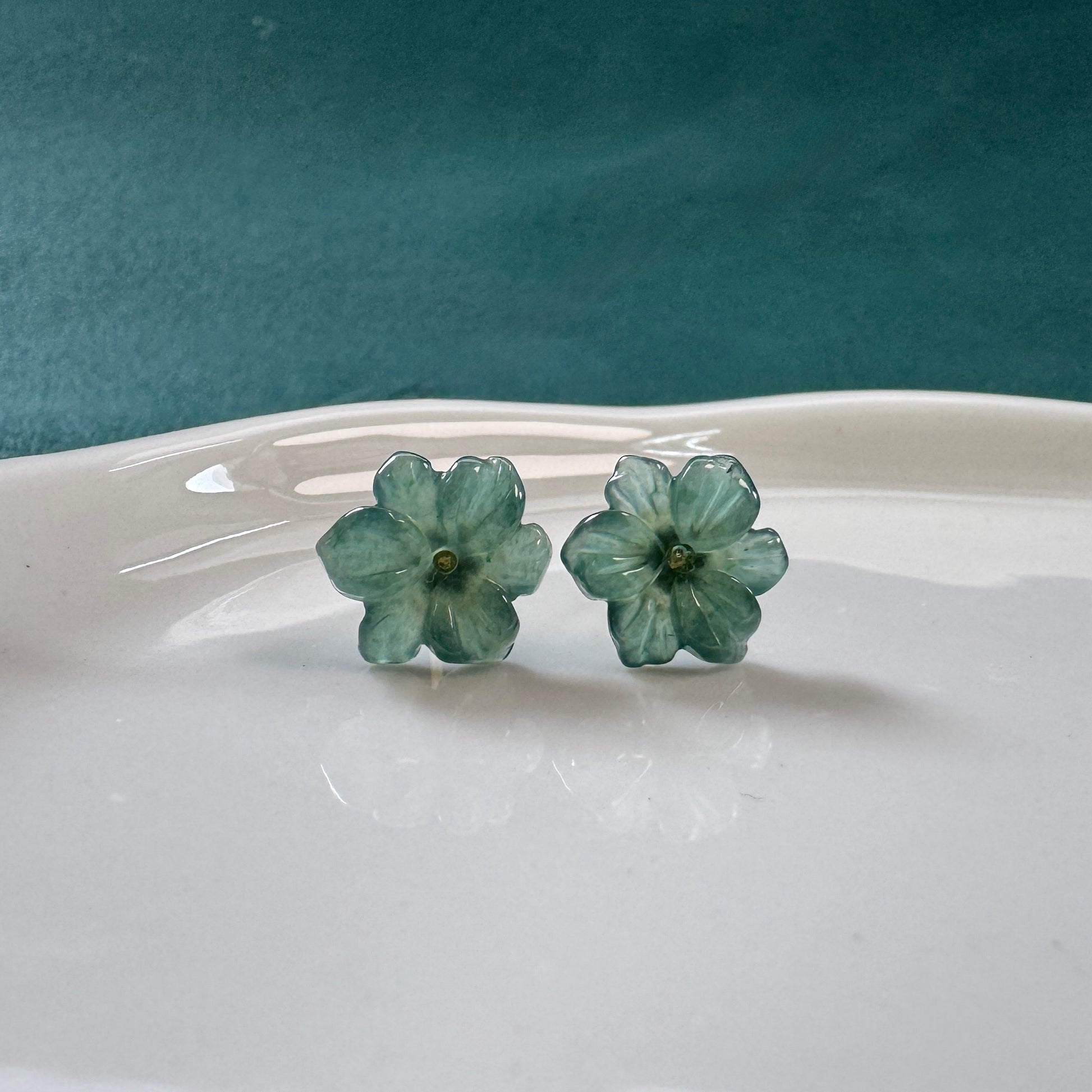 Teal jadeite carved into a soft floral form. Light, understated, and designed for effortless everyday wear.