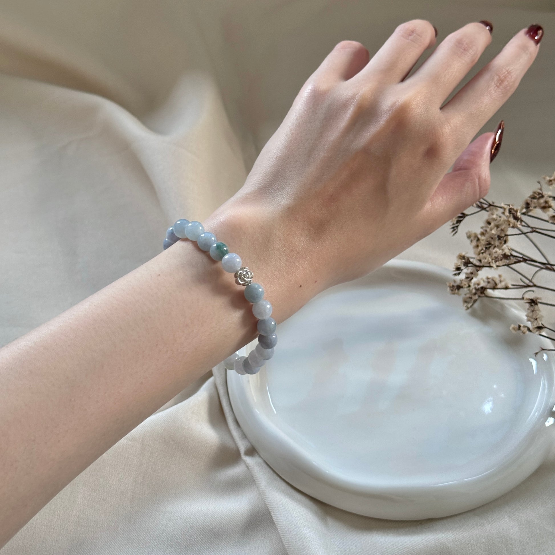 Delicate blue-lavender jadeite beads that glow softly under the light, reminiscent of sugared petals and morning dew. A pastel treat that pairs beautifully with any stack.