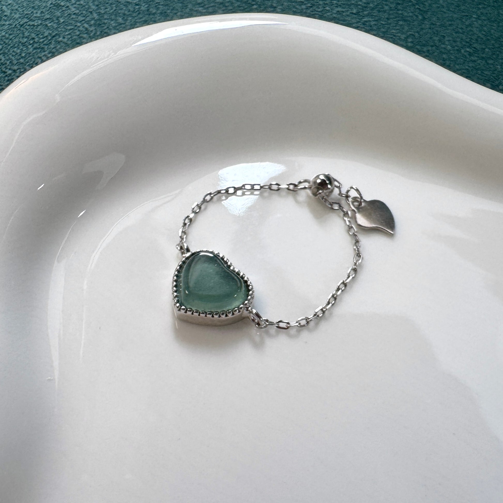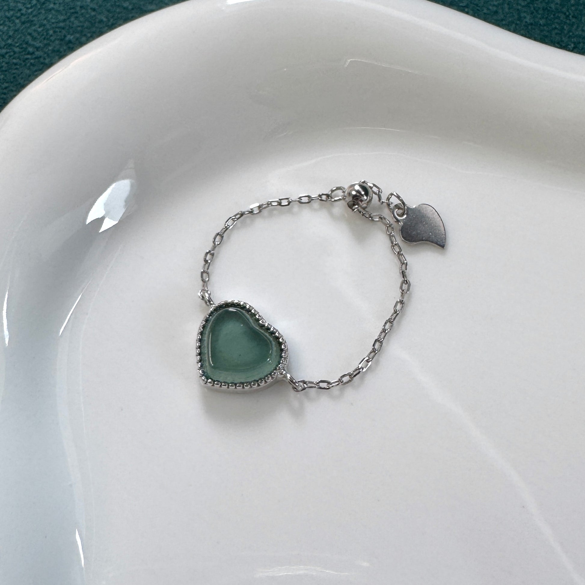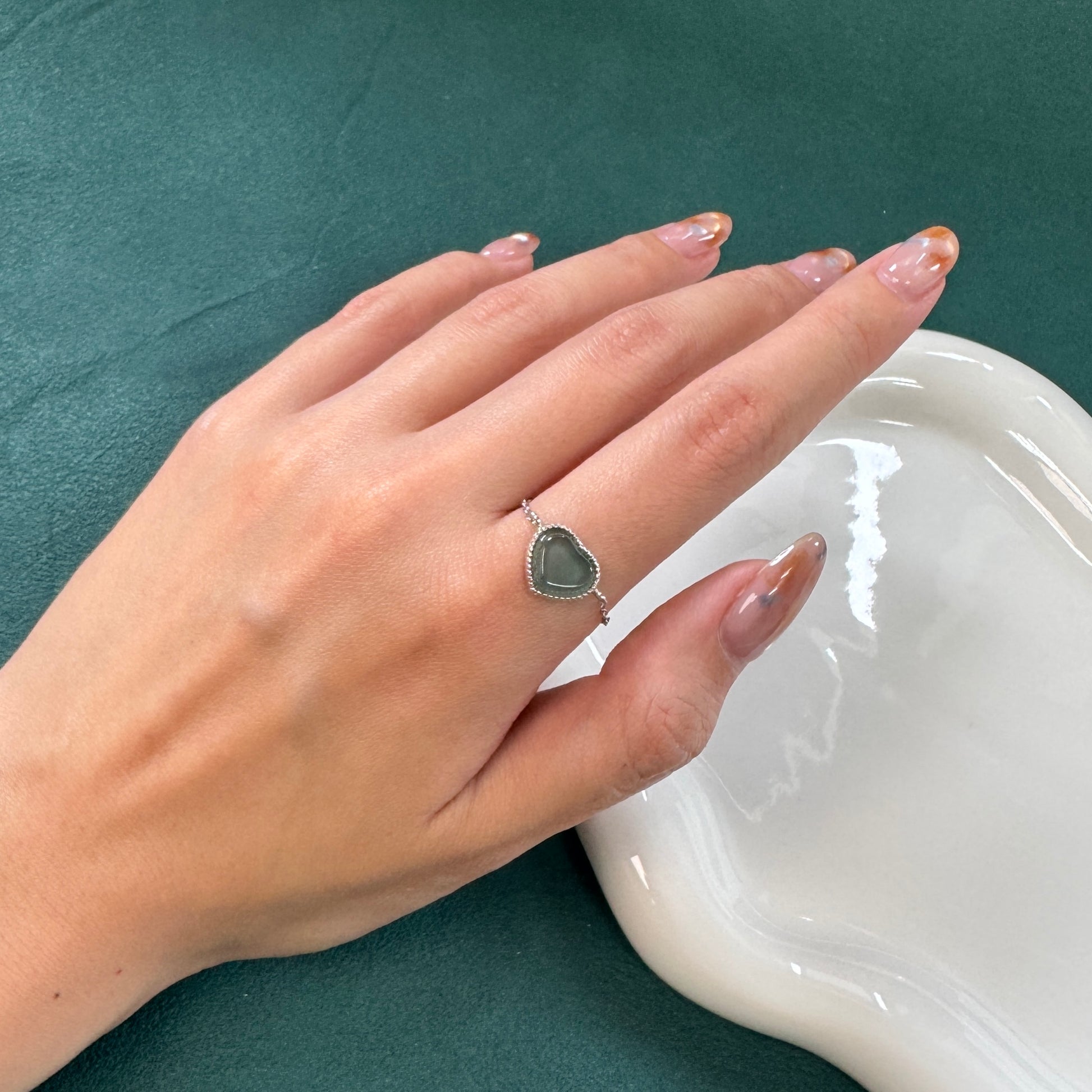 A heart-shaped jadeite set within a delicate frame, designed for everyday wear with a soft, timeless feel.