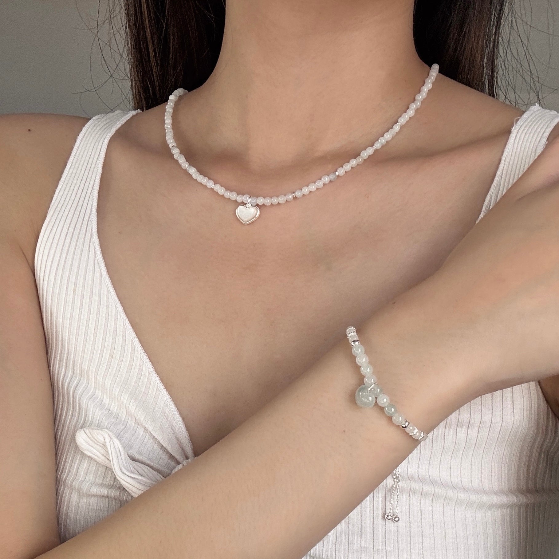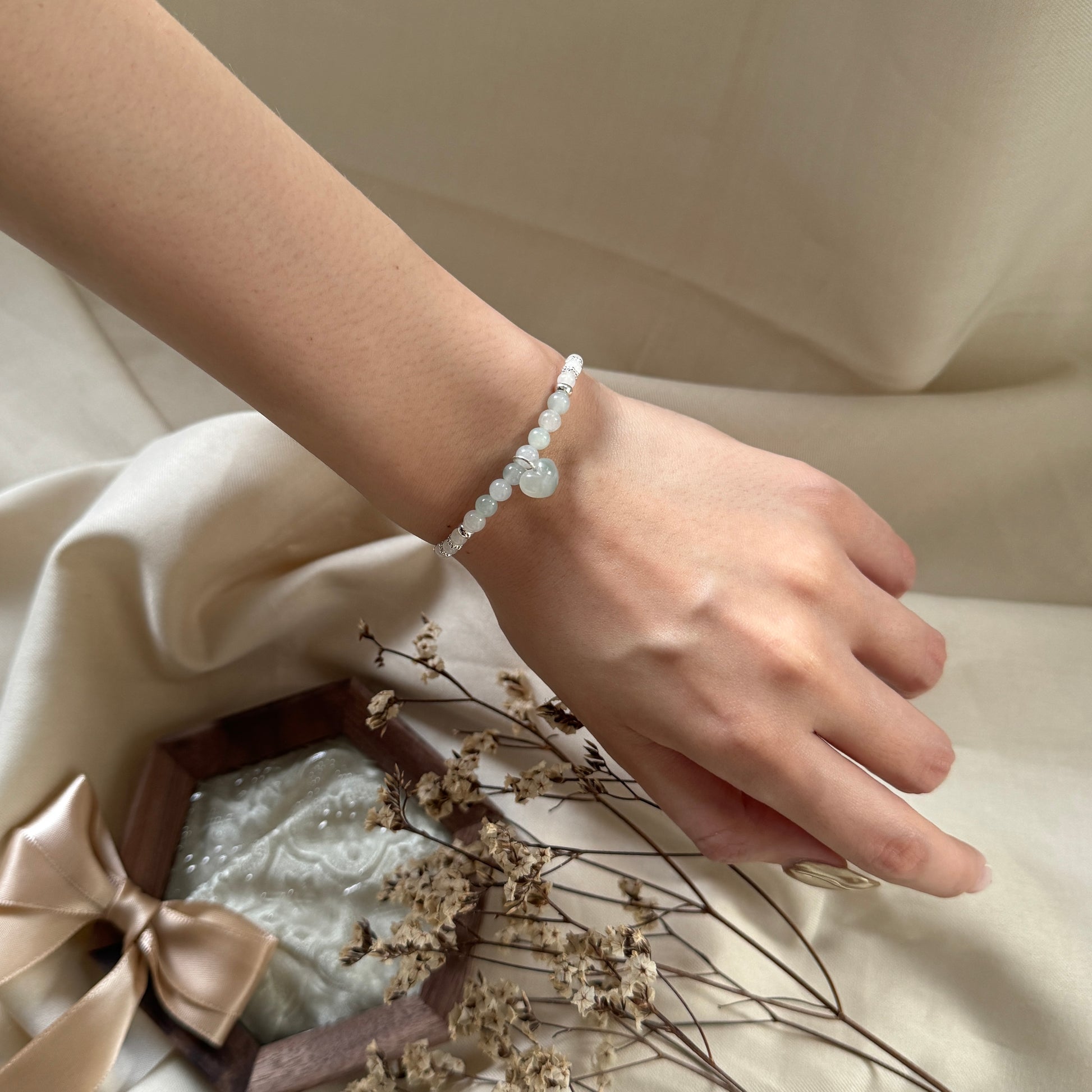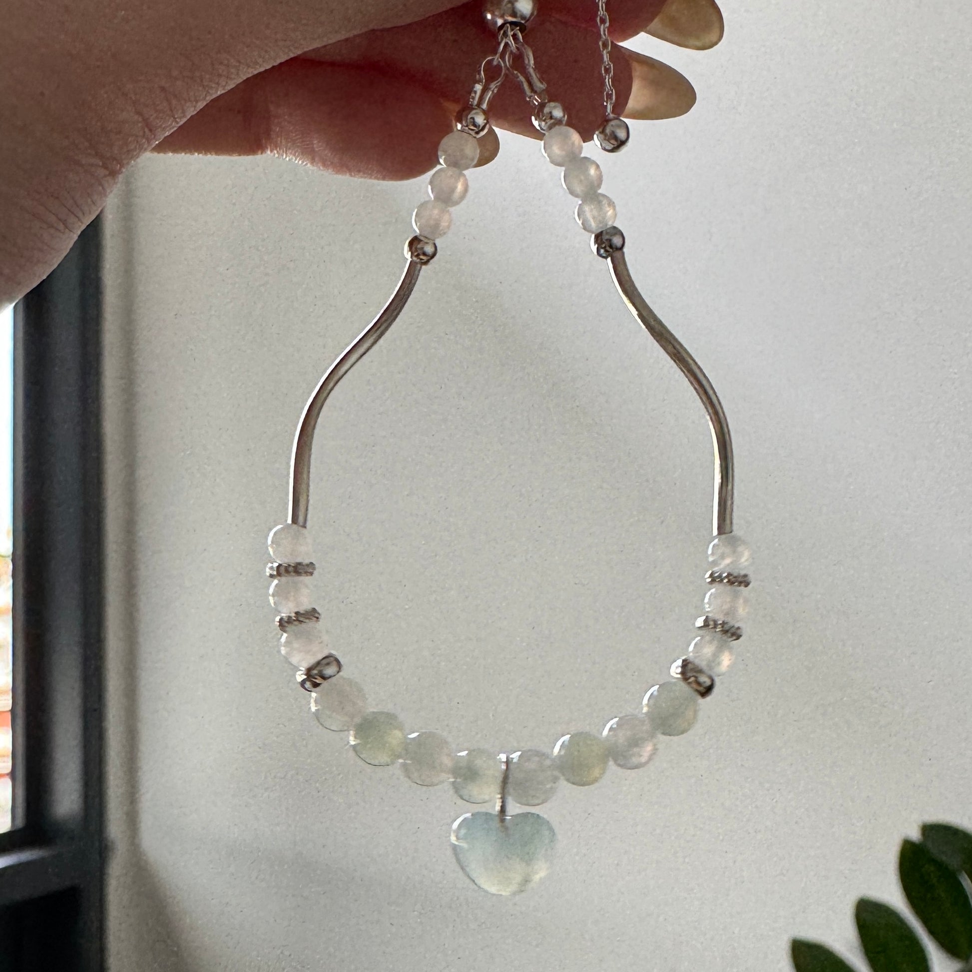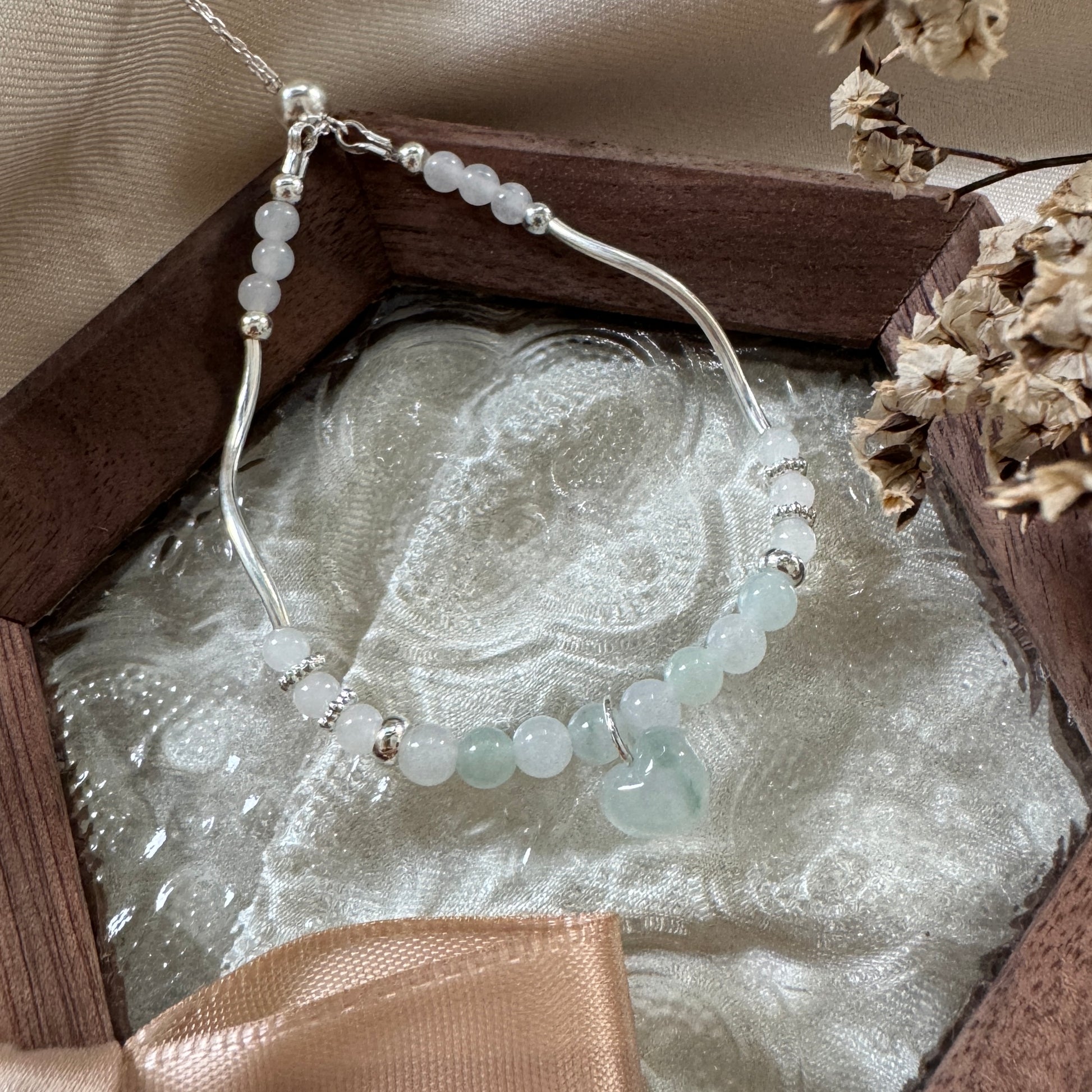 Effortlessly graceful, the Colette Jadeite Bracelet combines delicate beauty with a modern touch. Handcrafted with soothing pastel-hued jadeite beads and accented with sleek 925 silver elements, it embodies the perfect balance of elegance and charm. A petite heart-shaped jade charm dangles gracefully at the centre, adding a subtle playful flourish. The fluid design makes it an ideal piece for everyday wear or for adding a gentle sparkle to any special occasion. Colette is a timeless symbol of femininity, love, and lighthearted sophistication.
