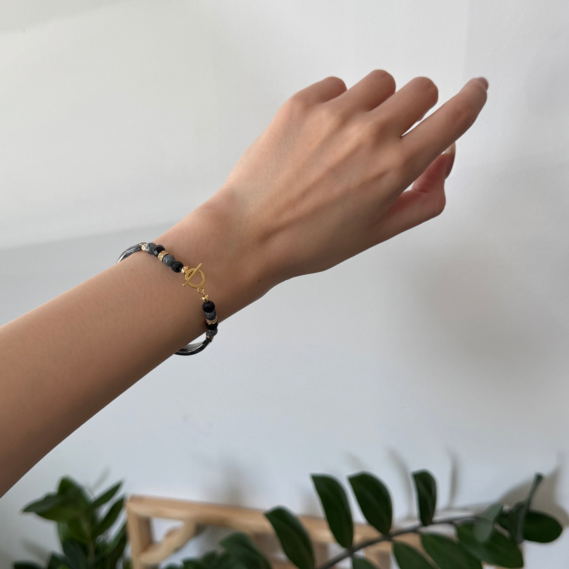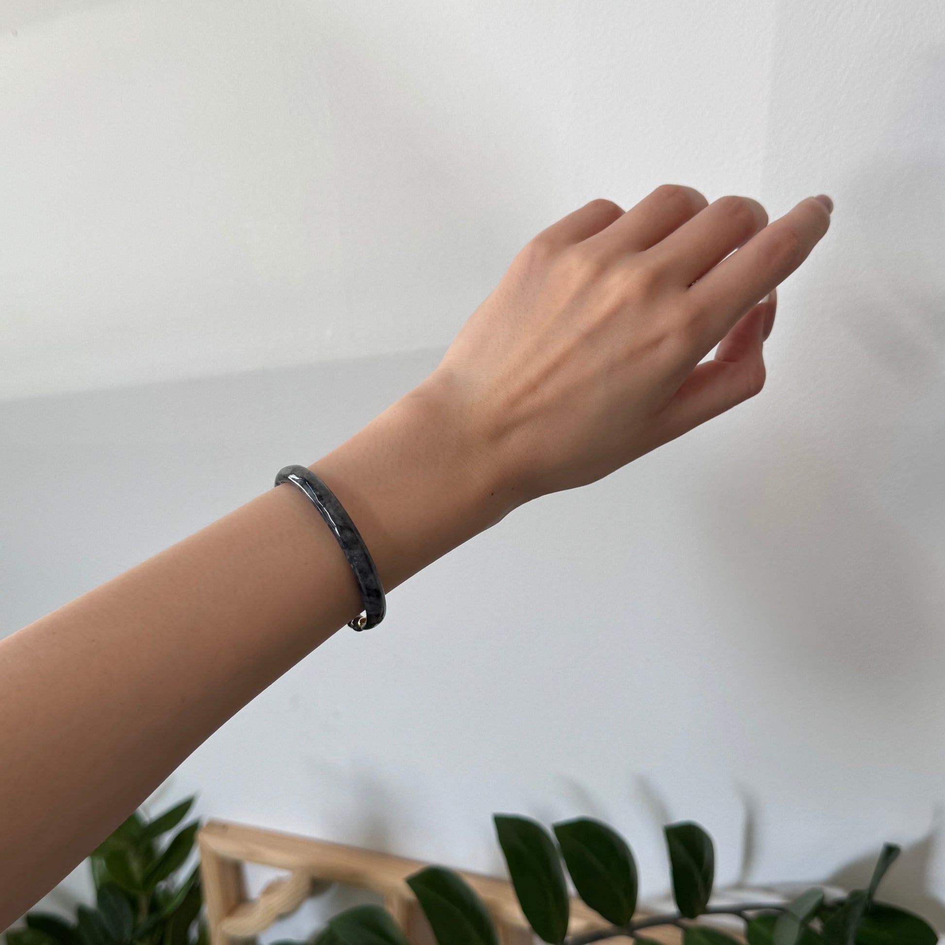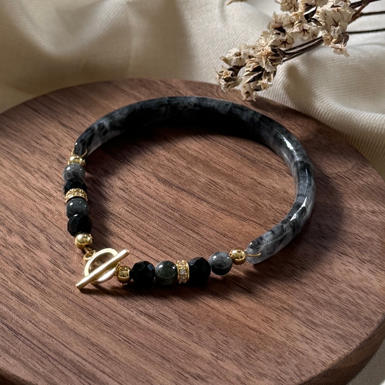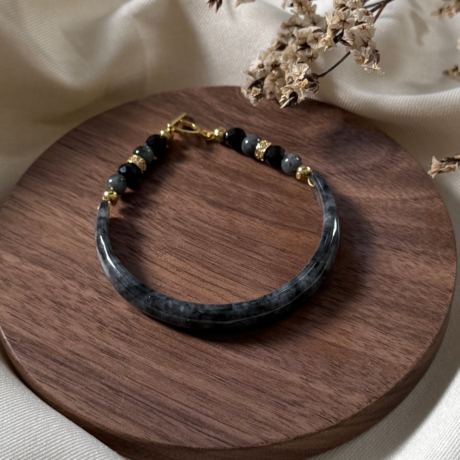A bold half-bangle crafted from Wuji jadeite, set against faceted beads and gold accents. The Eclipse Bracelet draws its name from the balance of light and shadow — its curved jade form a quiet arc of stillness and strength.