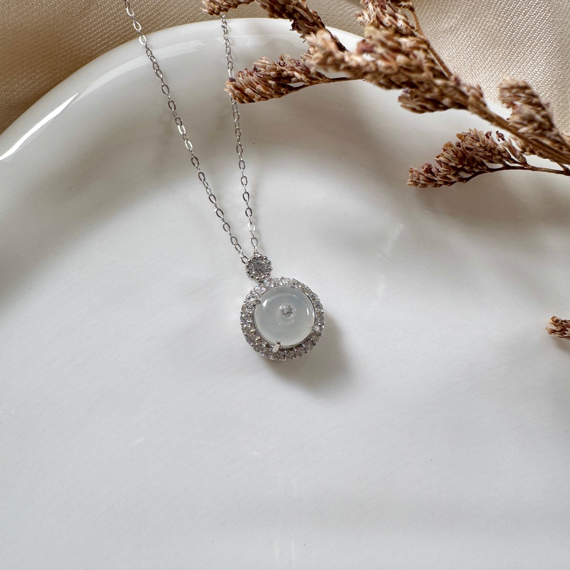 Named for light and renewal, the Elaris necklace is an expression of quiet radiance. A circular jadeite disc rests at the centre, surrounded by a shimmering halo and topped with a single faceted stone—like a rising star above a calm moon.