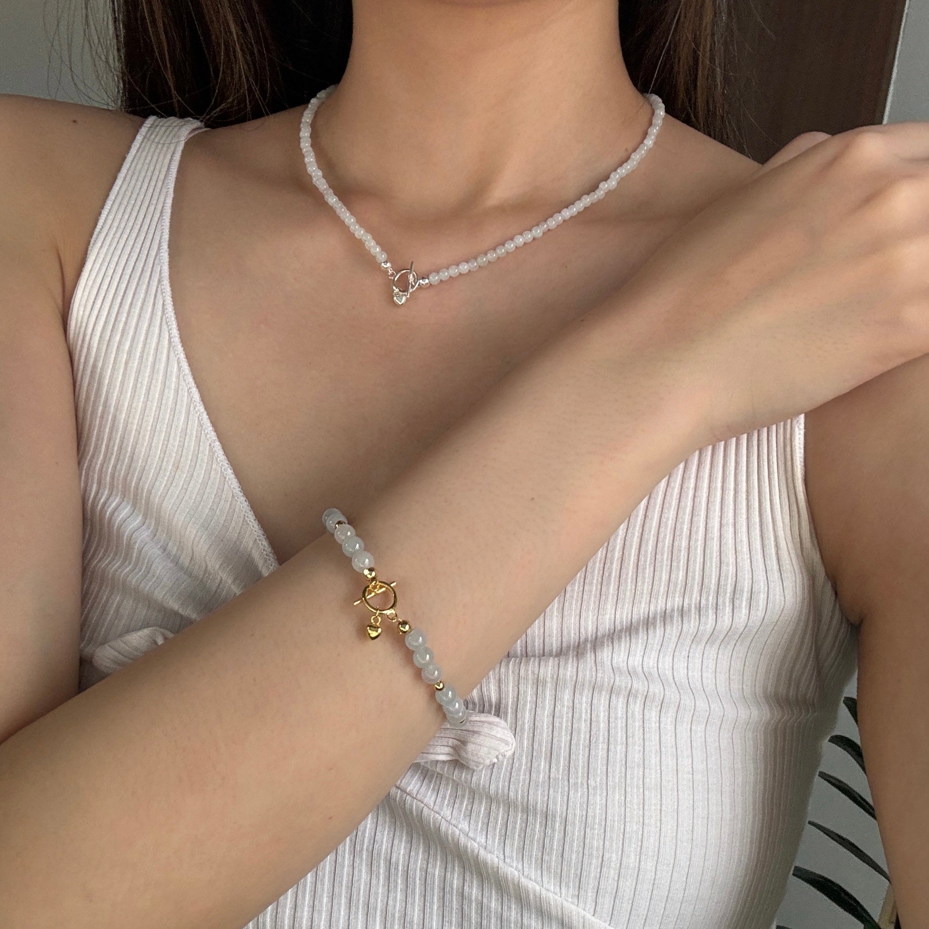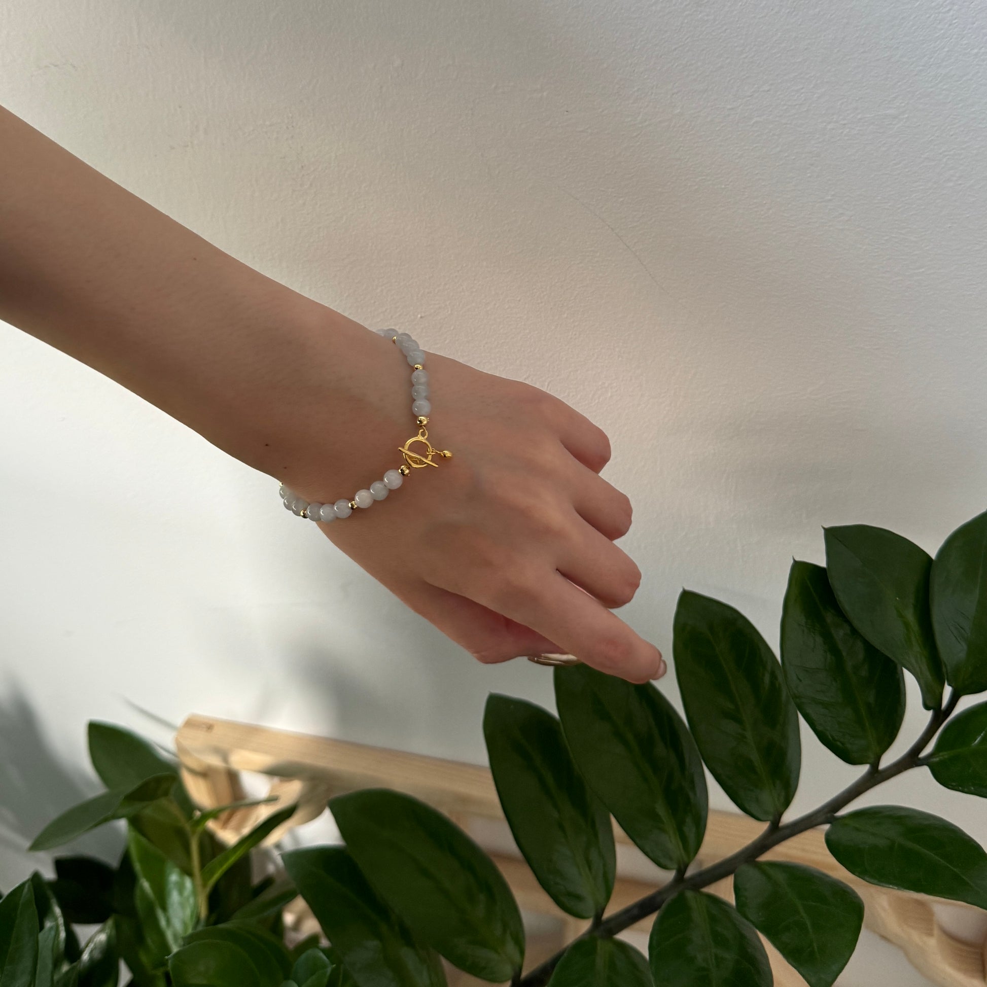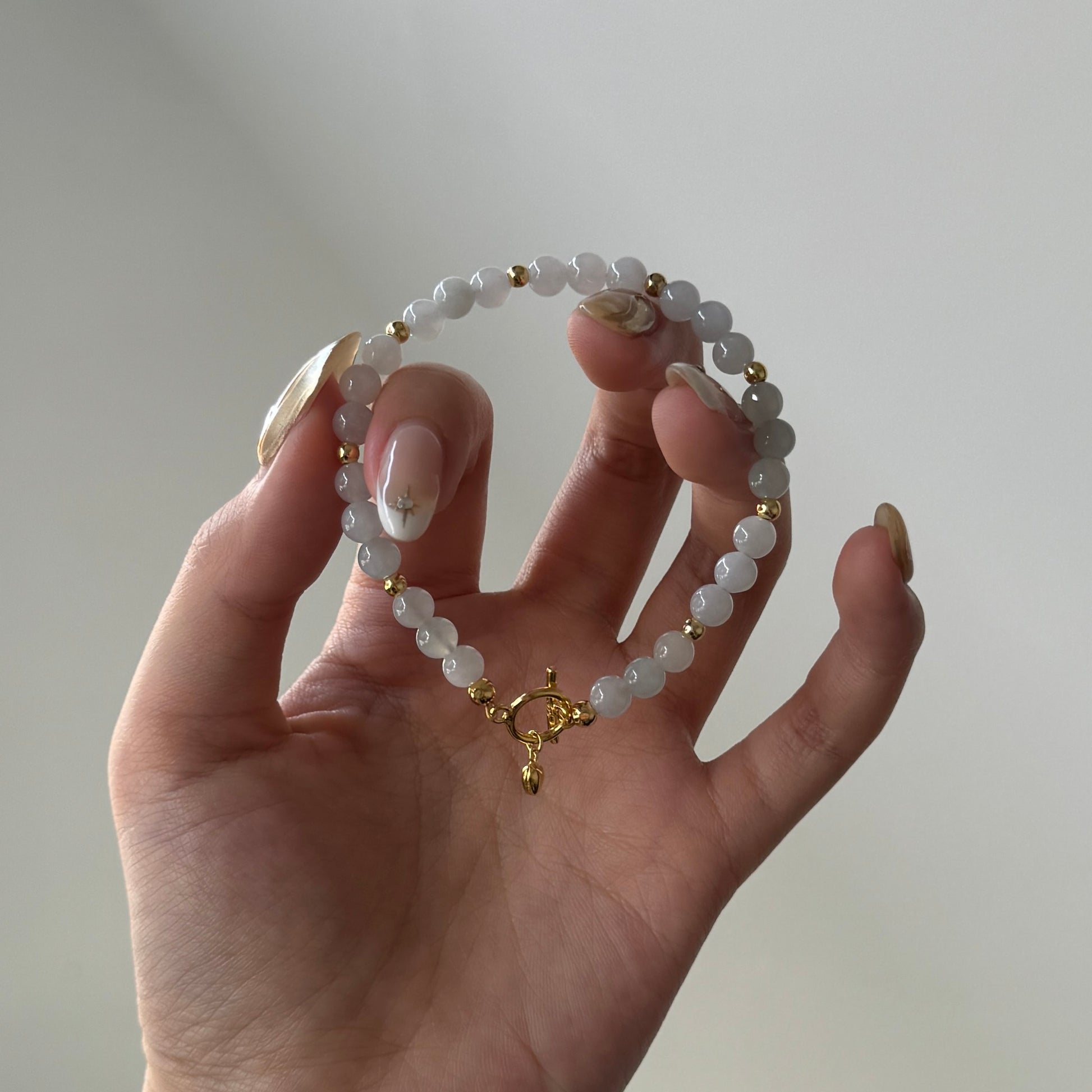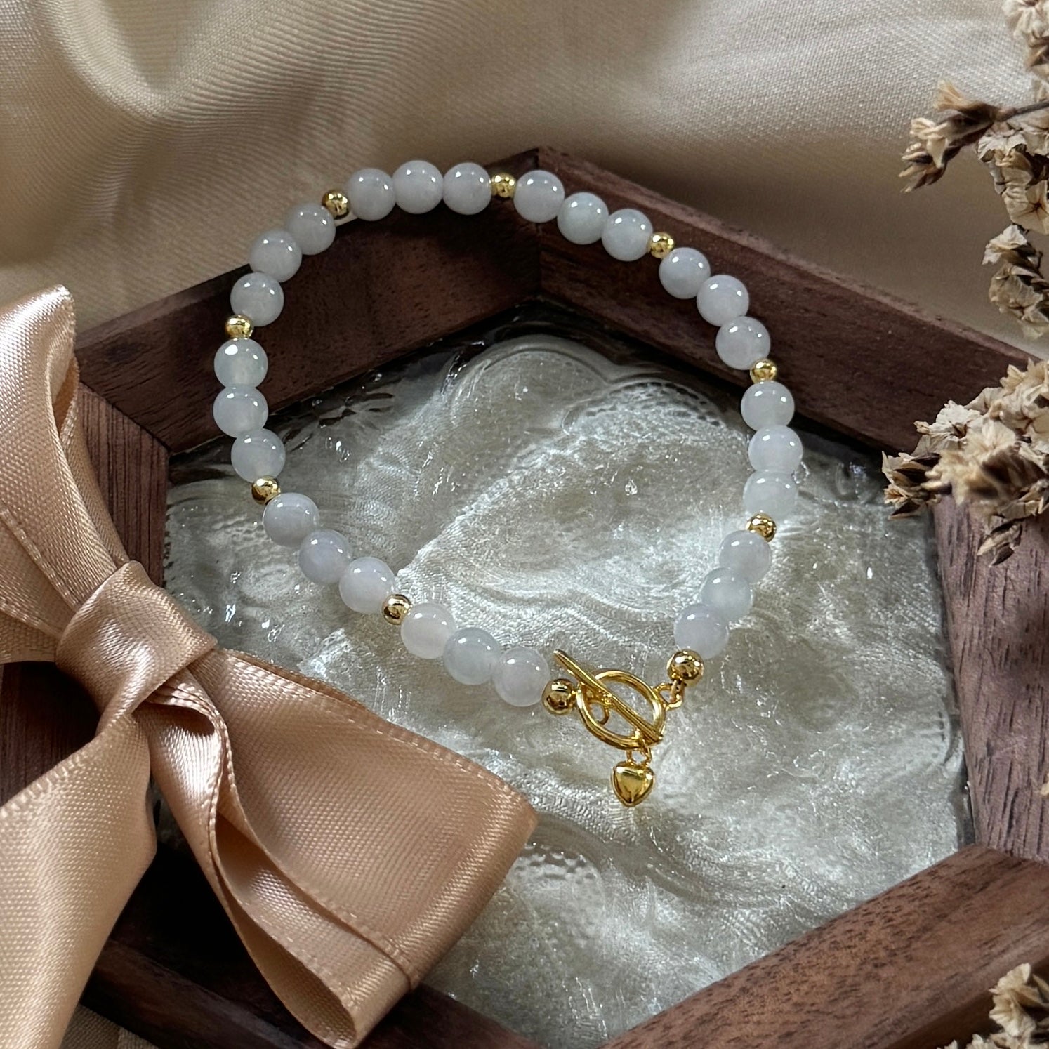 Elegant and refined, the Élodie Jadeite Bracelet is a celebration of simplicity and charm. Crafted with soft, icy jadeite beads and adorned with radiant gold accents, this bracelet captures the beauty of subtle luxury. A dainty heart charm dangles from the toggle clasp, adding a playful touch to its classic design. Élodie is perfect for stacking or wearing alone, making it a versatile accessory for everyday elegance or special moments.