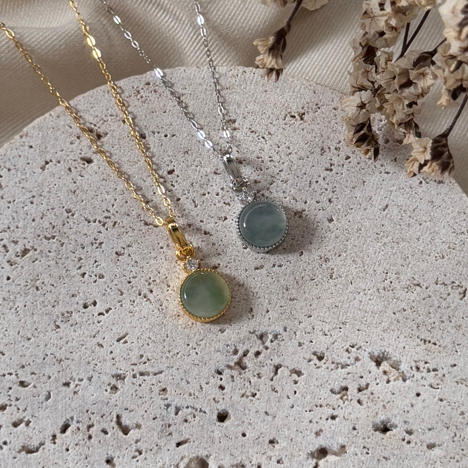 A quiet touch of light, the Eliora Necklace features a round jadeite cabochon set beneath a single sparkling stone, finished in either gold or silver. Elegant in its simplicity, Eliora is made for effortless everyday radiance.