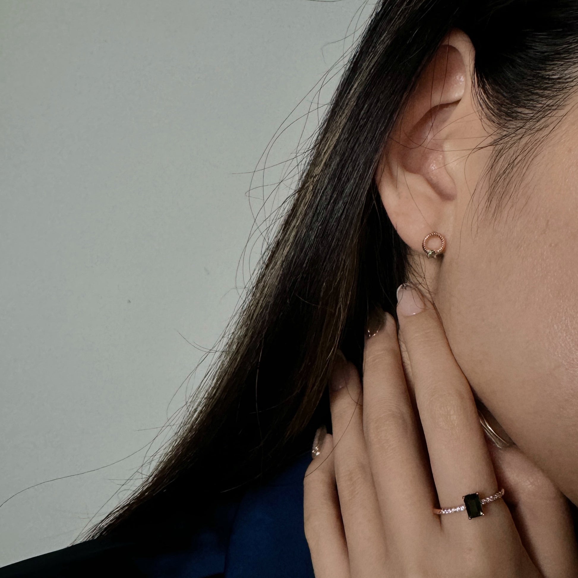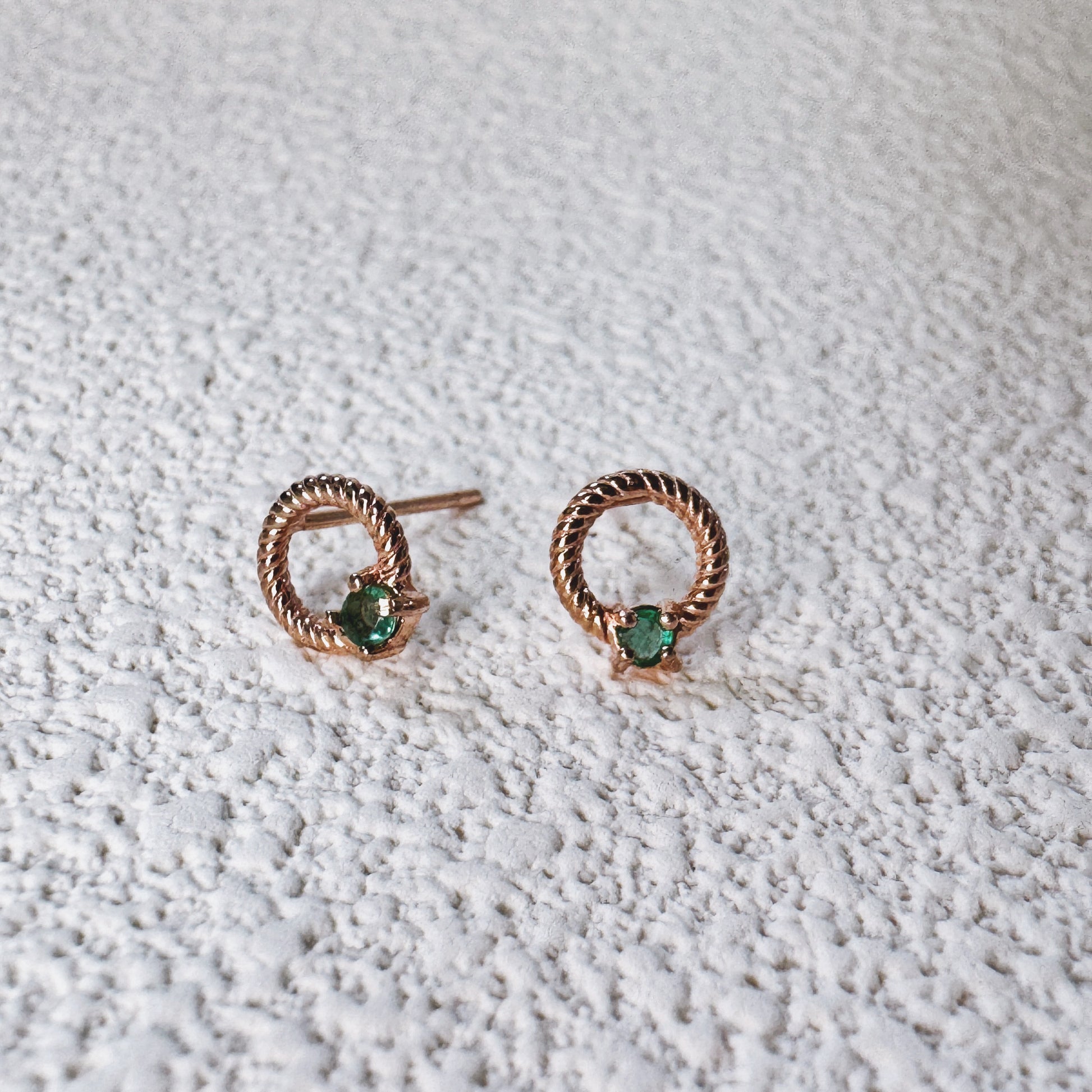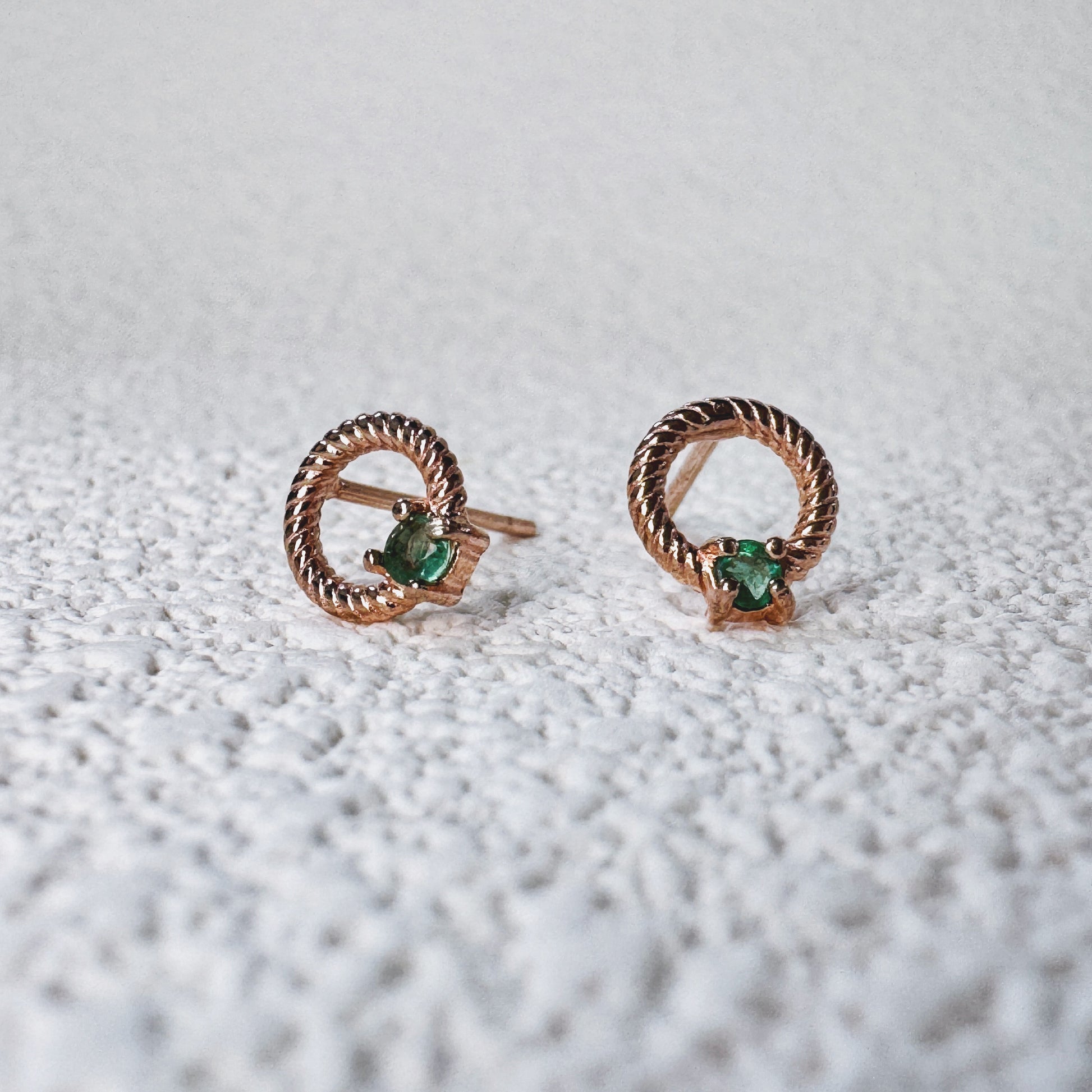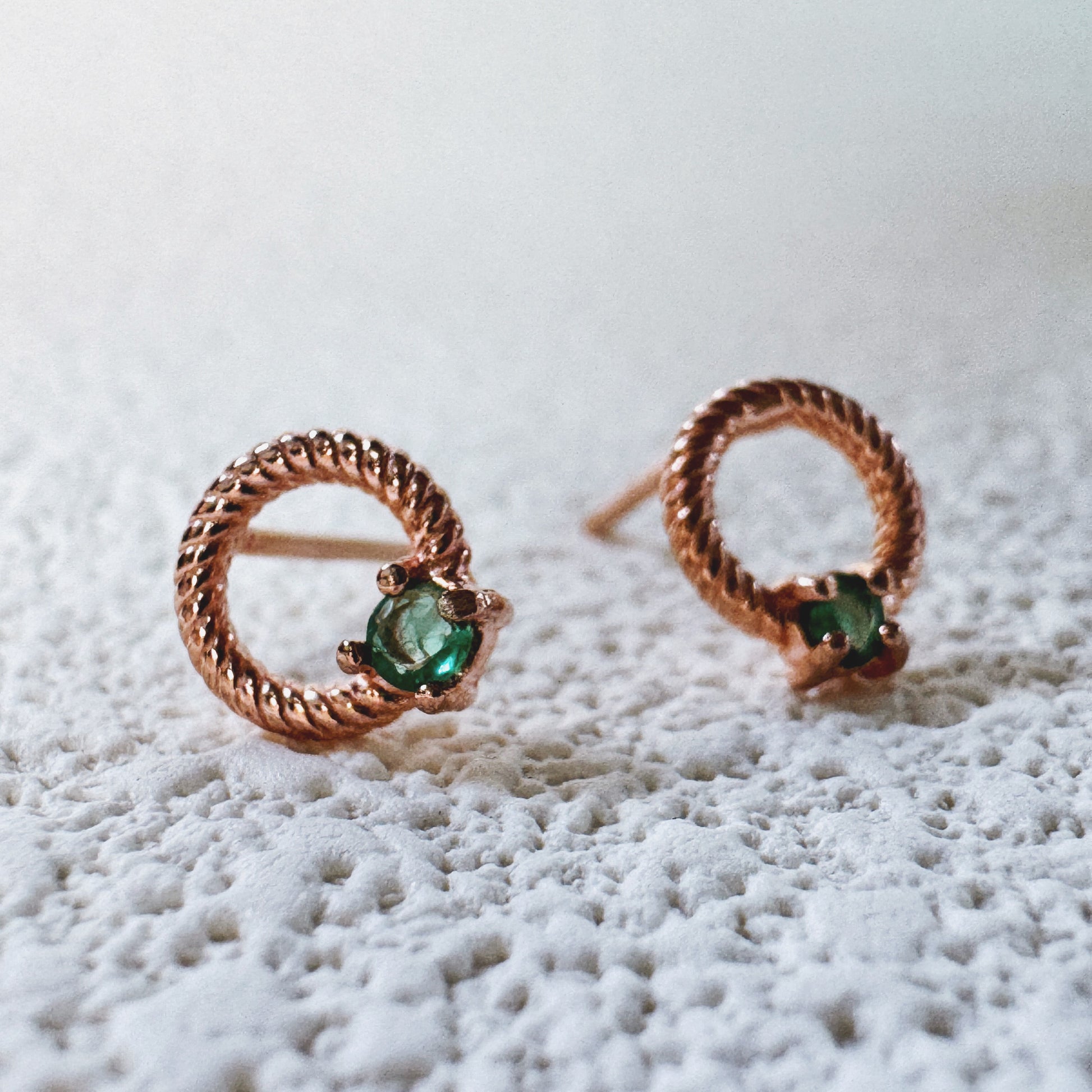 The Elysian Twist Emerald Earrings blend timeless elegance with a touch of modern artistry. Each earring features a vivid round-cut emerald, its rich green hue symbolizing growth and renewal. The gemstone is cradled within a twisted rope design crafted in warm rose gold, forming a delicate open circle that adds a sophisticated flair to the design.
