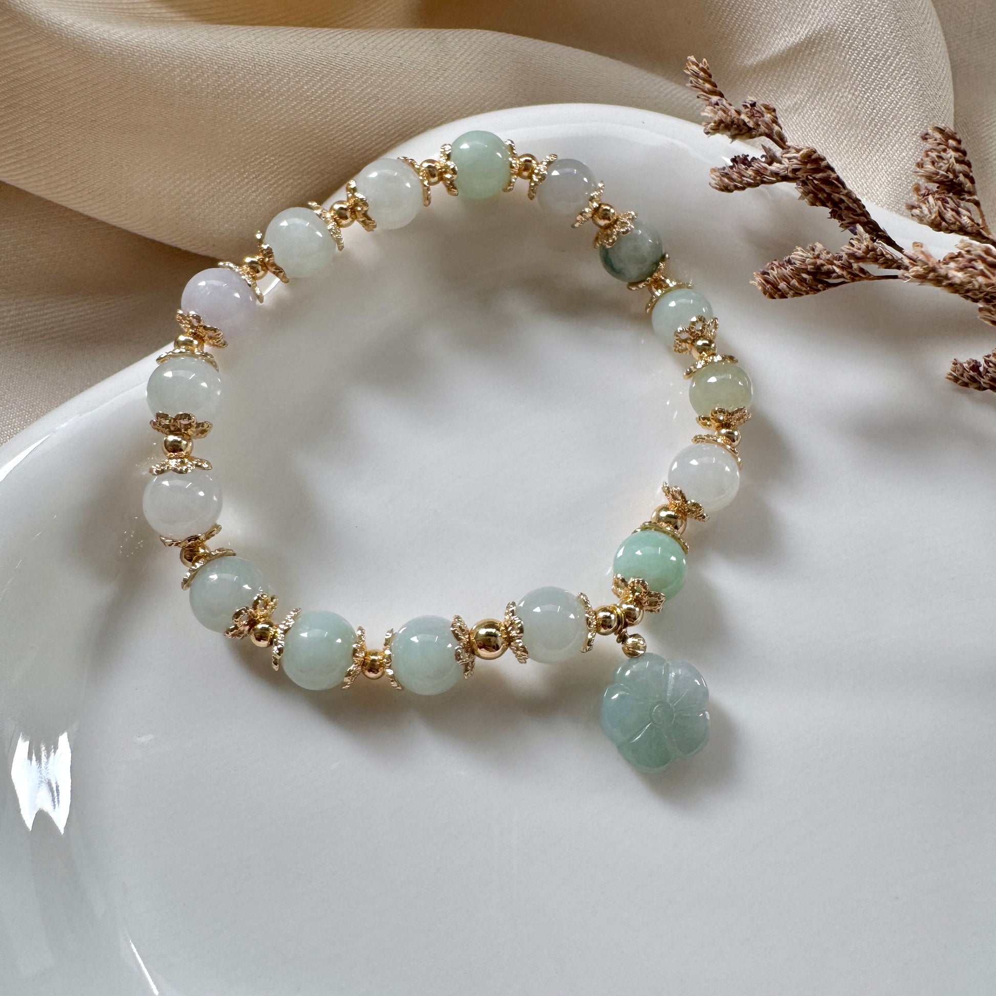 Light and full of feeling, the Faela bracelet dances between pastel tones and gentle warmth. Strung with jadeite beads in a soft spring palette, it’s finished with delicate gold-toned floral spacers and a hand-carved jade flower charm that sways with every move.