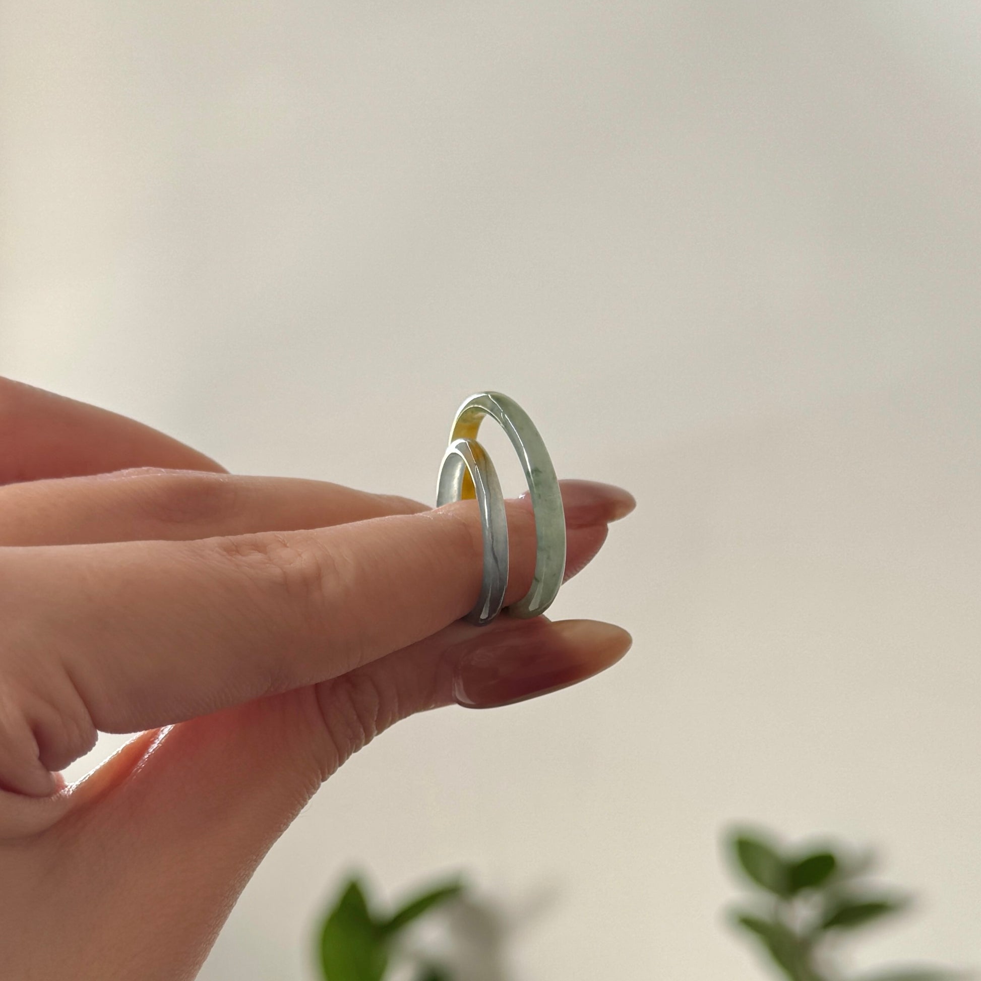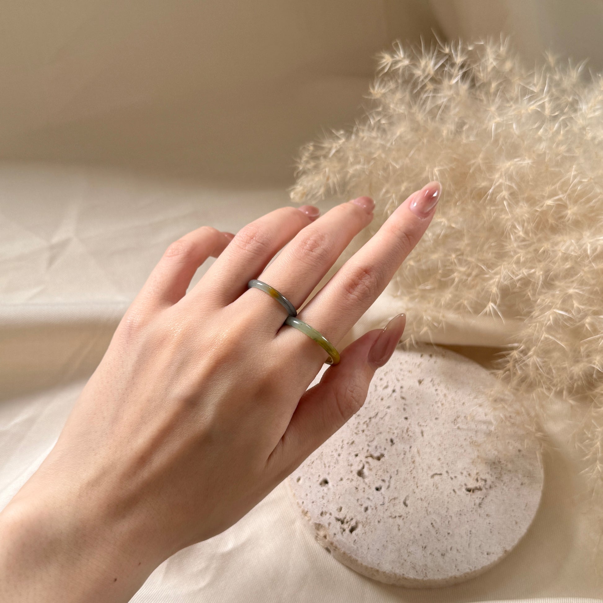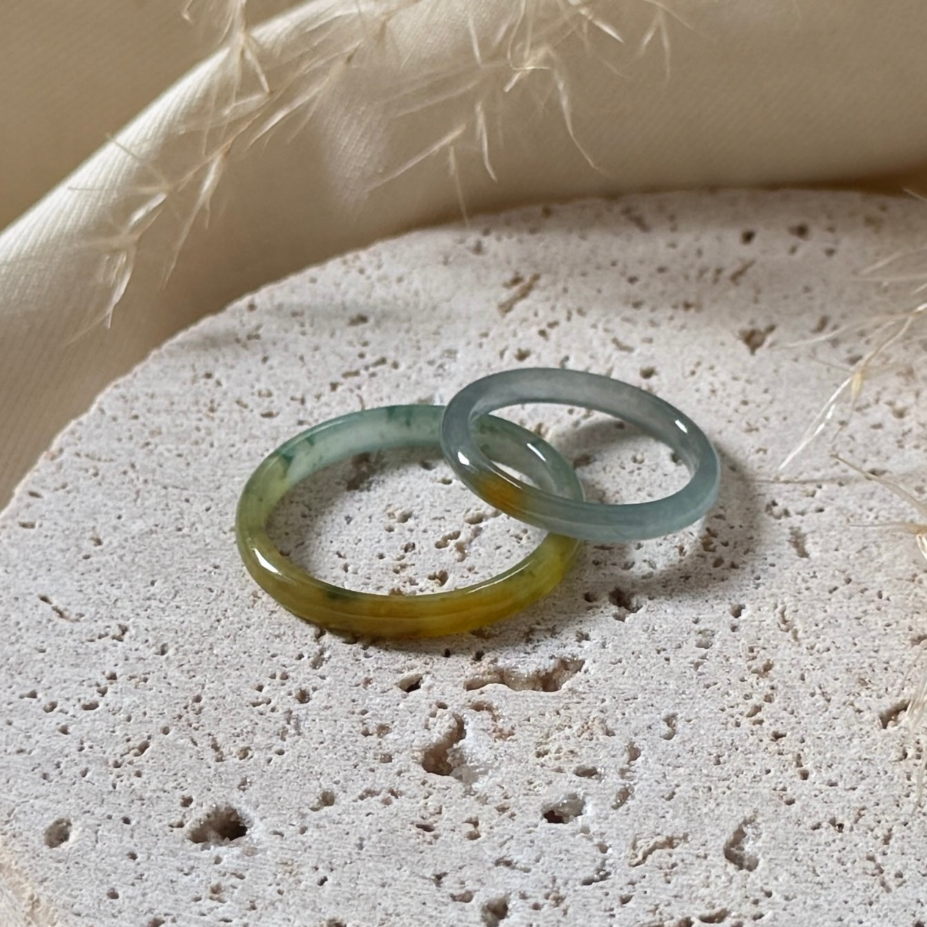A slim Guatemalan jadeite ring with a rare blend of golden amber, olive green, and soft teal. The colours melt seamlessly into one another, creating a rich, organic gradient that feels both earthy and elevated. Finished with a glossy polish and a sleek profile, Florin is a standout piece with old-world charm.