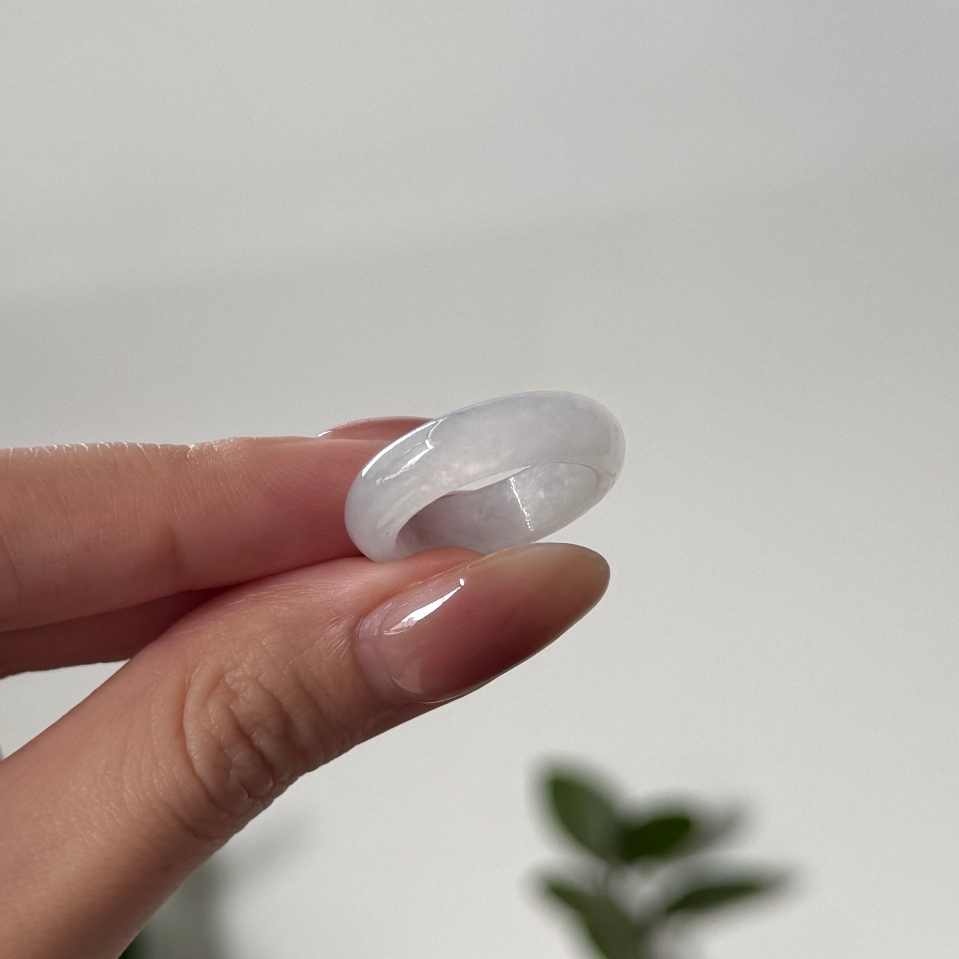 This ring features an icy white Myanmar jadeite with a faint milky translucency and smooth, domed profile. Its subtle glow and minimal tone make it a versatile piece that pairs effortlessly with both warm and cool palettes. Polished to a sleek finish for a refined, modern look.