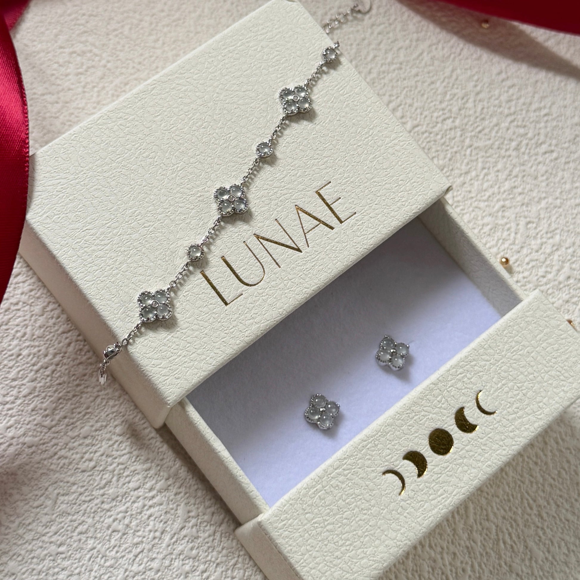 Delicate and luminous, this Gift Set features a bracelet and earrings adorned with glowy white jadeite cabochons. Each piece is designed with clover motifs, symbolising luck, harmony, and timeless elegance.
