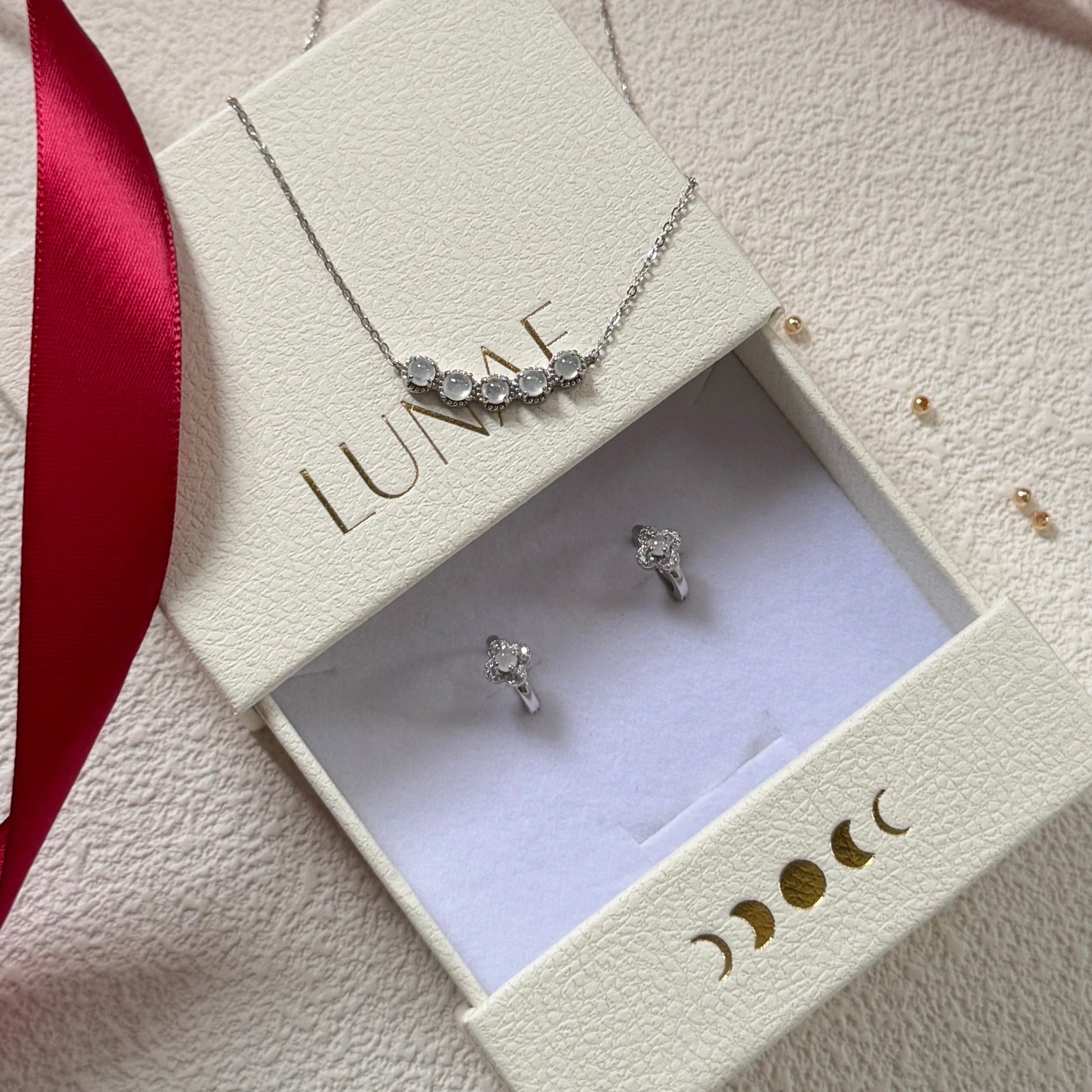 Radiating subtle elegance, this Gift Set features a white jadeite smile necklace paired with dainty clover huggies. This delicate combination symbolises positivity, good fortune, and timeless beauty.