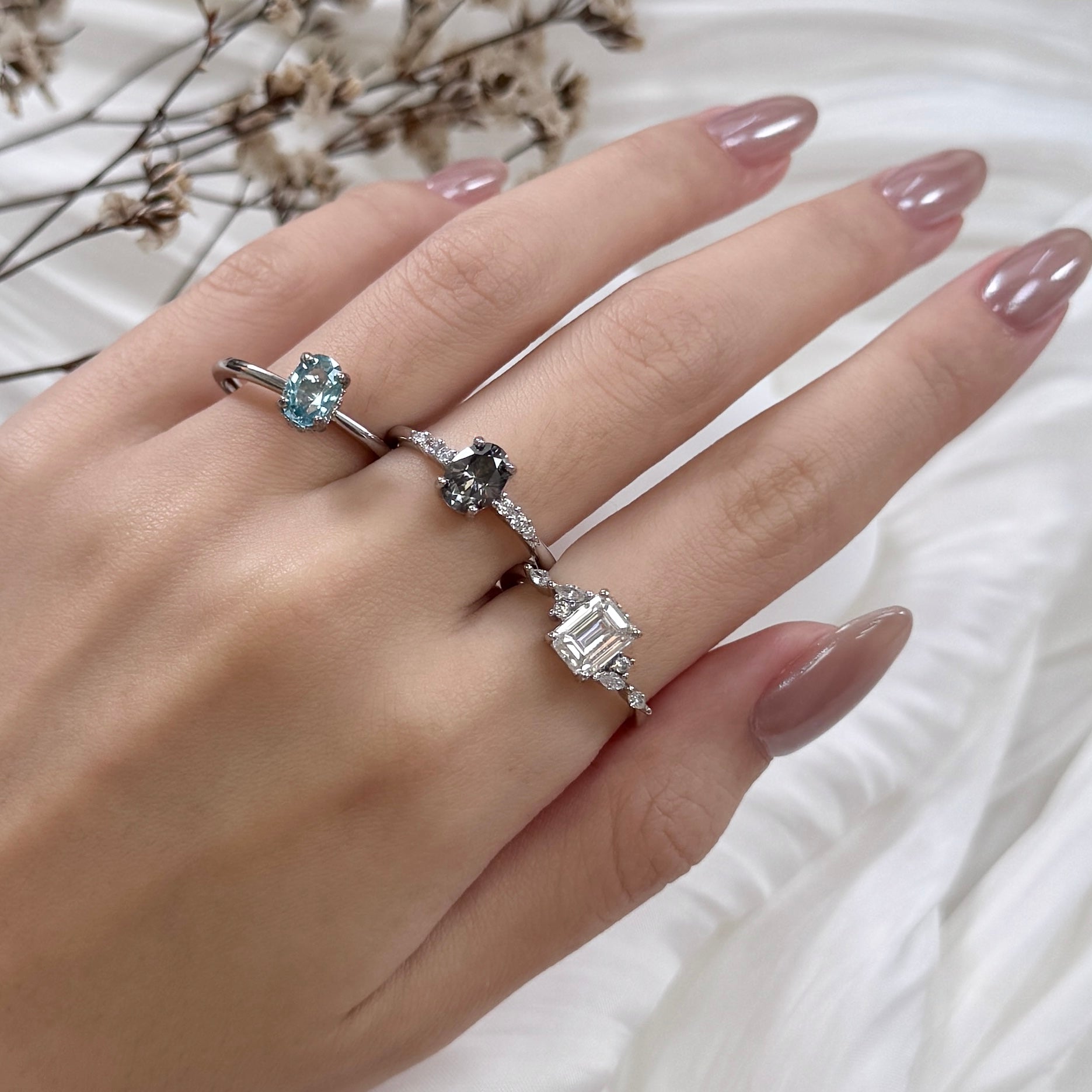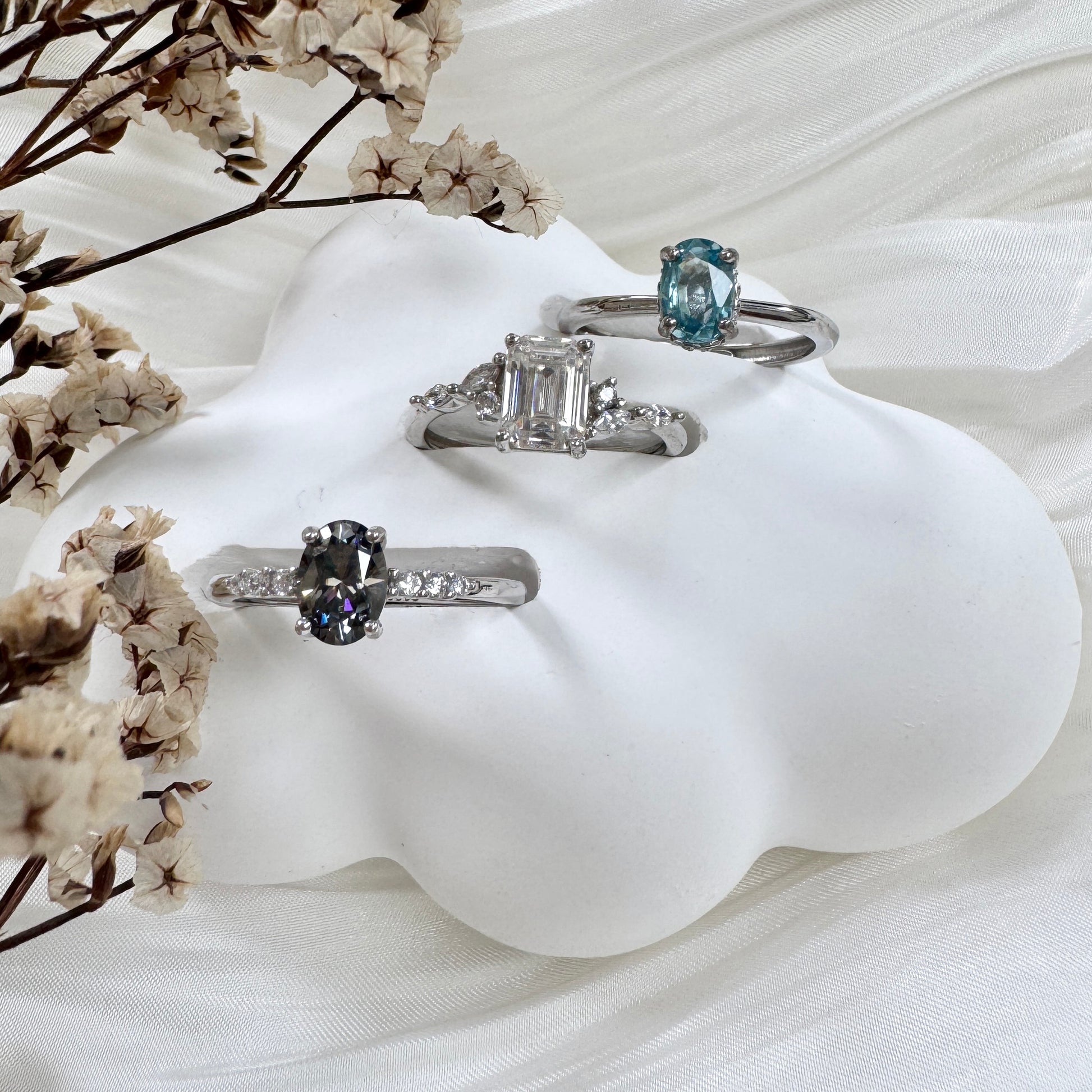 A trio of cool-toned gems, united in crystalline elegance.