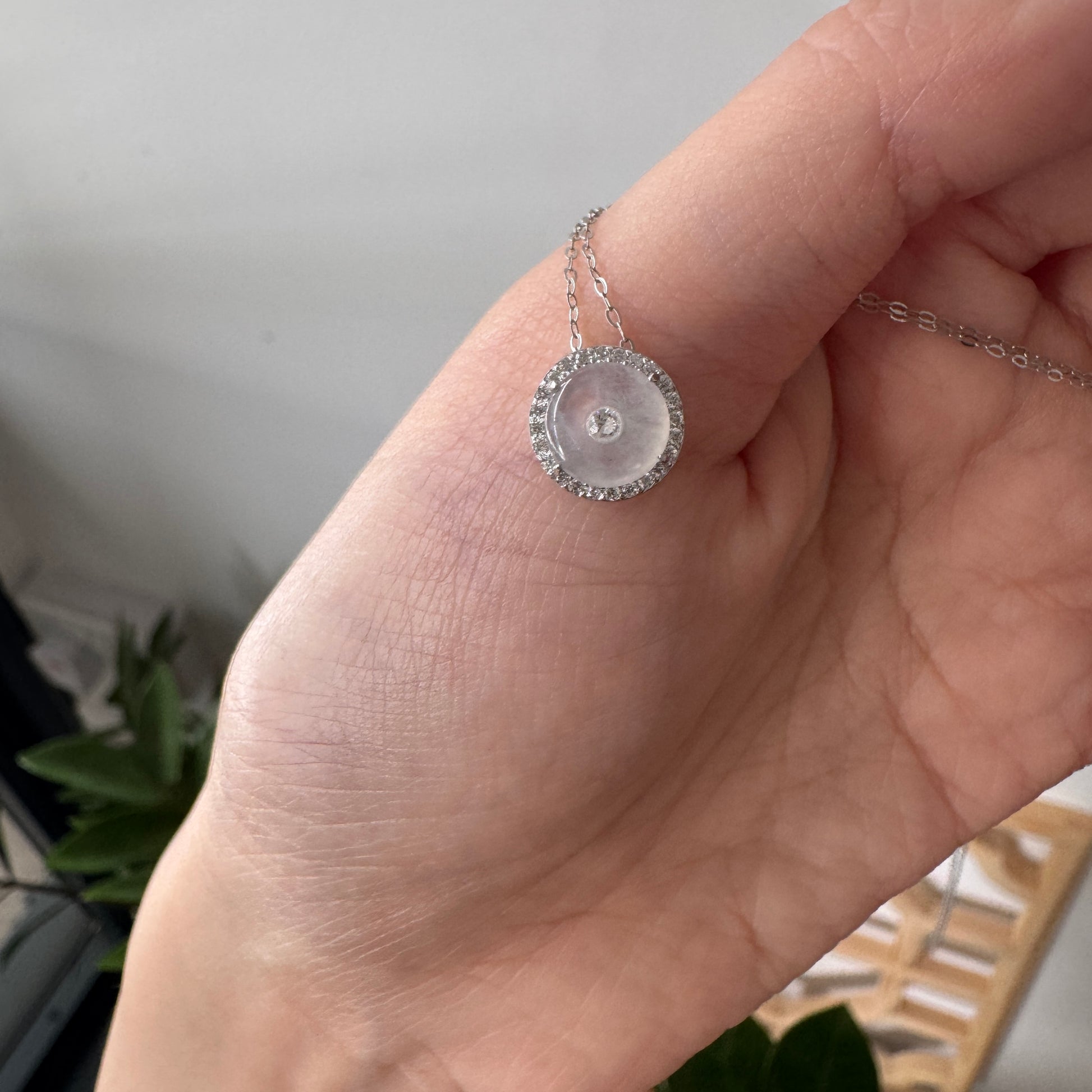 A quiet circle of light. The Halo necklace features a translucent donut-cut jadeite disc, centred with a shimmering stone and framed in a delicate pavé halo. Suspended from a fine 925 silver chain, this piece captures balance, clarity, and grace in one continuous form.