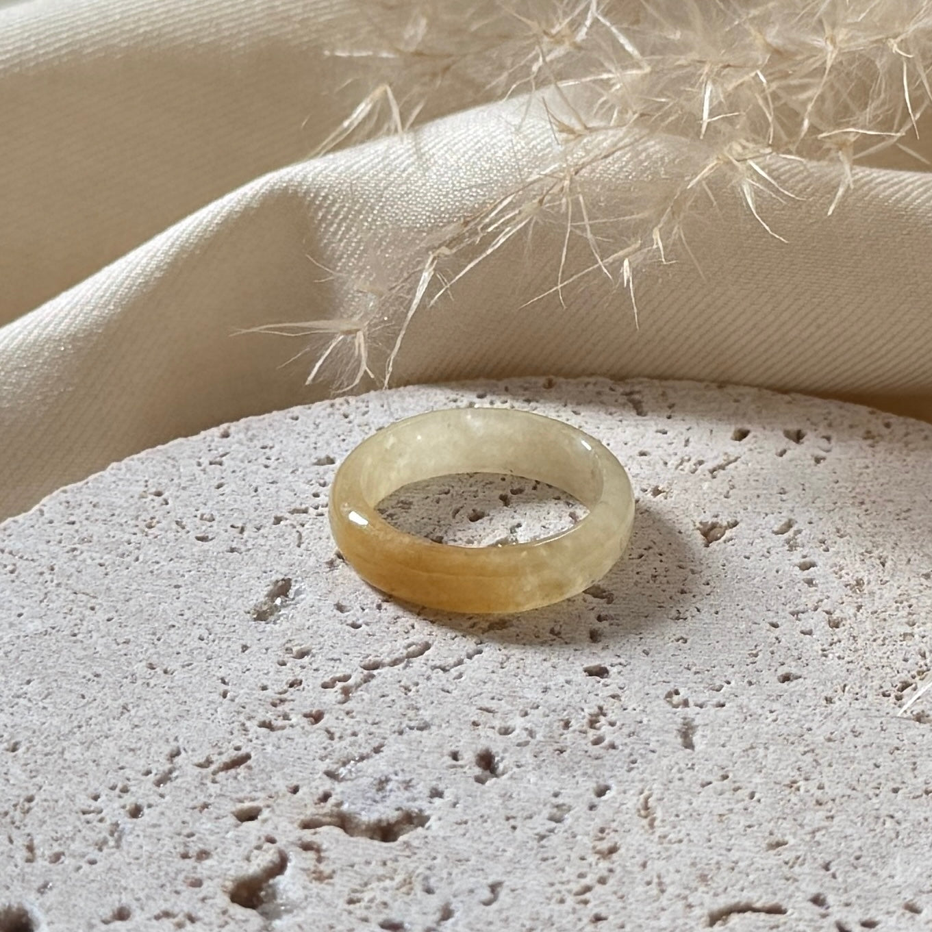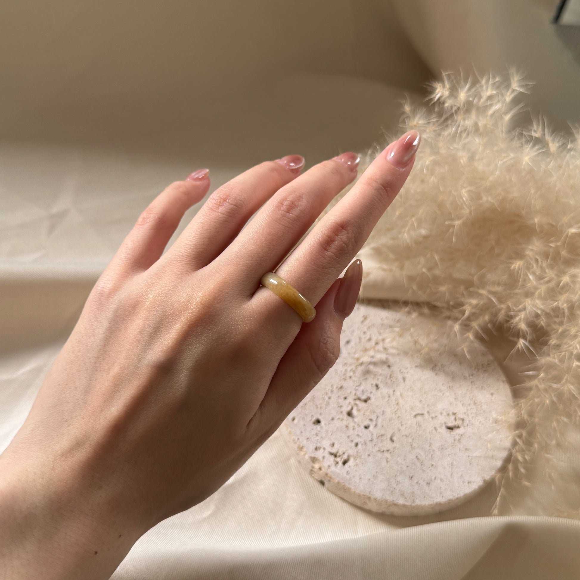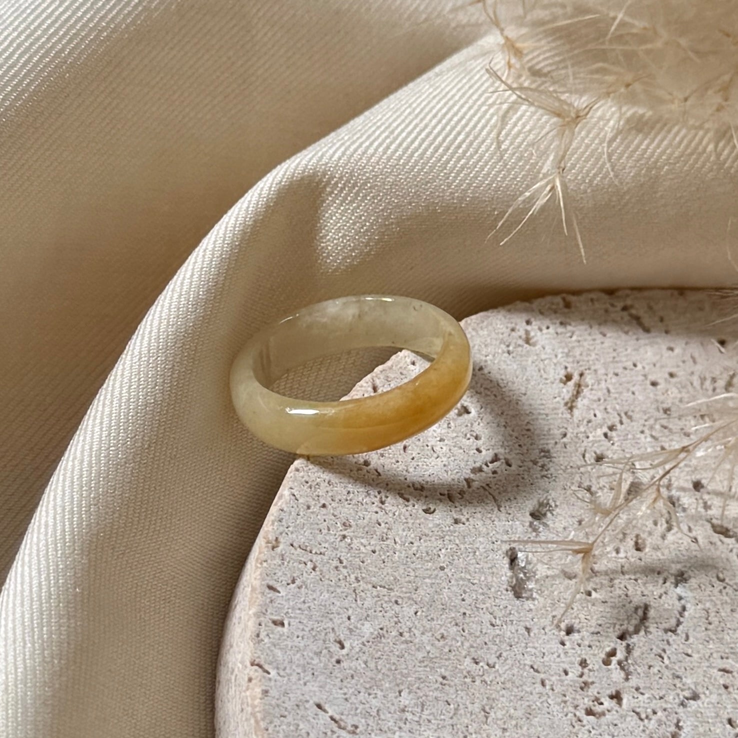 A warm-toned Myanmar jadeite ring in soft golden yellow with subtle natural marbling. Polished to a smooth, glossy finish, Honey has a classic domed silhouette that glows gently in the light. A charming piece that adds a touch of sunshine to any stack.