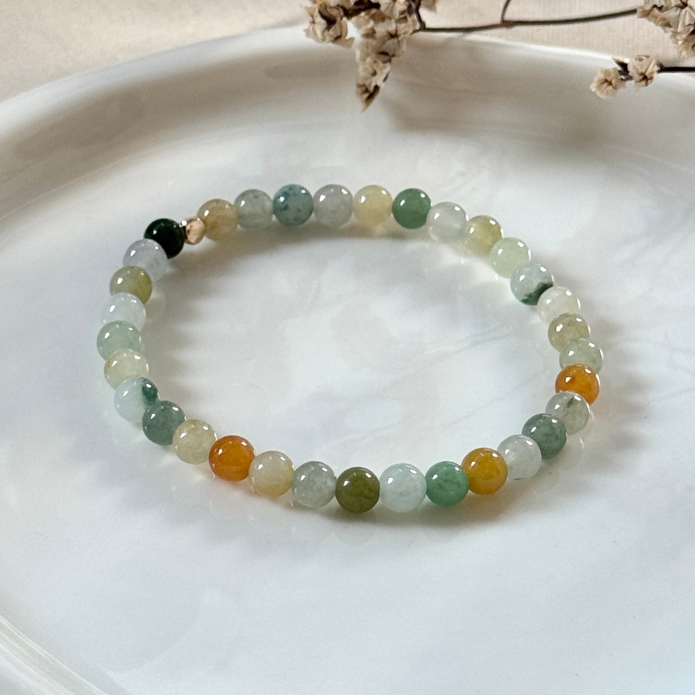 A cheerful medley of golden, green, and soft white jadeite beads that glisten like drops of honey in sunlight. Each bracelet carries a unique blend of tones- gentle, warm, and full of quiet joy. Honeydrop adds a sweet, earthy charm to any stack, the perfect piece for those who love natural colour play with a soft, indulgent glow.