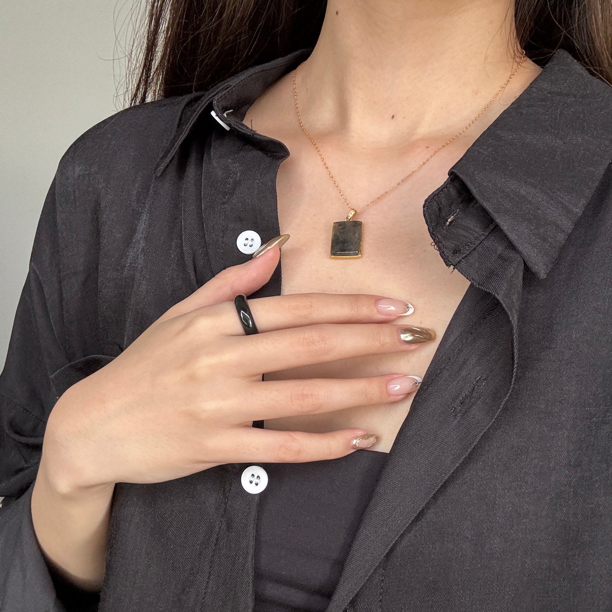 Discover the ethereal beauty of our Irisca Jadeite Necklace, a striking piece that embodies the elegance of jadeite. This pendant features a unique icy jadeite stone, showcasing captivating patterns that glow in the light. The refined rectangular shape is set in a sleek gold frame, enhancing its sophisticated appeal.