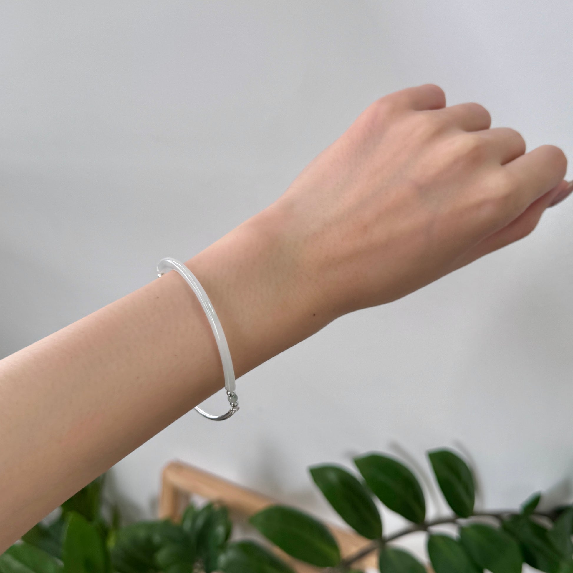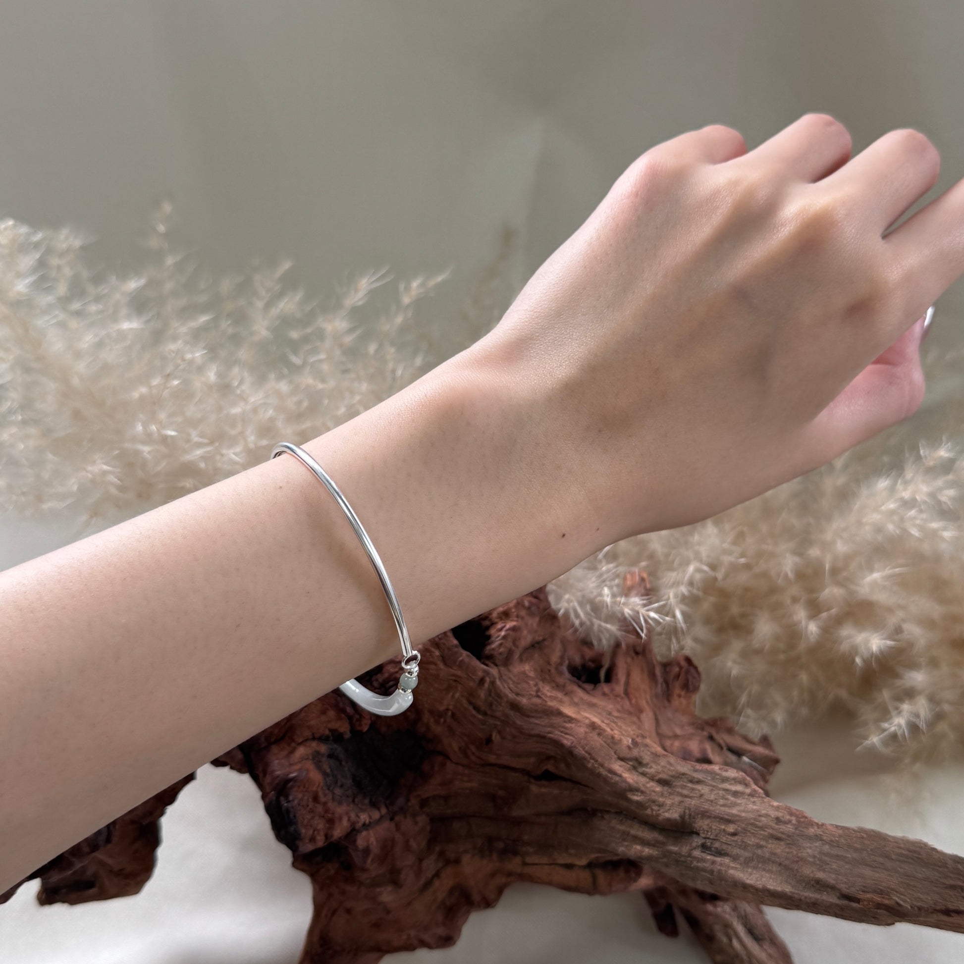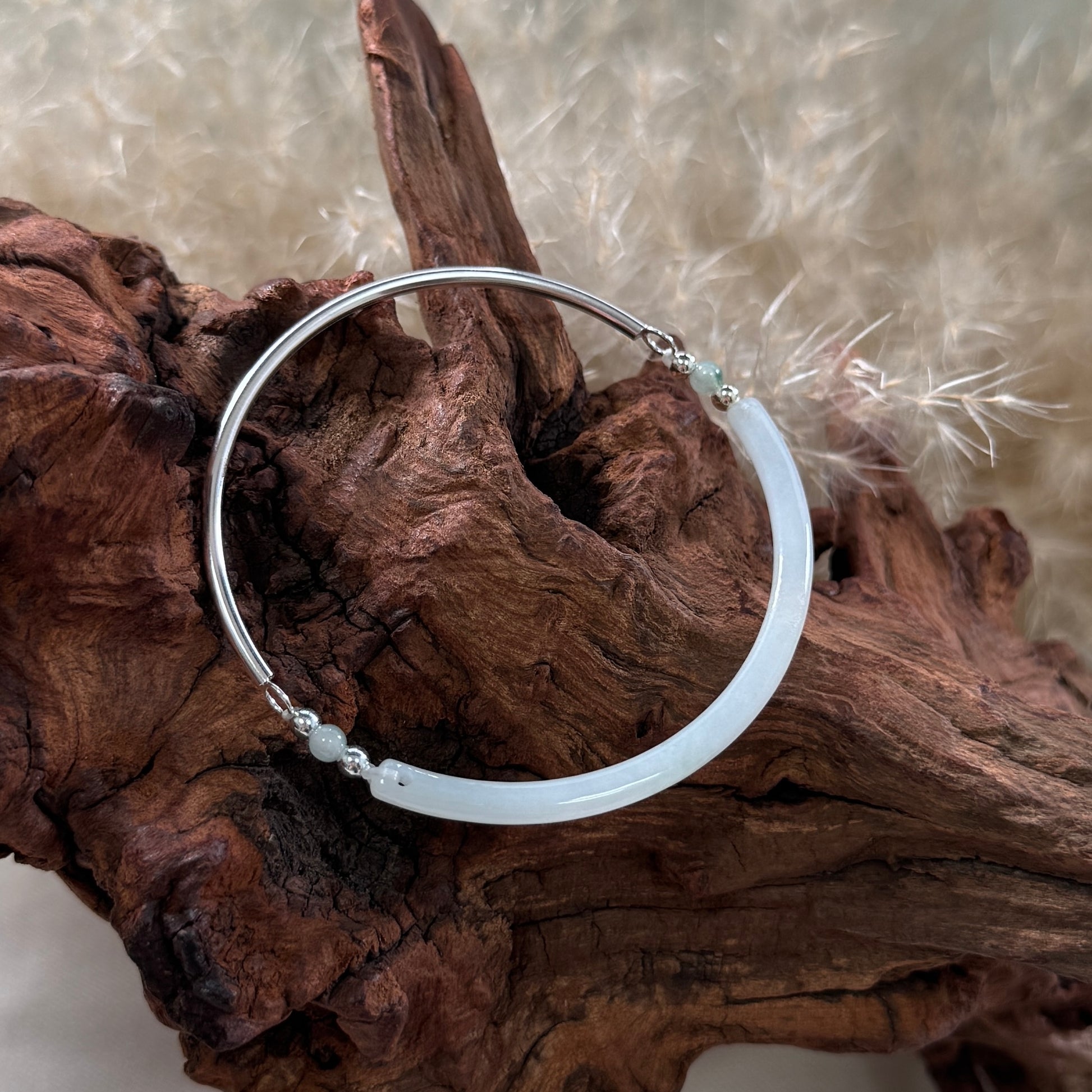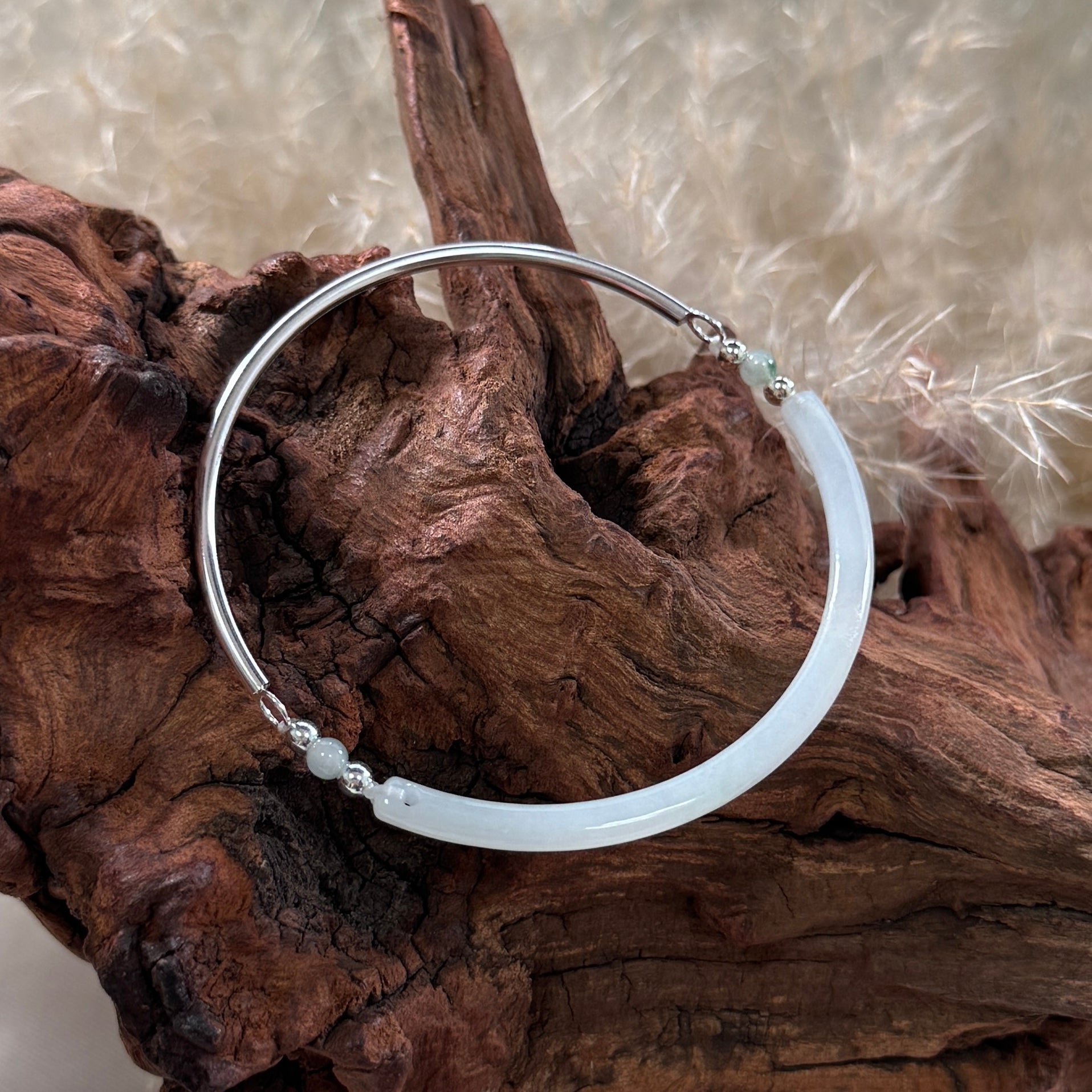 A slim silver bangle set with a smooth arc of translucent jadeite. The Jace Bangle offers a sleek, modern silhouette, pairing jadeite’s natural elegance with a contemporary edge.