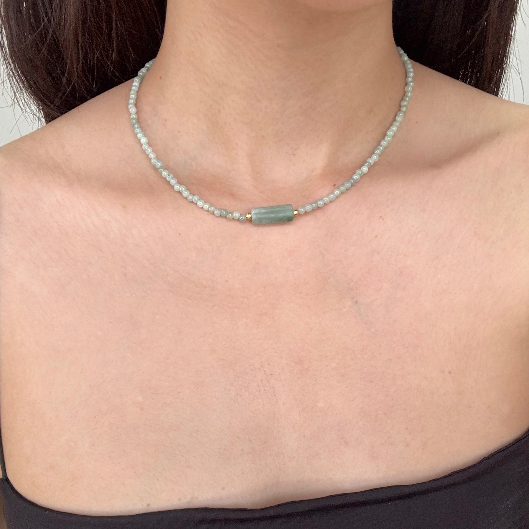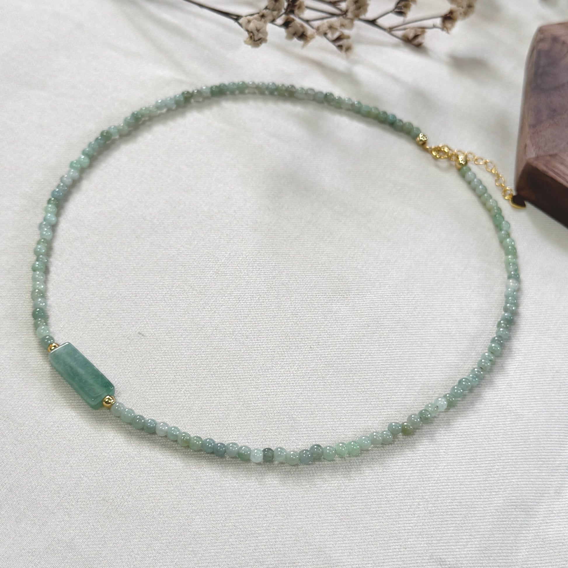 A one-of-a-kind necklace featuring fine jadeite beads accented with a single jadeite bar, finished with subtle gold details.
