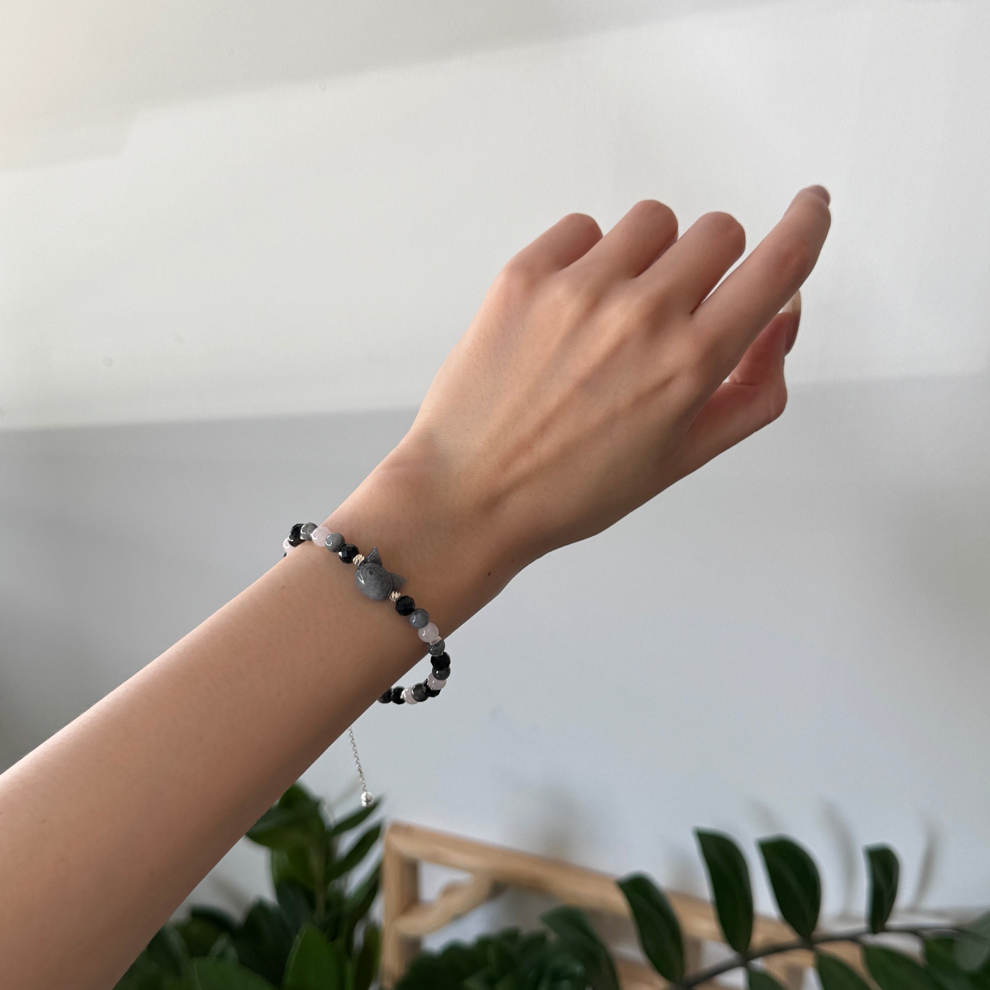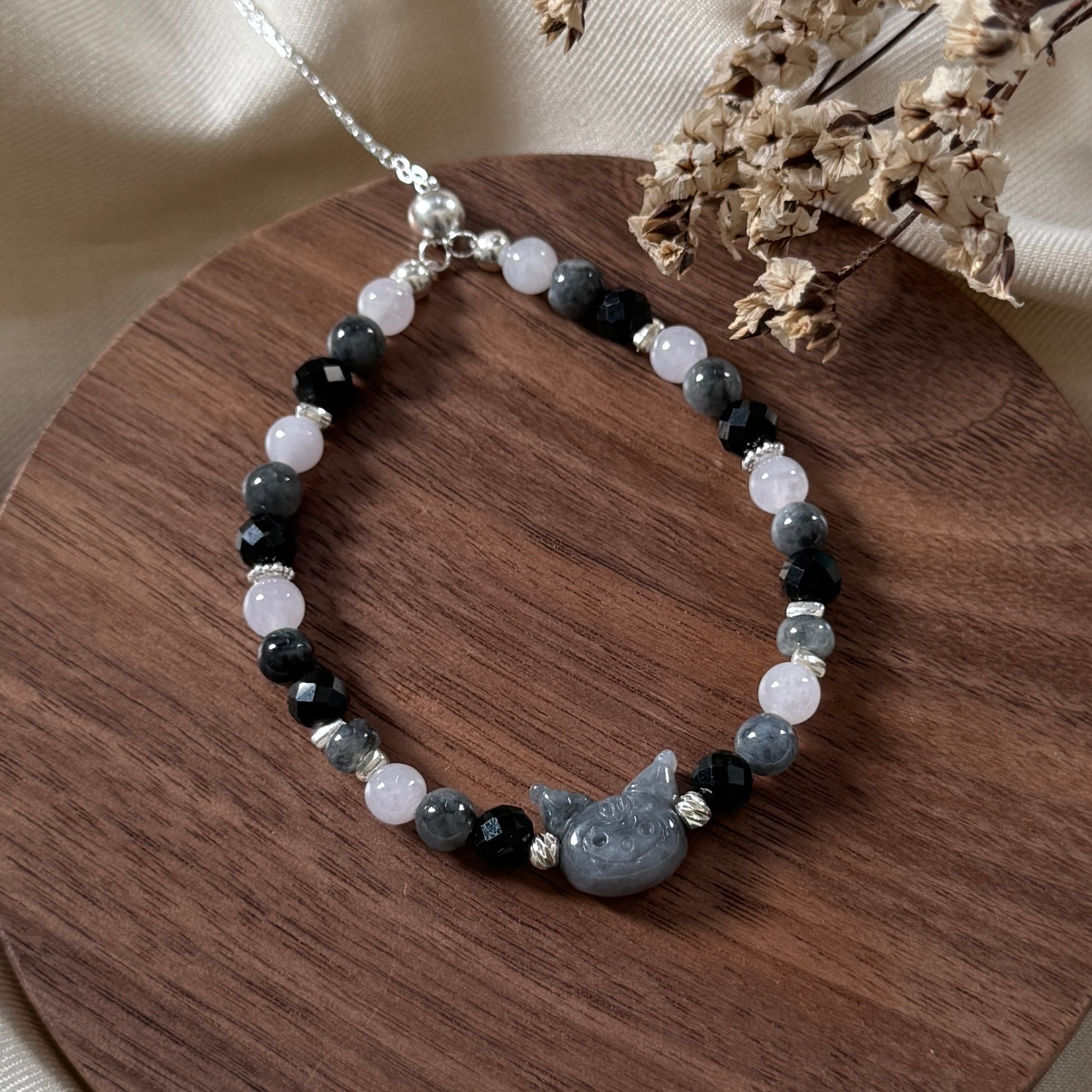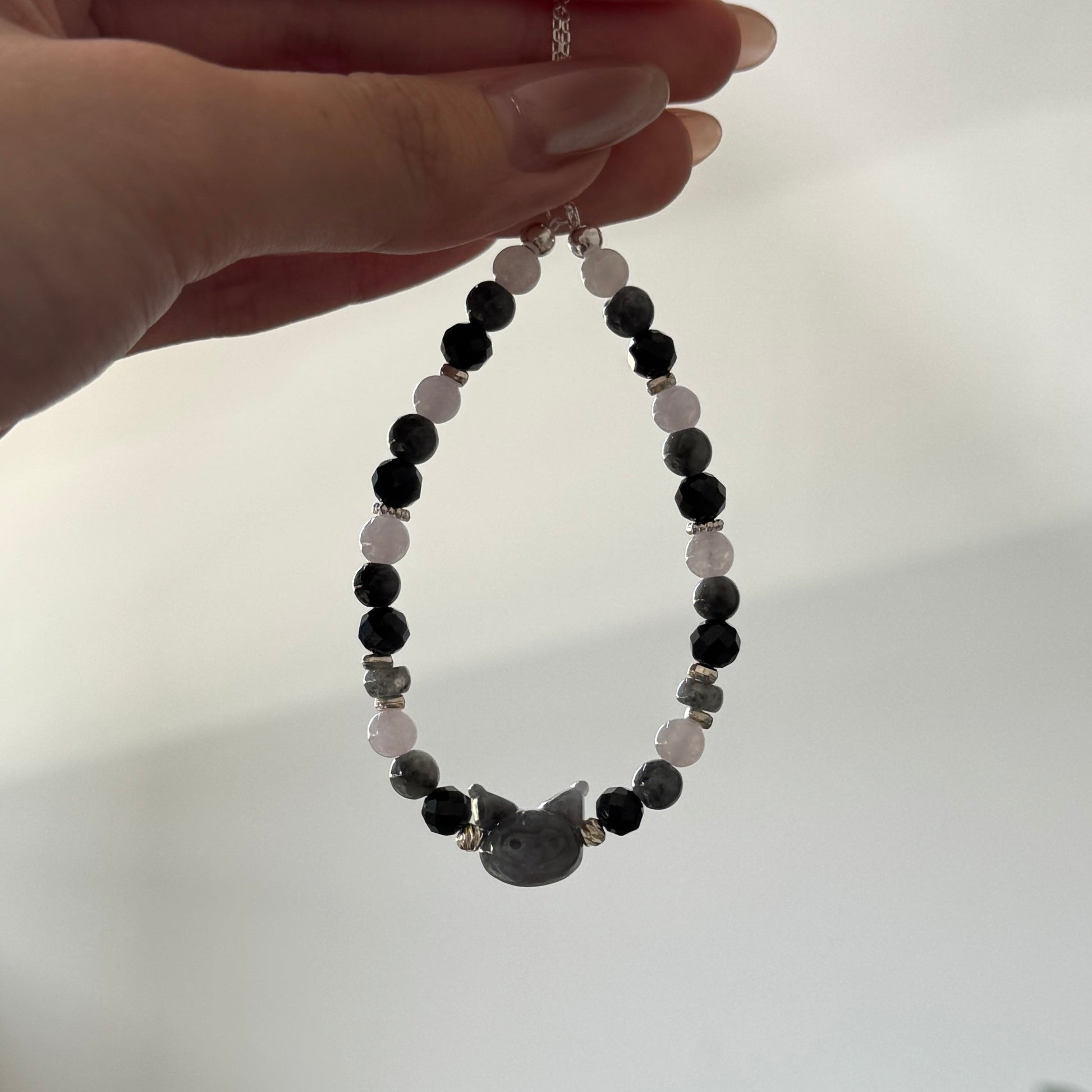 A playful twist on the Midnight Collection, the Kuromi Bracelet features a hand-carved Wuji jadeite charm surrounded by faceted onyx, smoky grey jade, and soft pink tones. Equal parts cute and cool, this piece balances sweet energy with a hint of attitude.