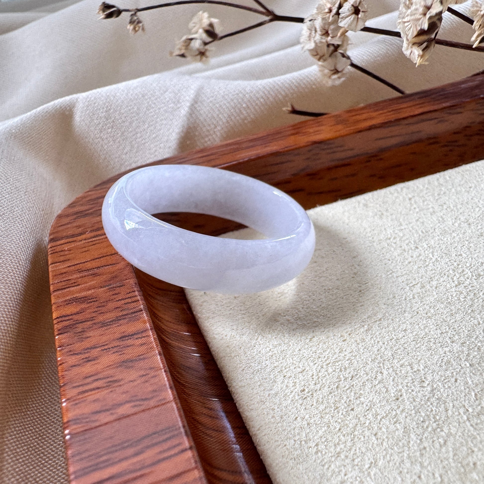 Carved from a single piece of Grade A jadeite, this ring showcases a soft, dreamy lavender hue. Its smooth, rounded band offers a modern silhouette with a timeless spirit — a quiet statement of clarity, grace, and inner calm.