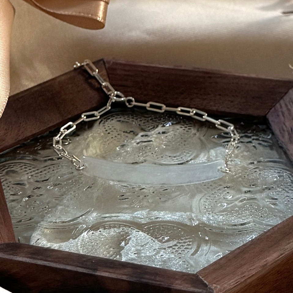 Minimalistic yet graceful, the Lili Jadeite Bracelet is a perfect expression of modern elegance. Featuring a sleek jadeite bar set against a refined 925 silver chain with paperclip-style links, this piece offers a subtle blend of sophistication and simplicity. Its lightweight design makes it ideal for everyday wear, while the translucent jade adds a gentle, luminous touch. Lili is the epitome of quiet luxury, perfect for those who appreciate understated beauty.