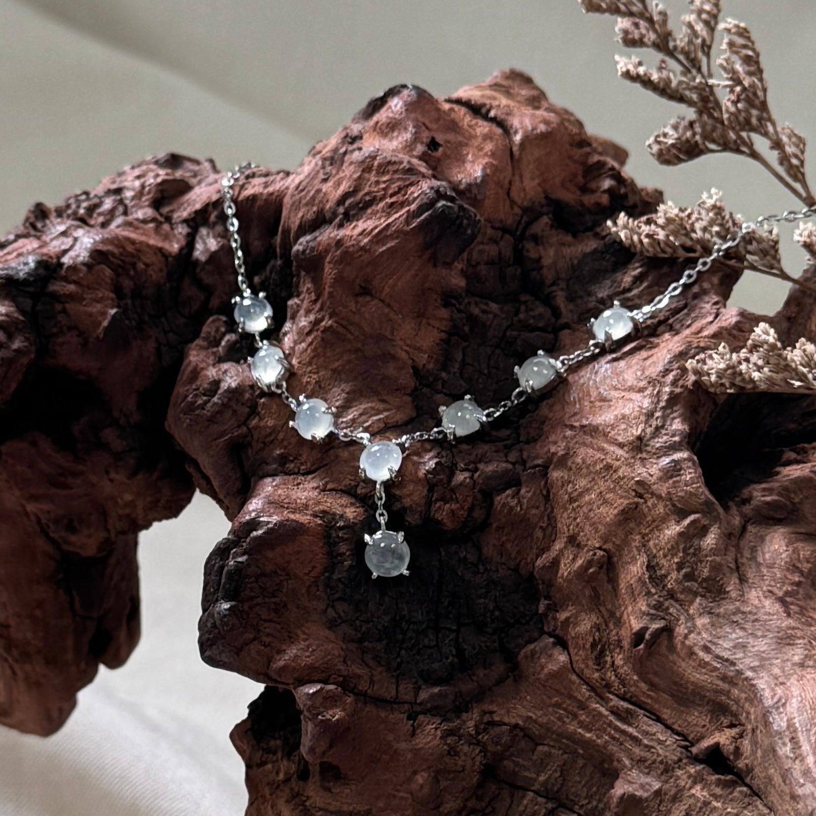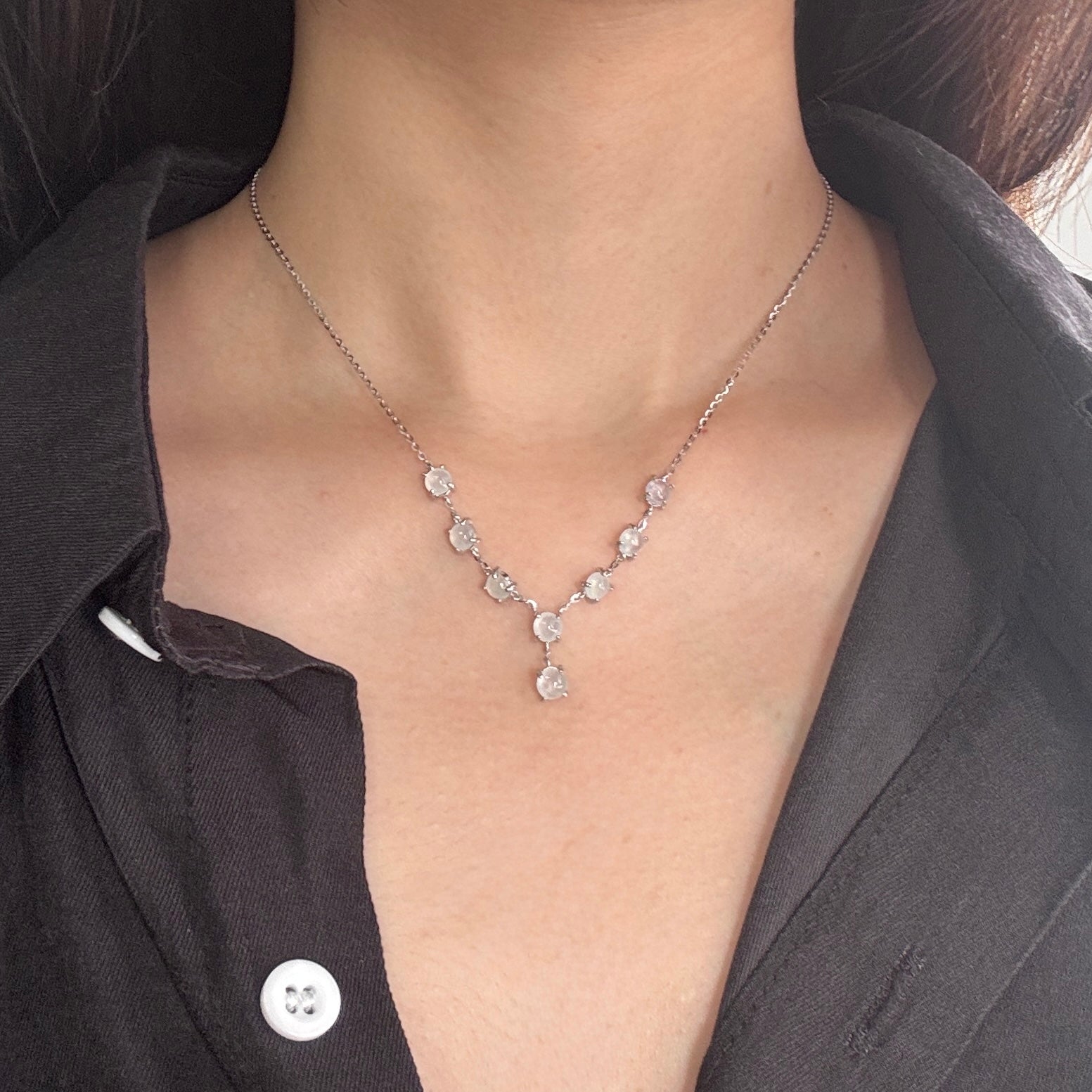 A refined arrangement of glowy, icy gems set in a fluid Y-shaped silhouette, the Lucent Necklace catches the light with every movement. Delicate yet defined, it adds quiet elegance to any neckline — perfect for day-to-night transitions or layering with intention.