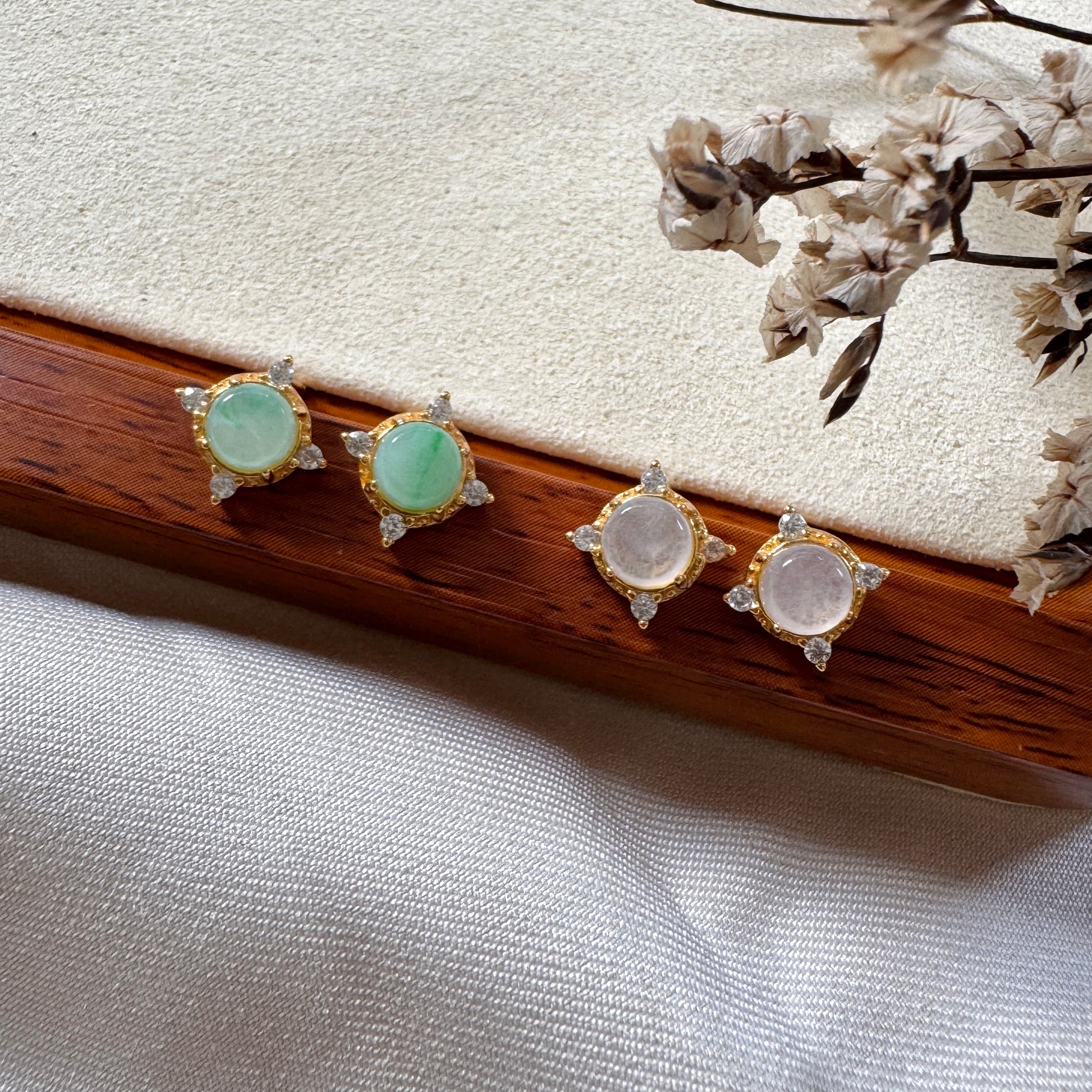 Radiant and refined, the Lucine Earstuds feature luminous round jadeite cabochons — available in soft icy white or glowing green — framed by a gold setting and accented with twinkling zircon stars. Named after the moonlight, Lucine captures quiet elegance and celestial charm in a delicate silhouette that shines effortlessly day or night.