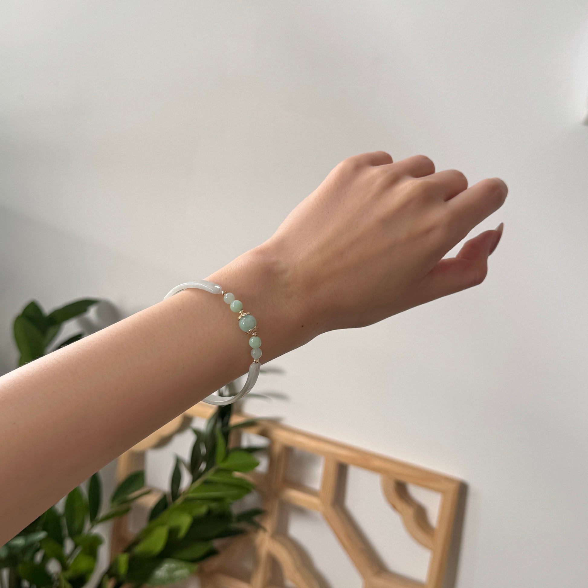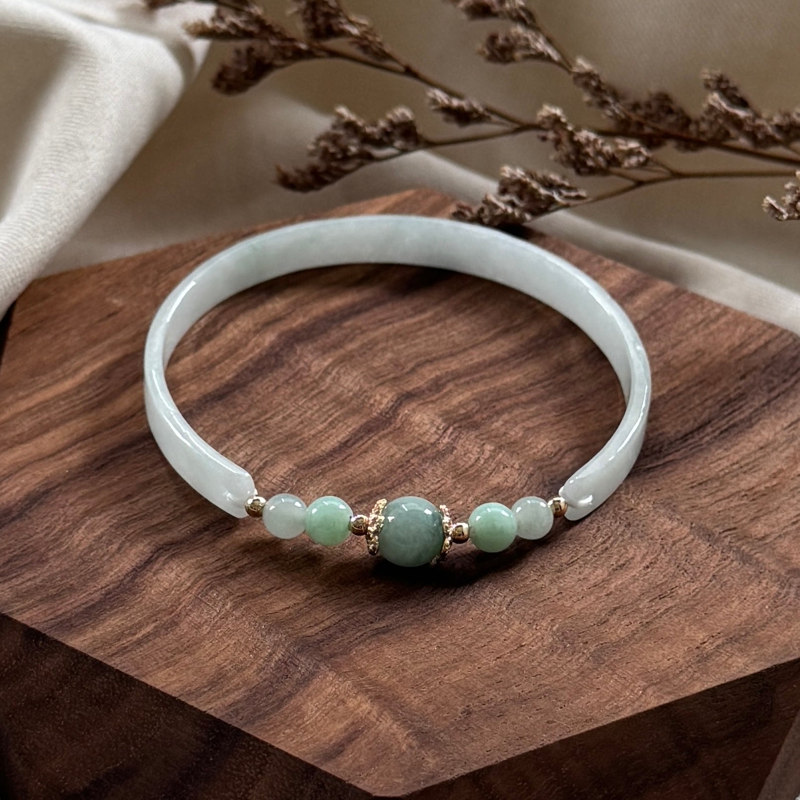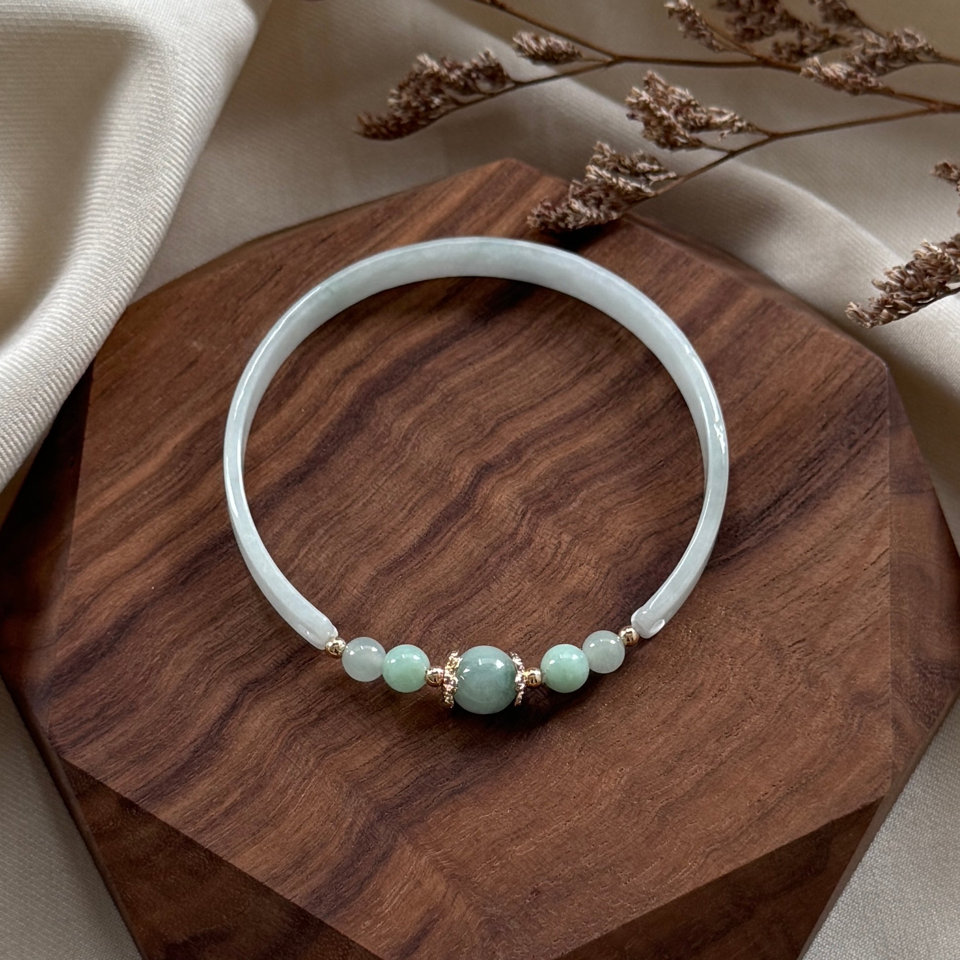 With a centre that draws the eye and soothes the soul, Lüxin (绿心) — meaning Green Heart — is crafted to embody the quiet strength and prosperity of green jadeite. The bangle features a half-round jadeite arc, seamlessly joined with jadeite beads and a striking central orb framed in gold.
