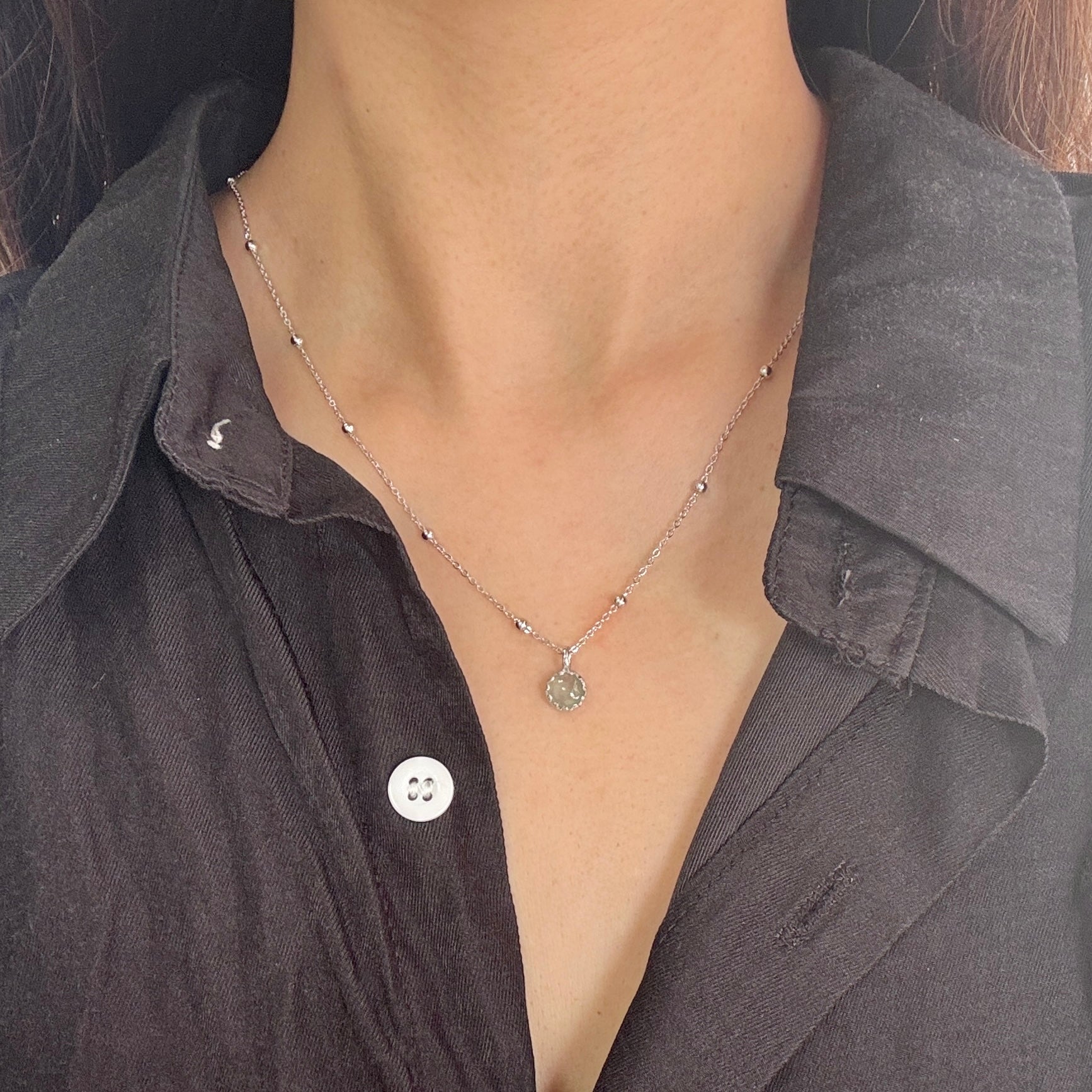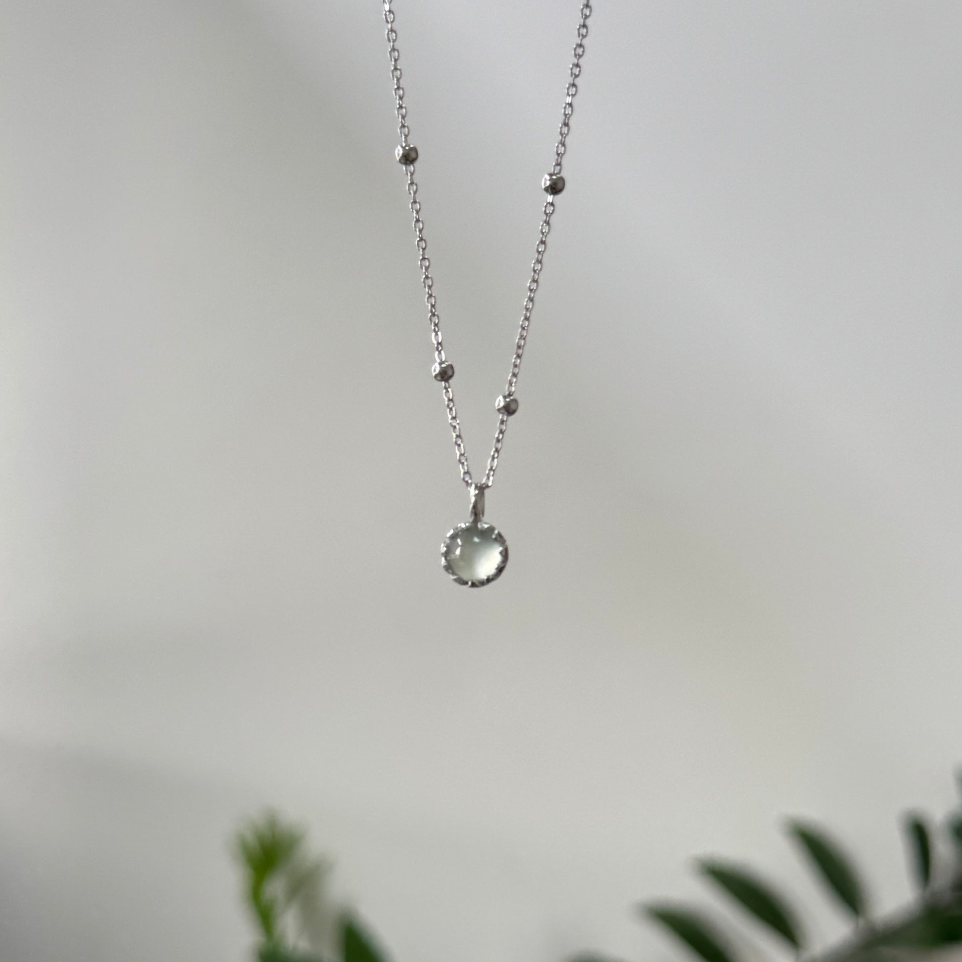 A soft touch of serenity. The Lyn Necklace features a delicate jadeite cabochon set in sterling silver, paired with a fine bead chain for subtle texture.
