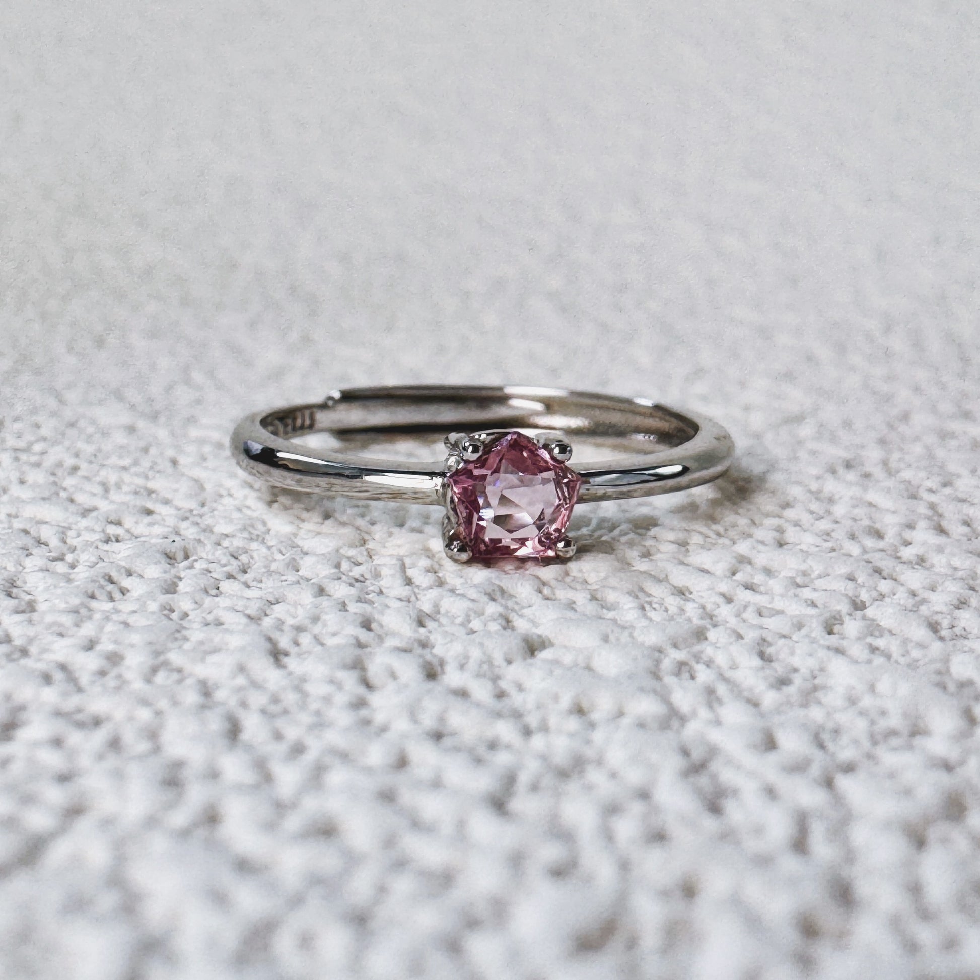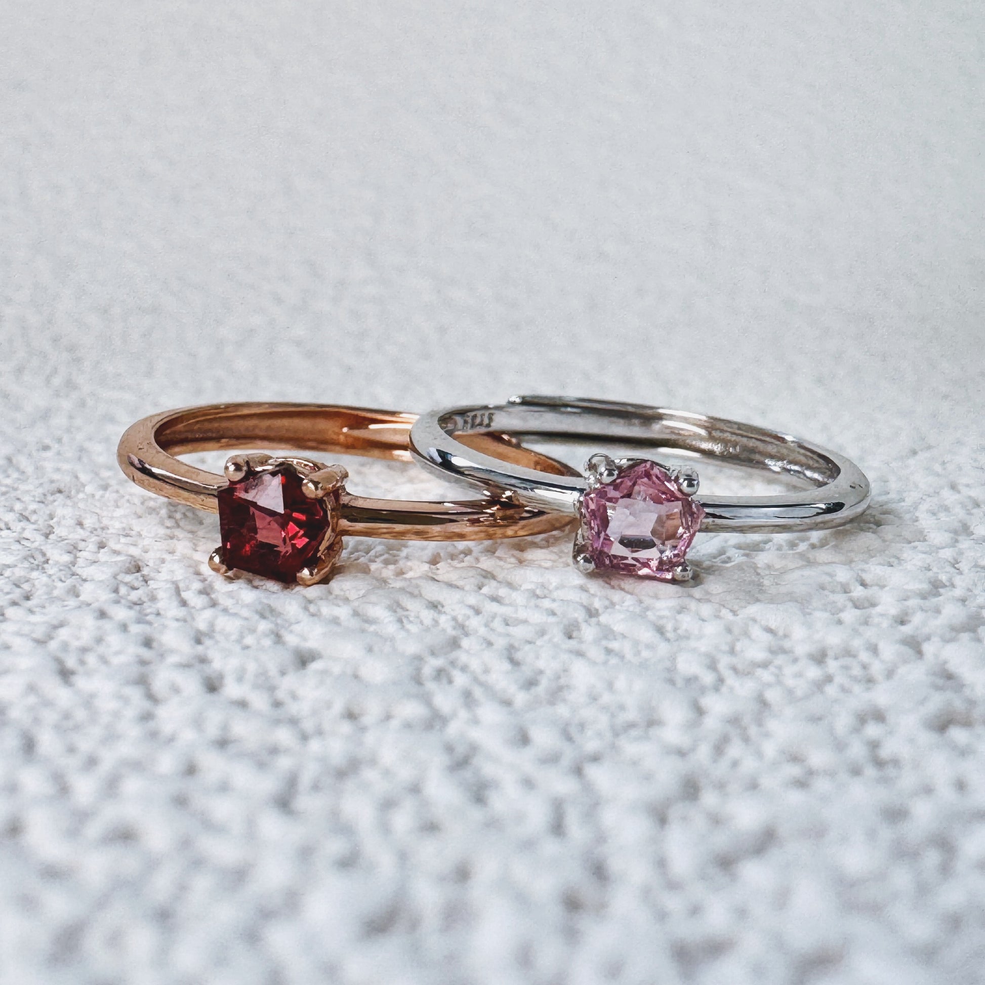 The Lyra Spinel Ring is a captivating blend of modern design and timeless allure. Featuring a unique hexagon-cut spinel, available in rich red or delicate blush pink, this ring is designed to make a statement. The gemstone's clean lines and vivid color are beautifully complemented by a choice of a warm rose gold or sleek sterling silver band, creating a harmonious balance between contemporary style and classic elegance.