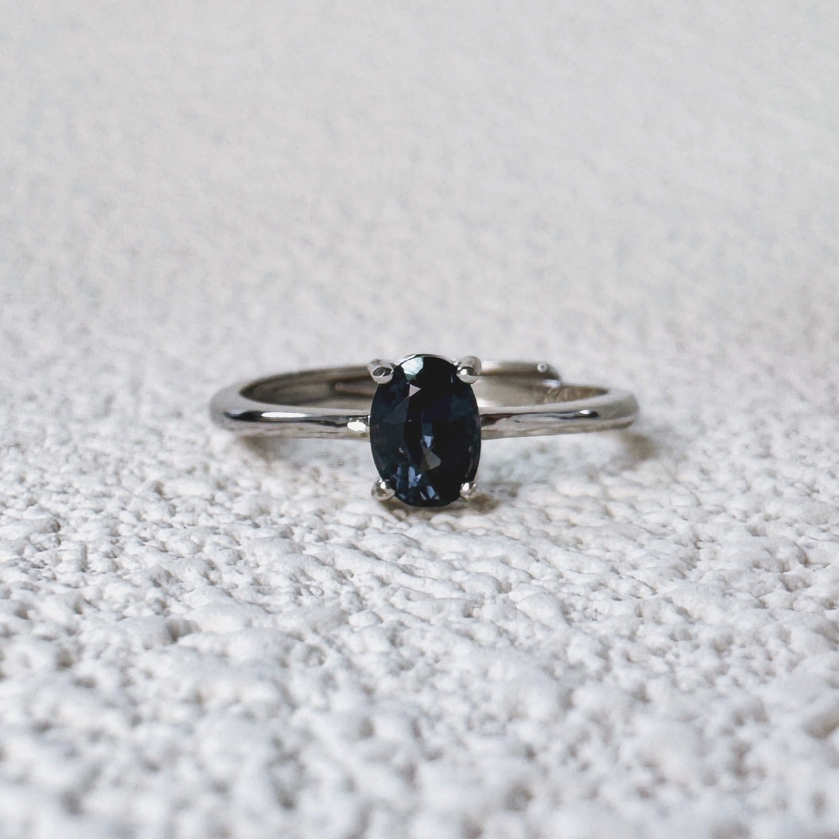 The Midnight Eclipse Spinel Ring is a striking piece that captures the mystery and allure of the night. Featuring a deep, inky-blue oval-cut spinel, this ring is reminiscent of a moonlit sky, with a gemstone that shimmers with subtle flashes of light. Set in a sleek and polished sterling silver band, the design is minimalist, allowing the rich depth of the spinel to take center stage.