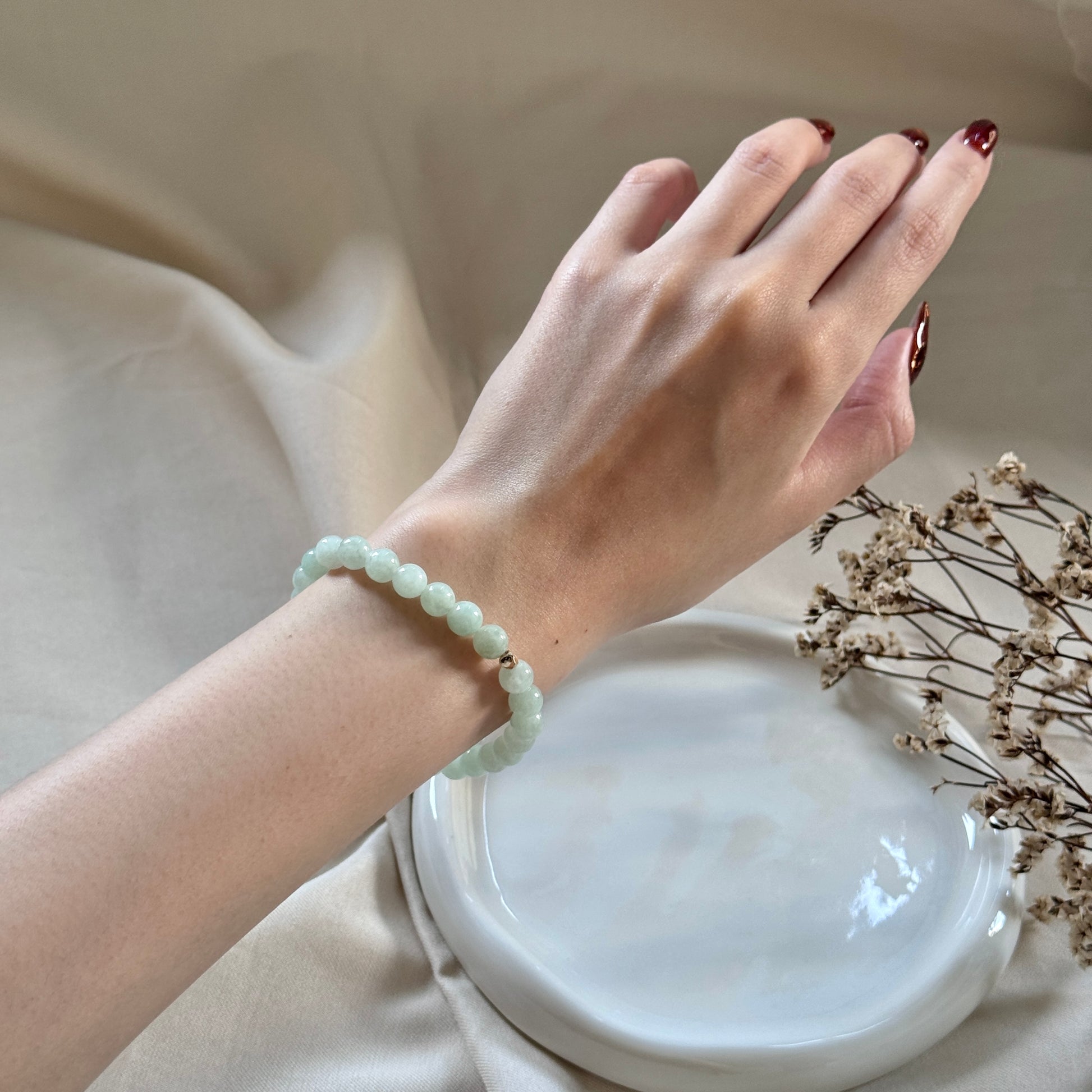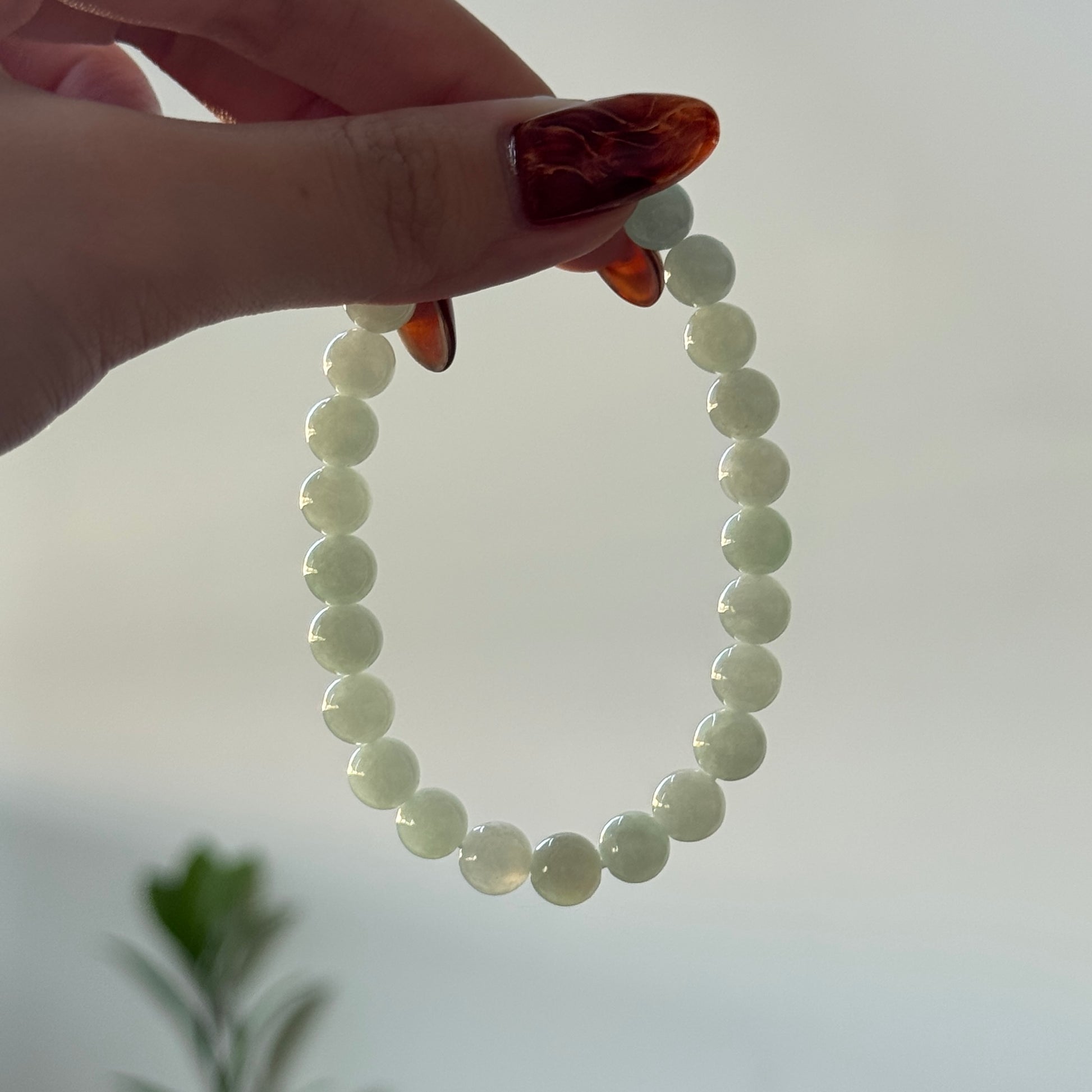 A refreshing strand of pastel jadeite beads in the softest mint hue. Smooth, luminous, and calming to the eye, Mint adds a touch of quiet elegance to any wrist stack. Its gentle translucence catches the light with every movement.