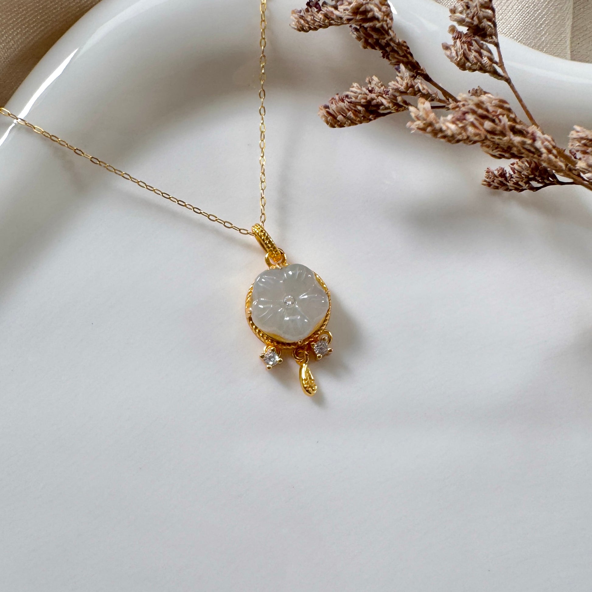 Delicate and full of quiet wonder, the Mira necklace features a hand-carved floral jadeite charm framed in gold, accented with a gentle drop and twin sparkling stones. The name Mira means “wonder” and “peace” across many languages—capturing the spirit of this graceful piece.