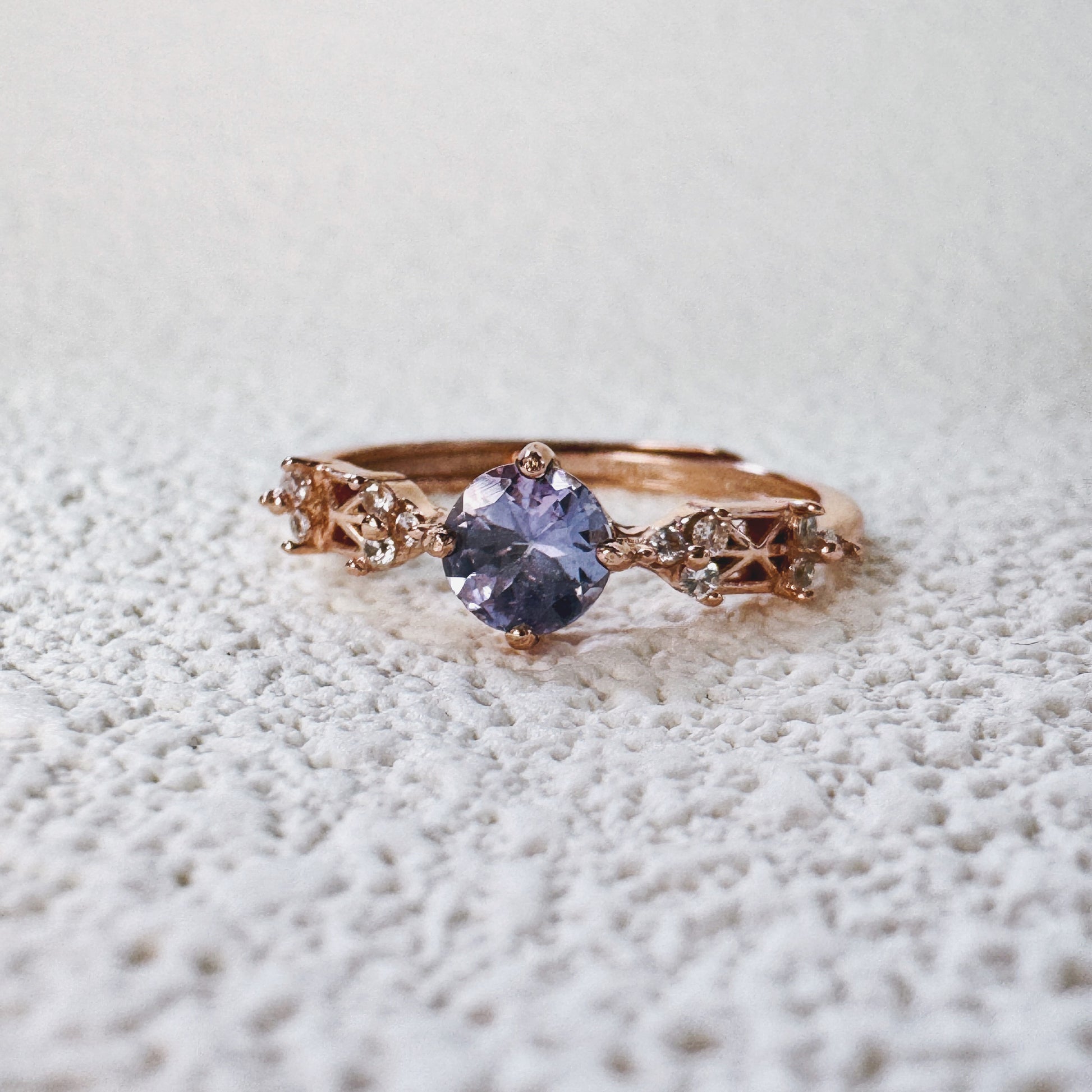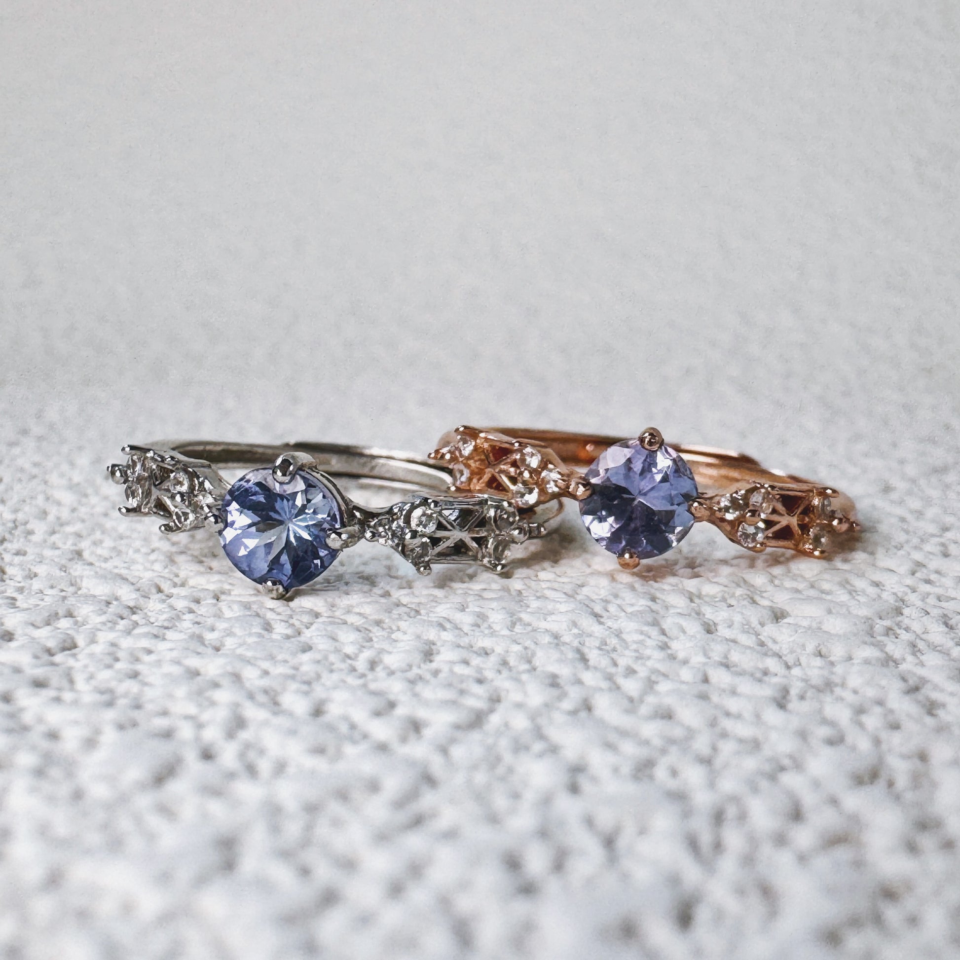 Featuring a captivating round-cut tanzanite gemstone, its violet-blue hues shimmer like twilight skies. Set against a backdrop of intricately crafted filigree details in your choice of sterling silver or rose gold, this ring exudes both modern sophistication and timeless grace. Accentuated by sparkling accent stones, the Mirage Tanzanite Ring is a perfect symbol of refined luxury, making it ideal for both everyday wear and special occasions.