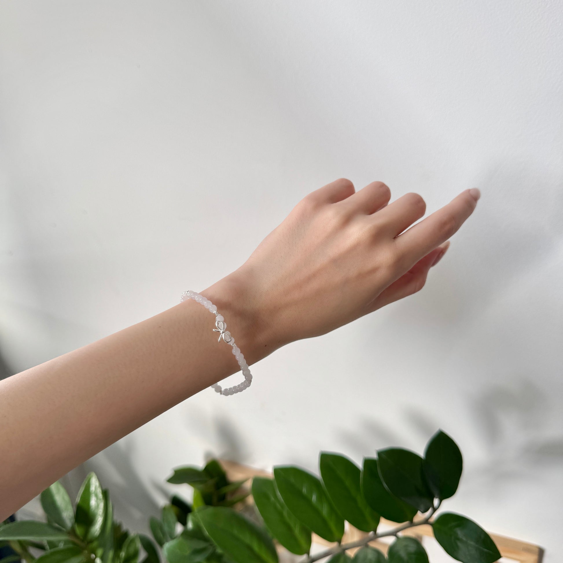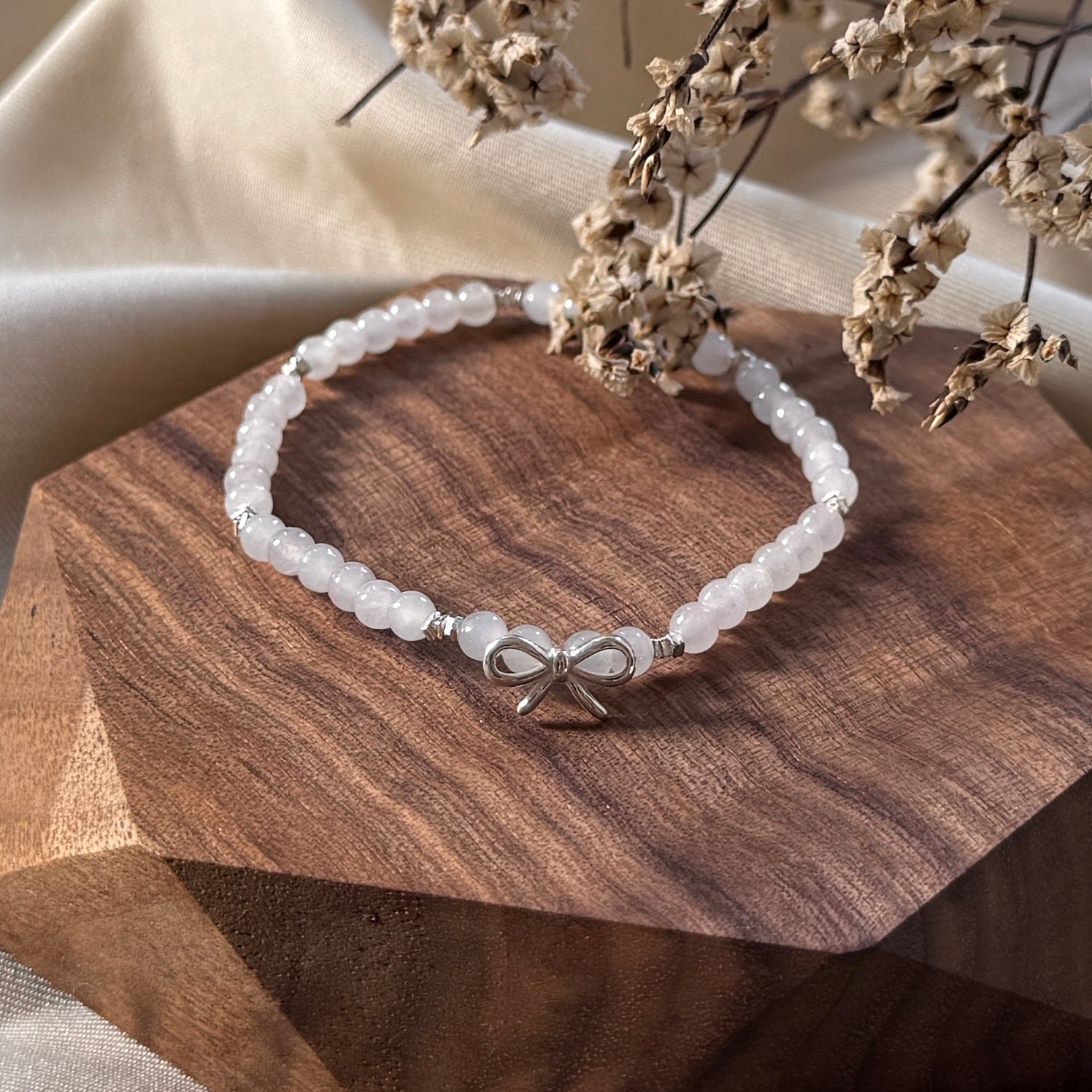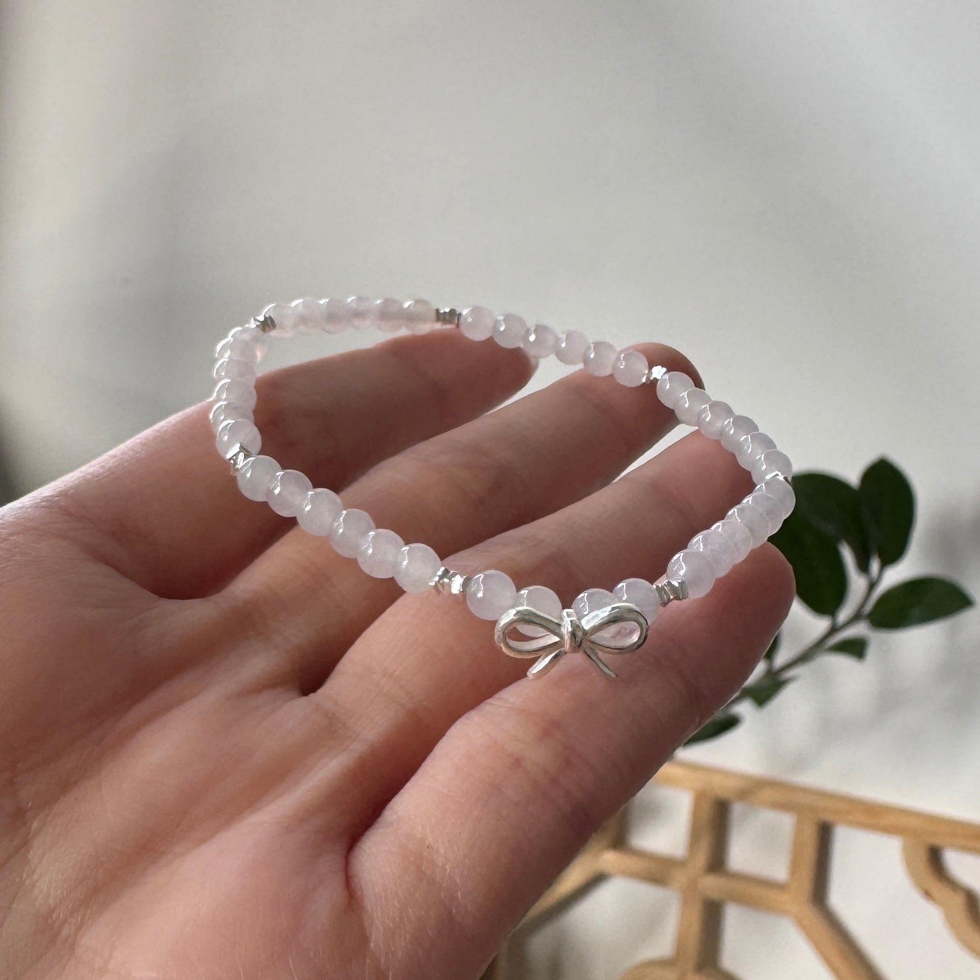 The Mirielle Bracelet features soft, rounded white jadeite beads paired with a silver bow charm — a graceful centrepiece that adds a touch of sweetness to a minimalist silhouette. Hand-strung with stretch cord and finished with silver-toned spacers, it’s designed for both comfort and quiet charm.
