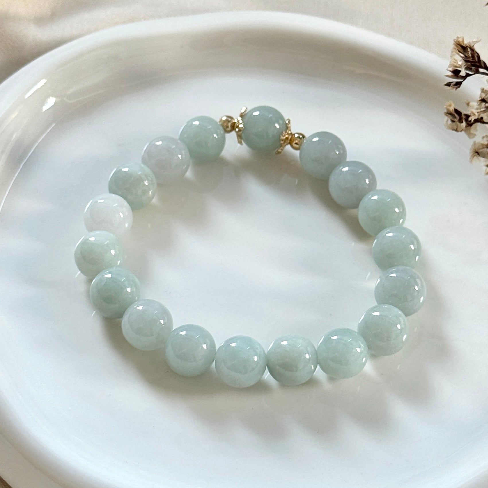 Smooth, milky-green jadeite beads accented with warm gold details. A timeless treat in the softest shade of green.